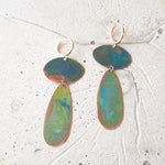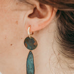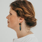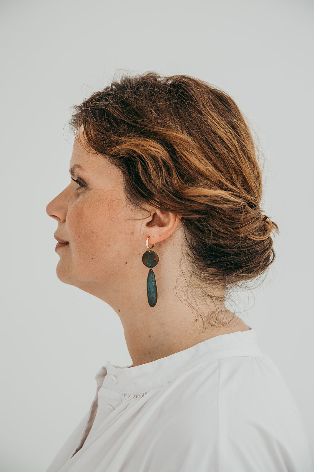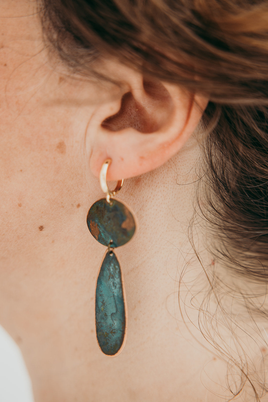 Brincos compridos, recortados à mão e oxidados, com argola fechada com banho de ouro