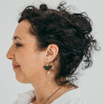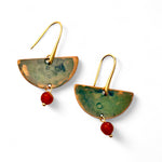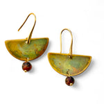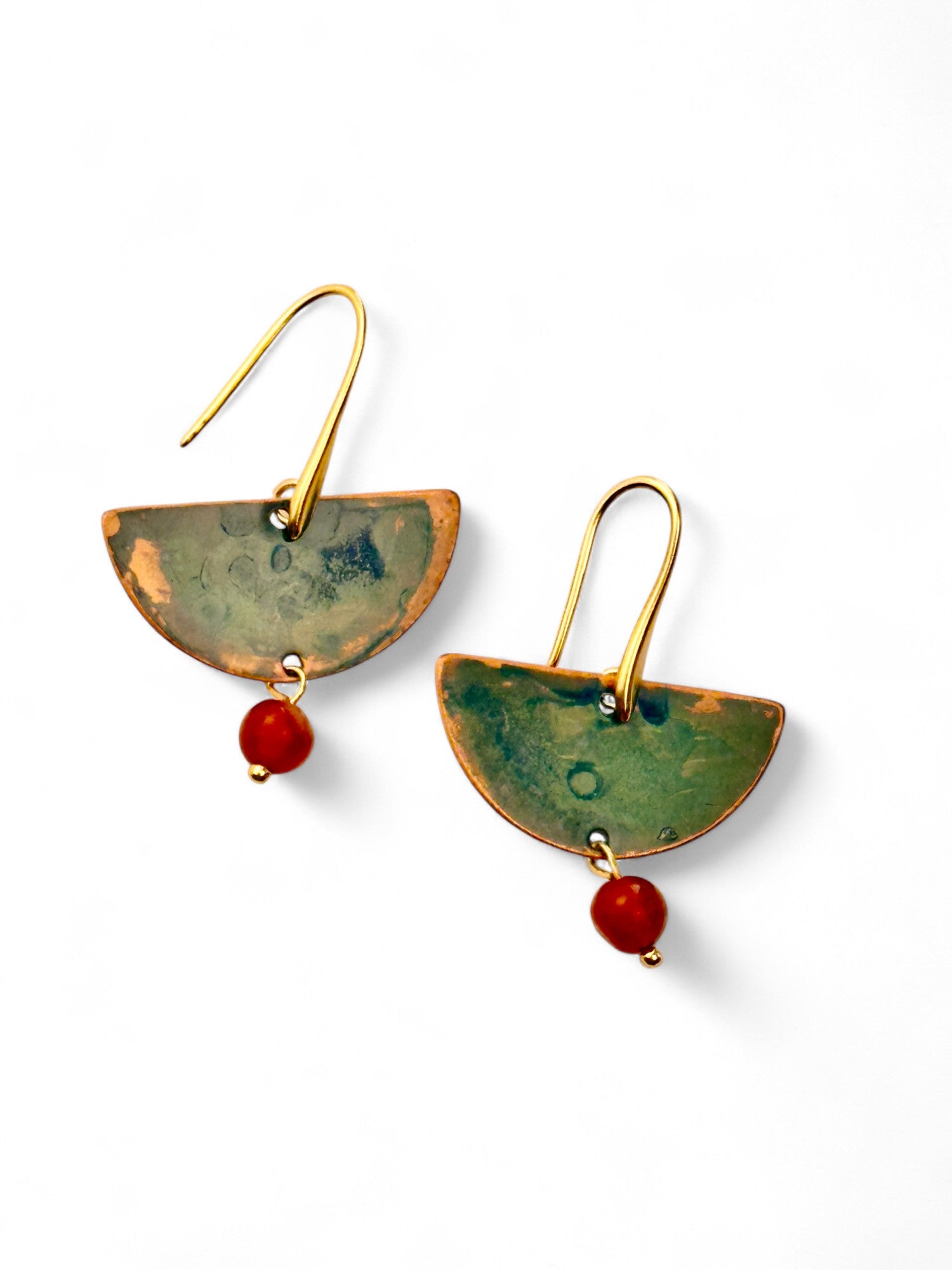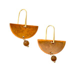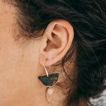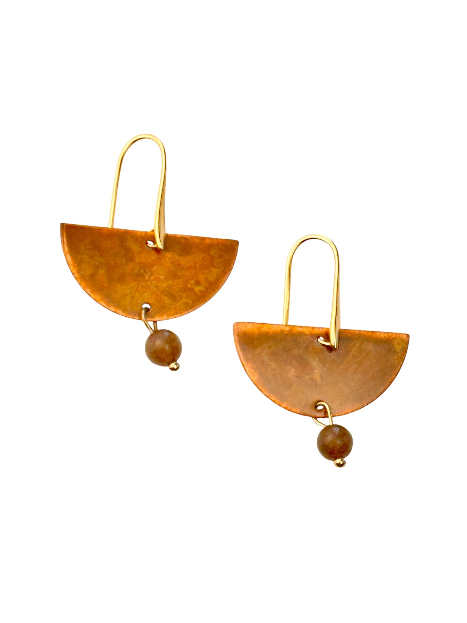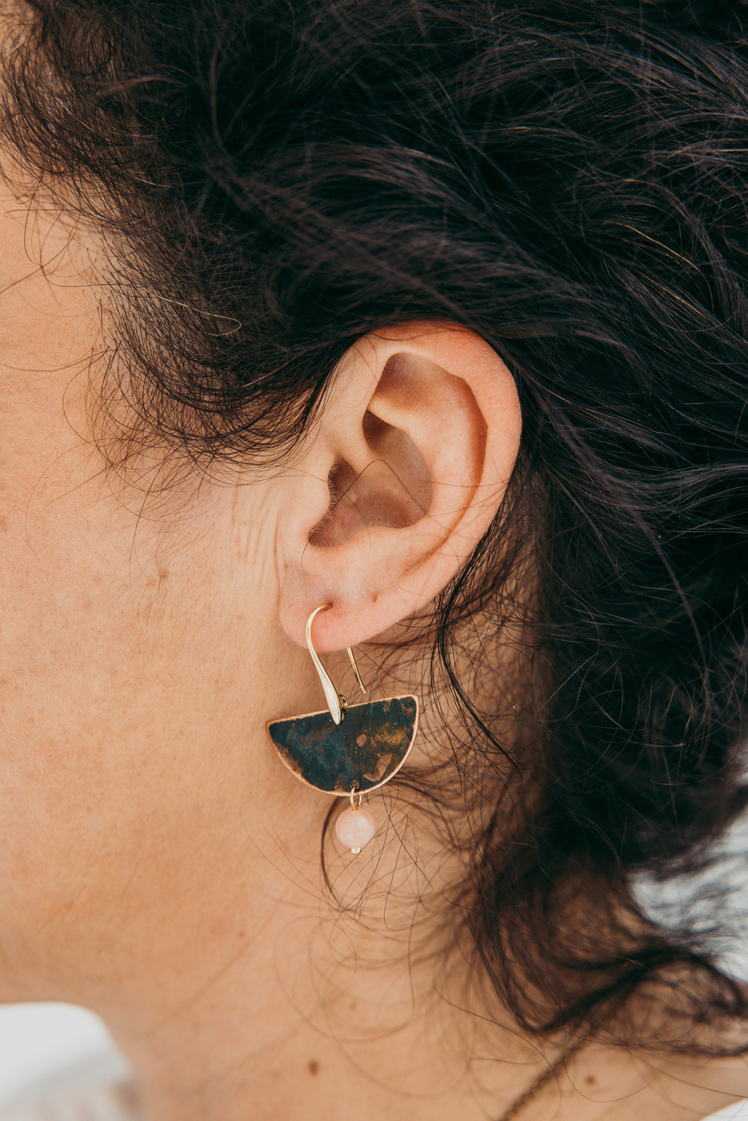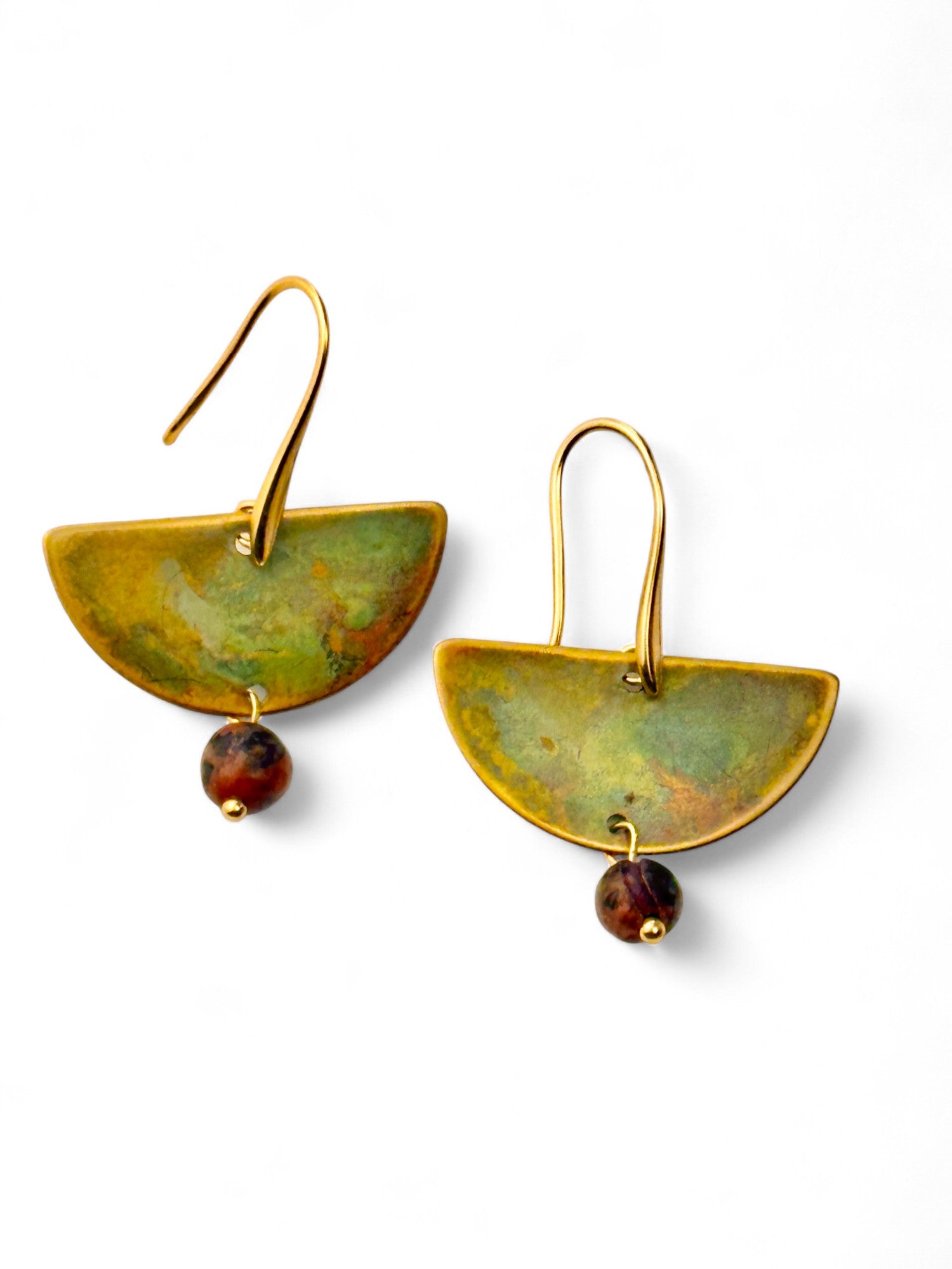 Brincos que desafiam o equilíbrio, com pedra natural, oxidados, com gancho aberto com banho de ouro