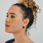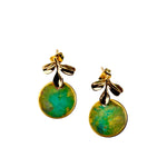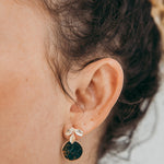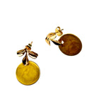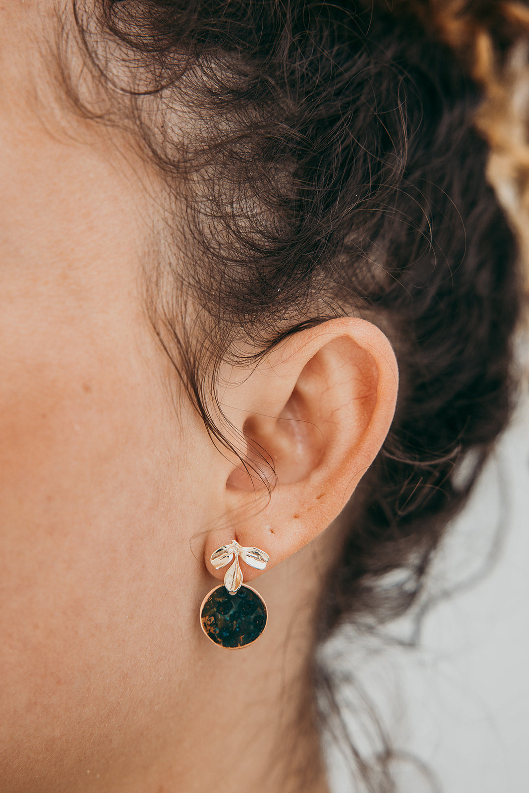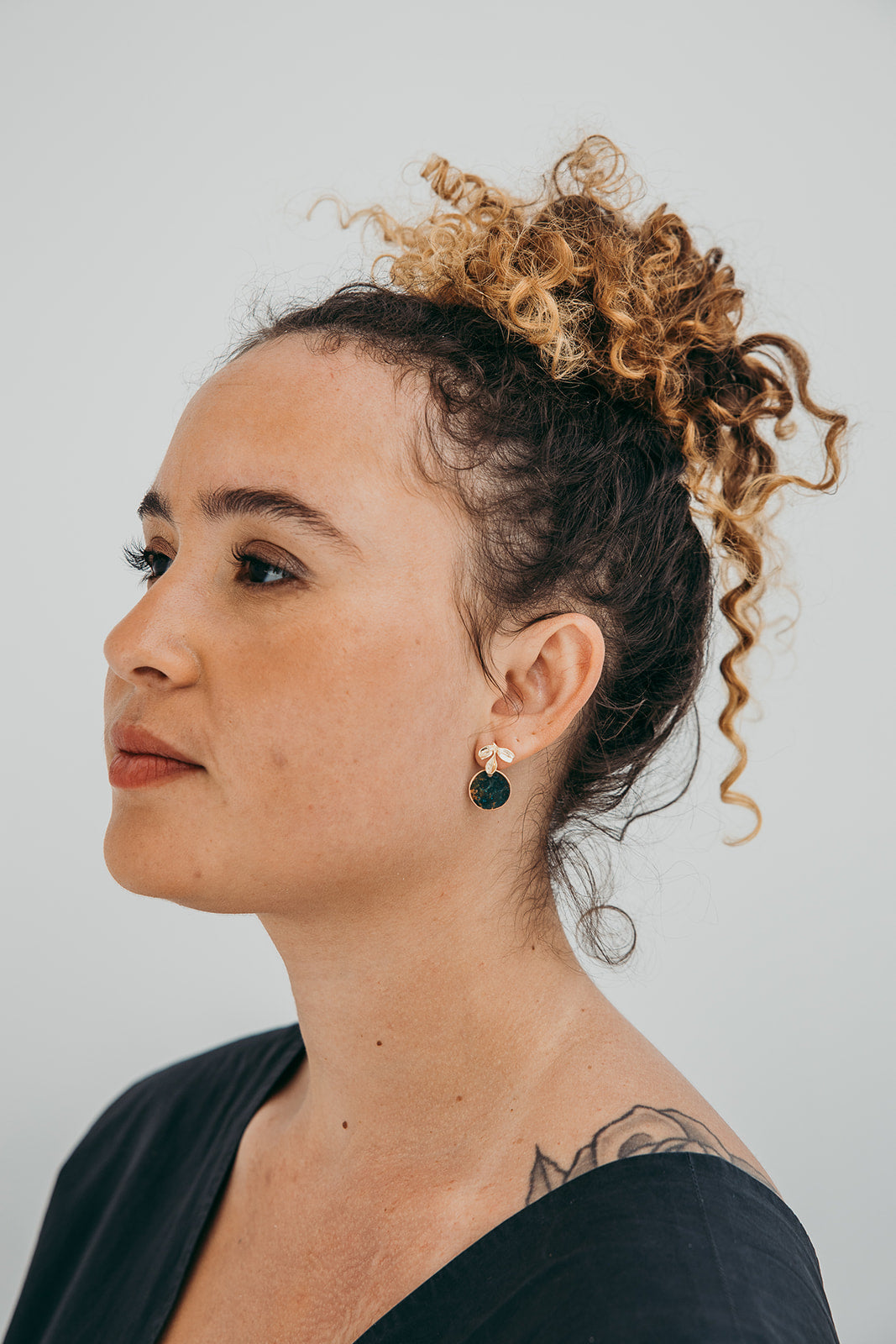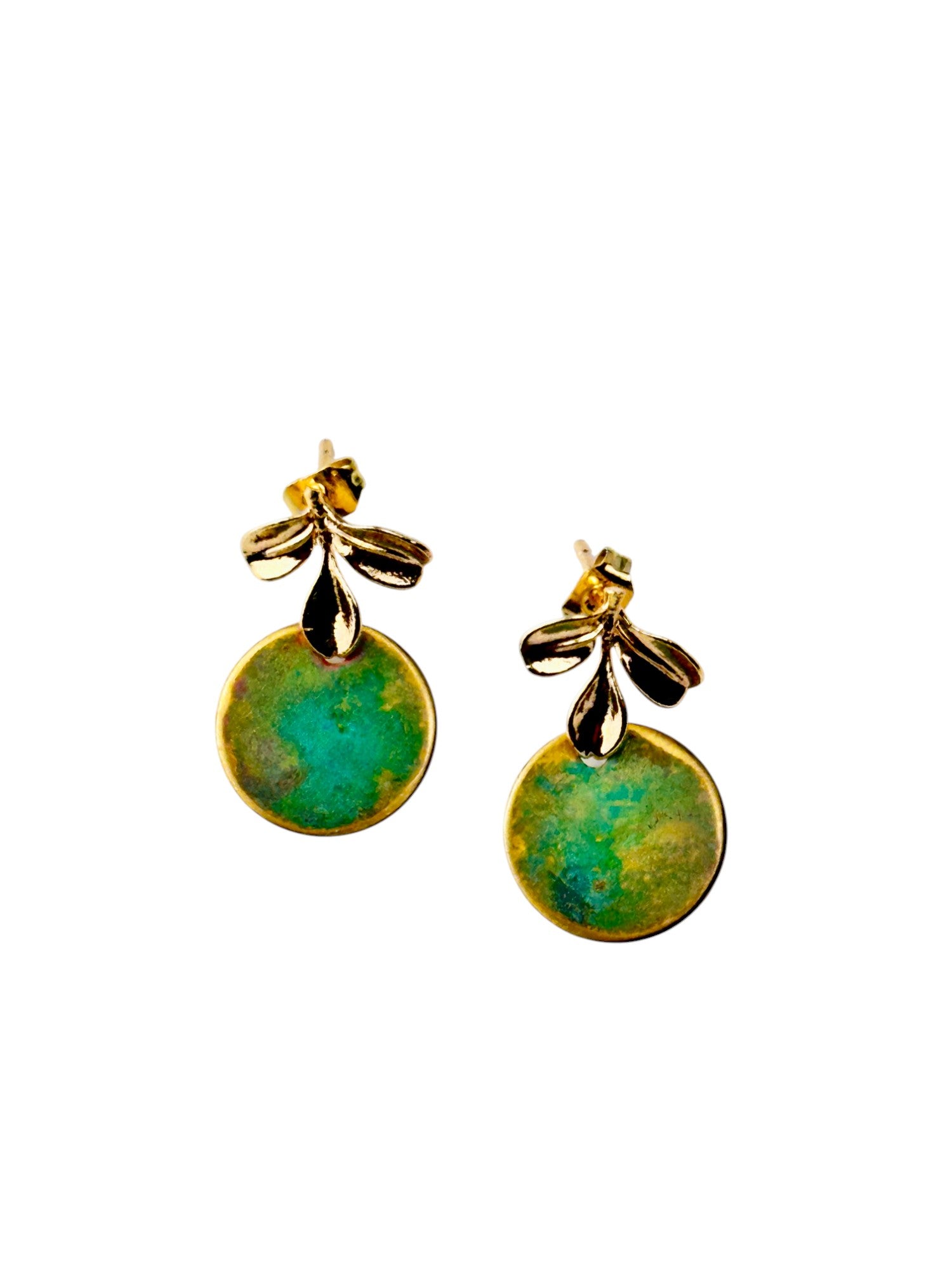Brincos Hoiko Basic, com discos oxidados. Stud flor com banho de ouro.