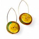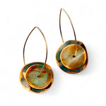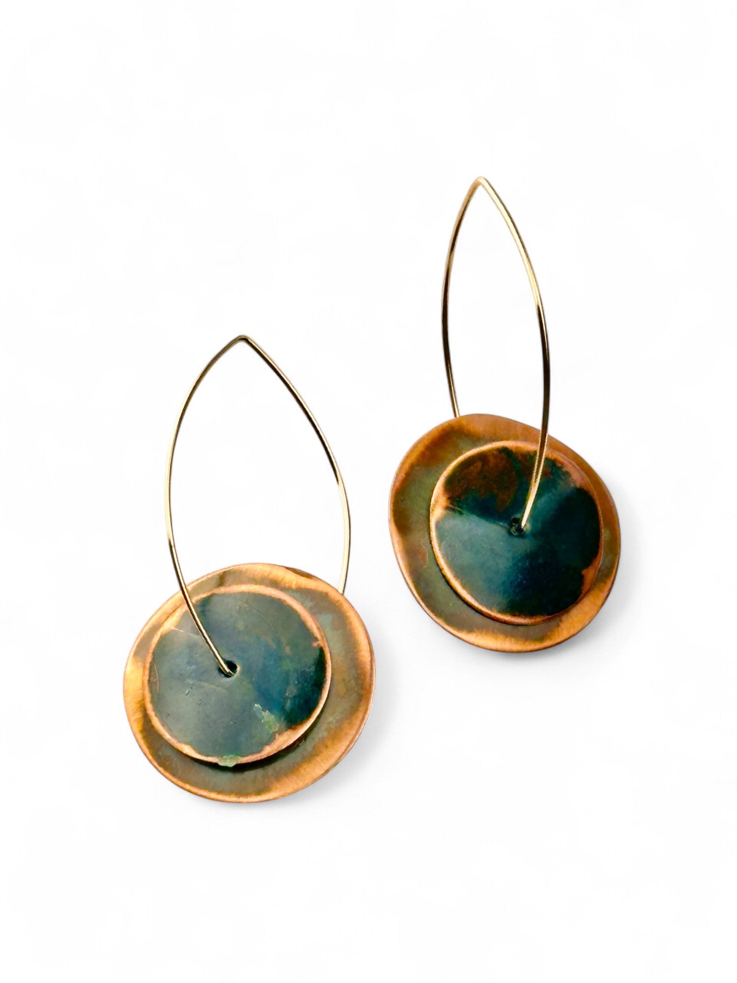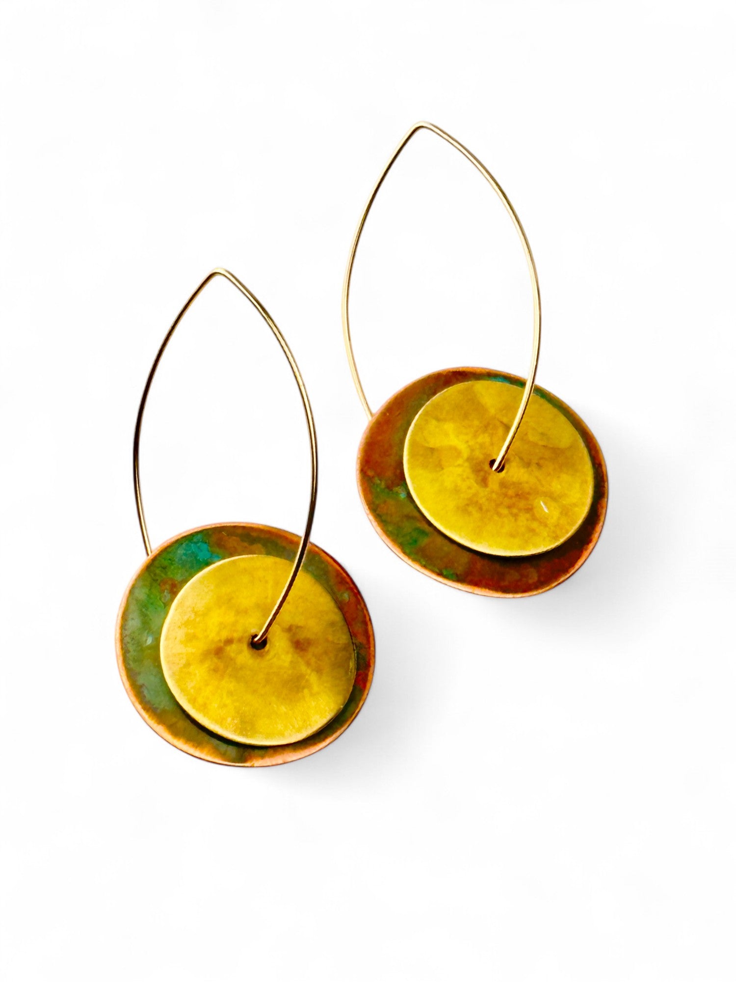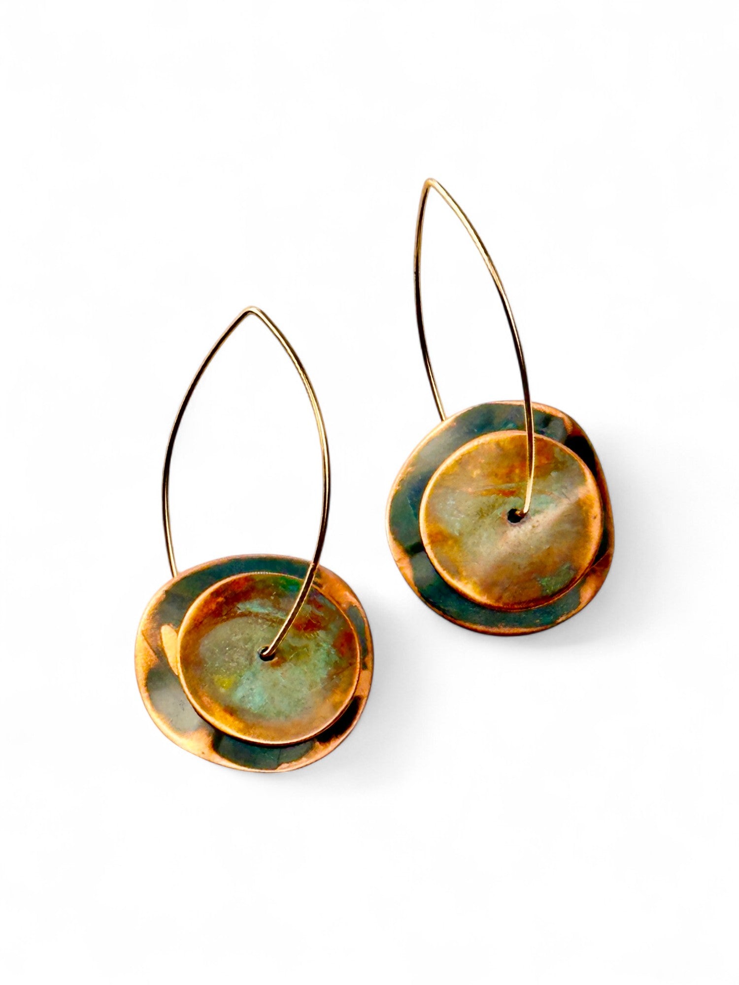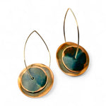 Brincos com chapas com ondulações irregulares e assimétricas, oxidados com gancho fechado com banho de ouro