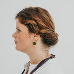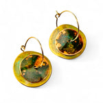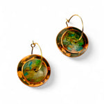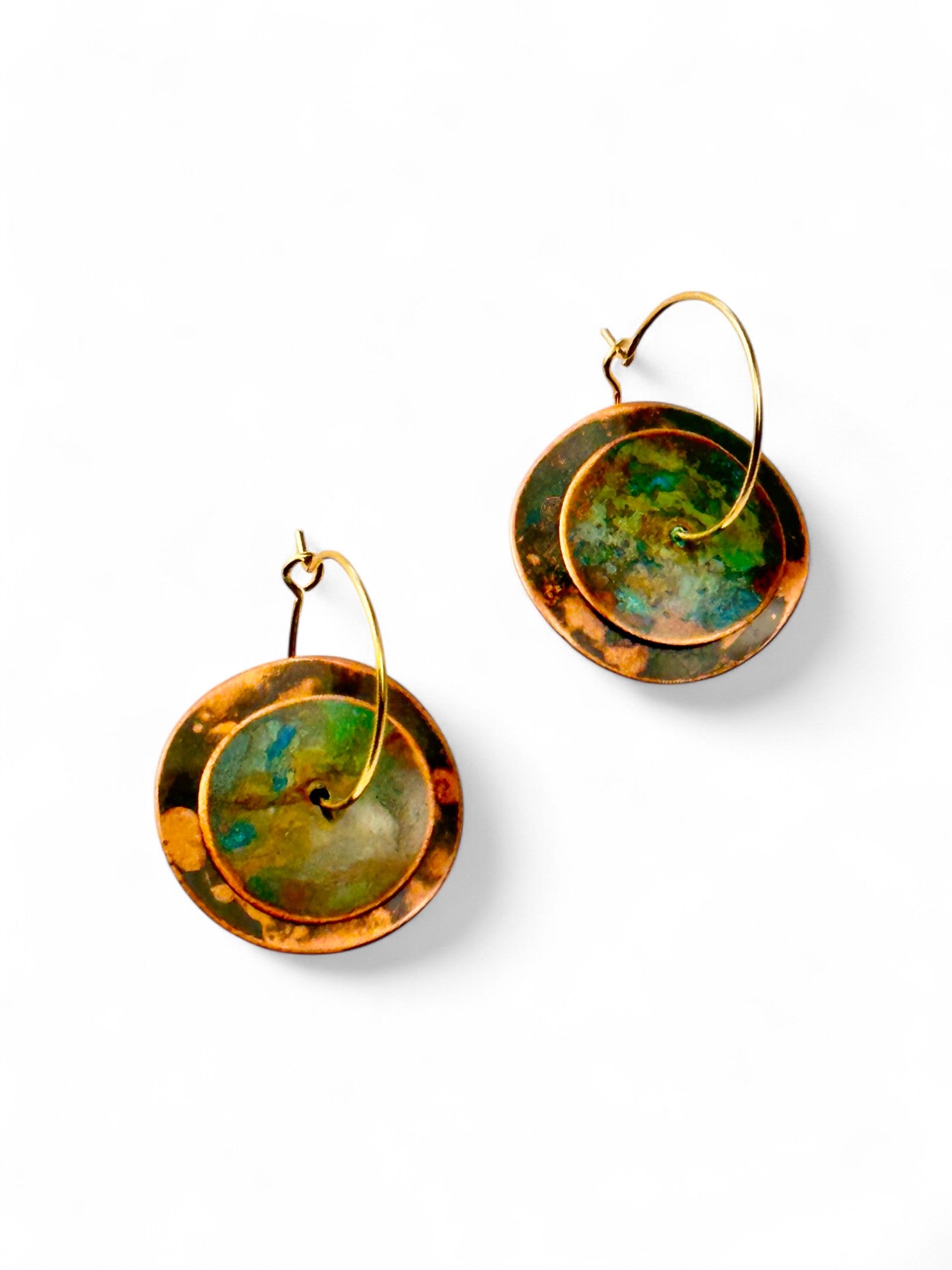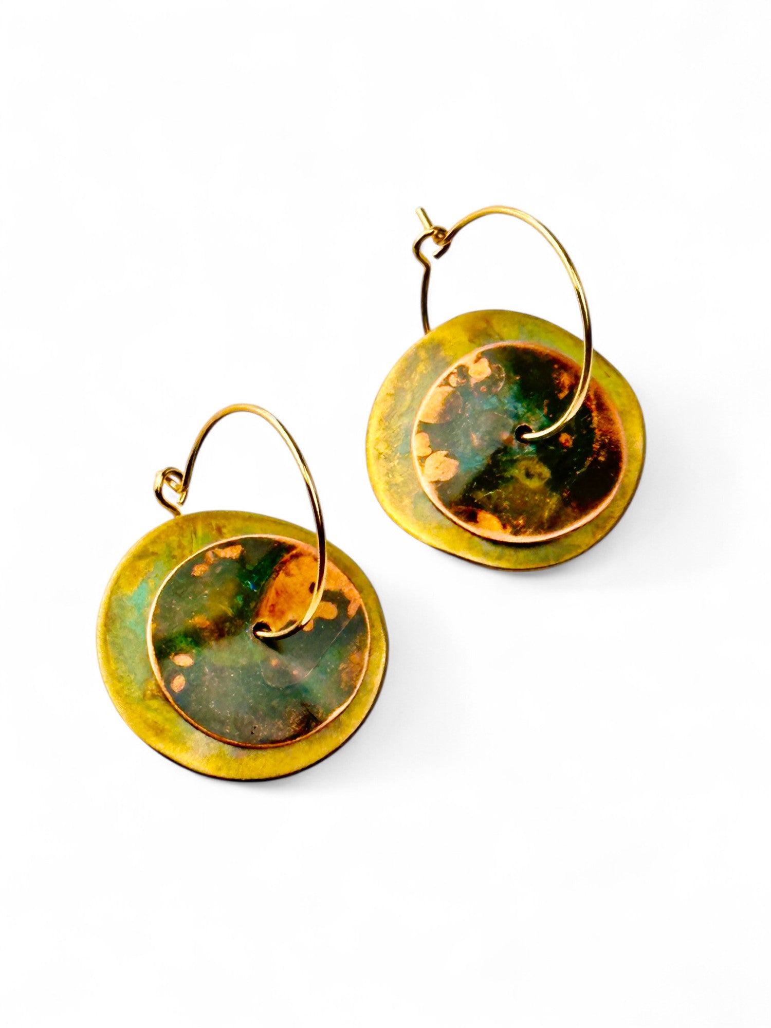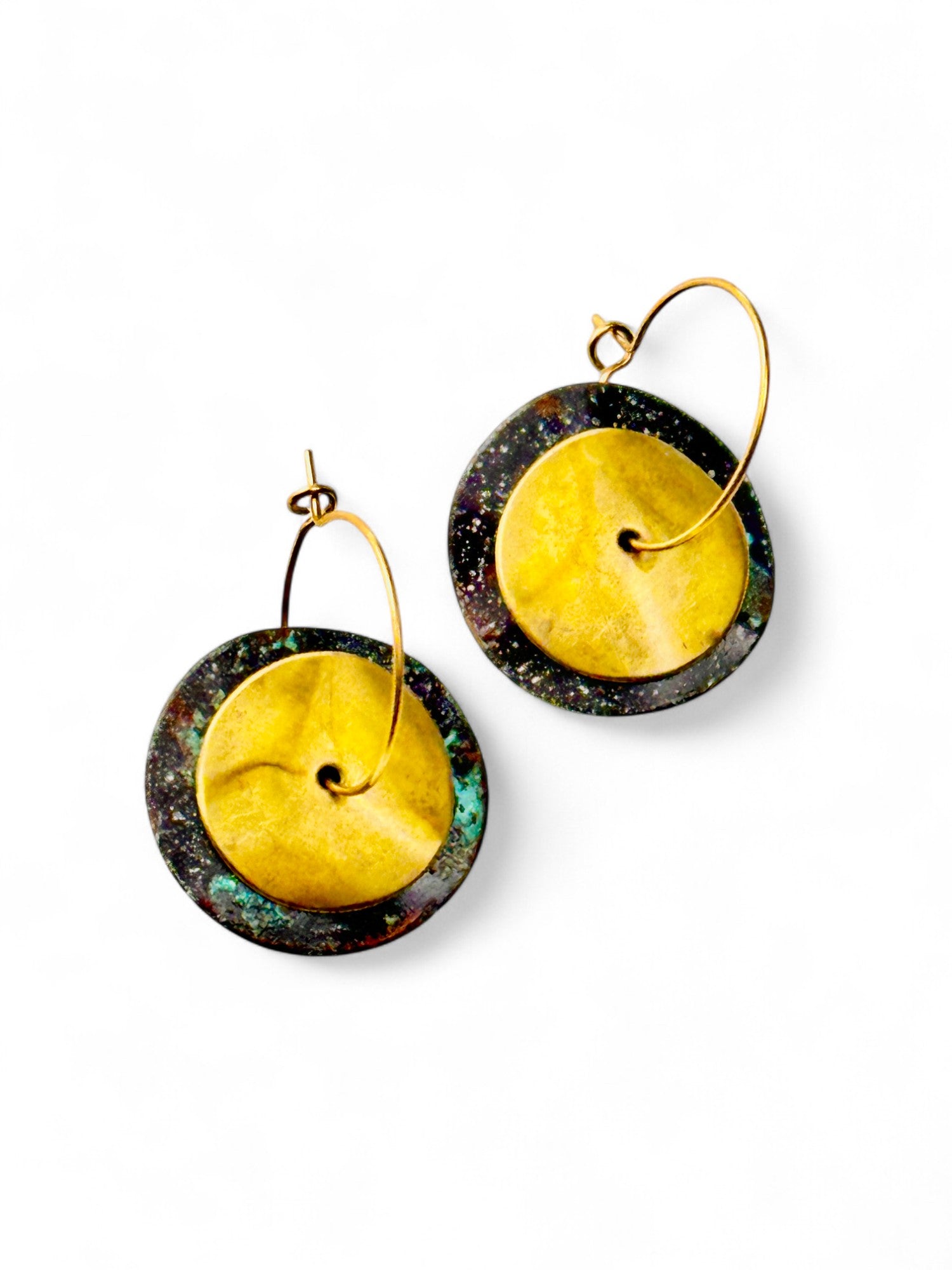Brincos com chapas com ondulações irregulares e assimétricas, oxidados com argolas fechadas com banho de ouro