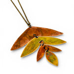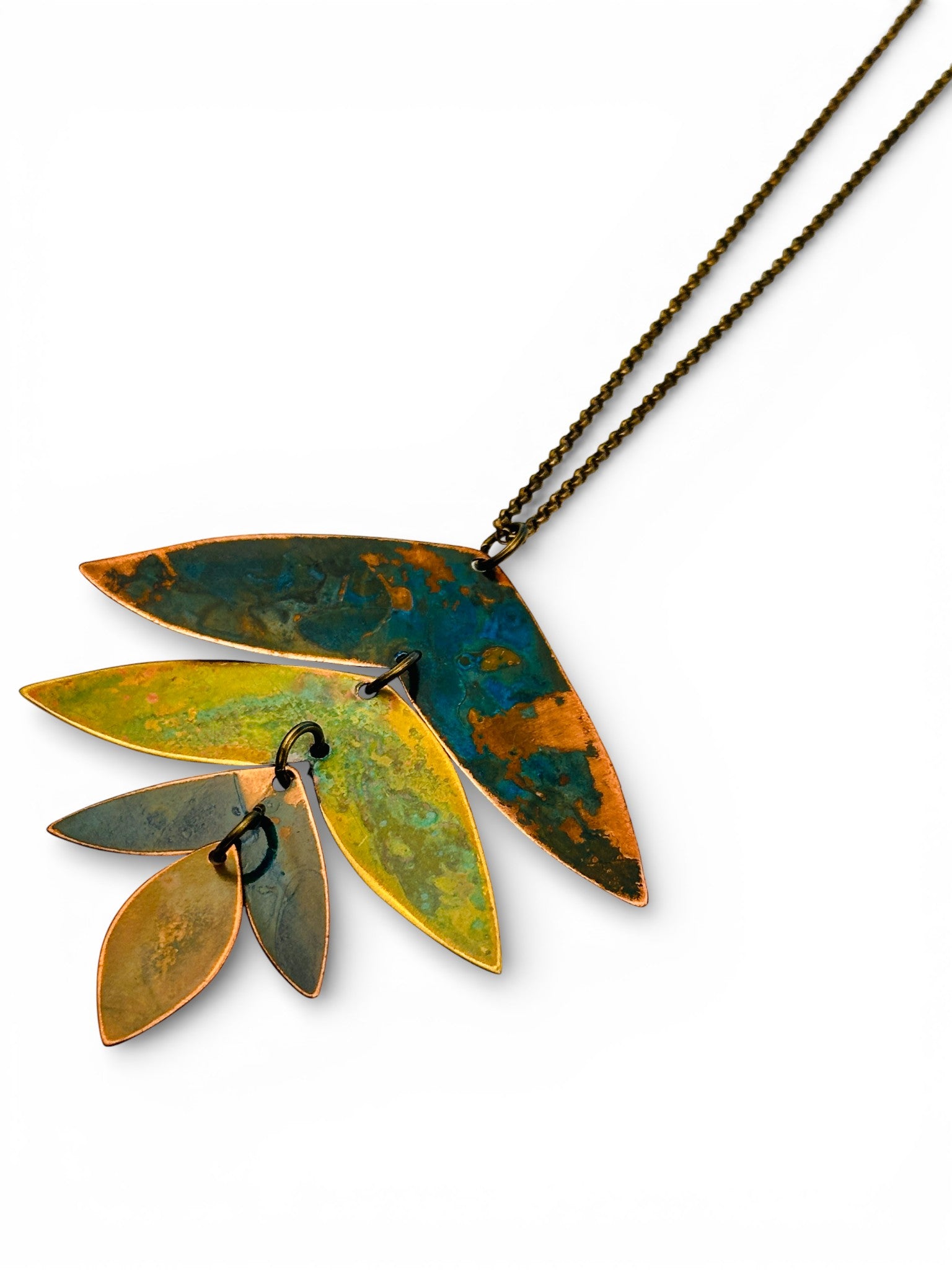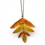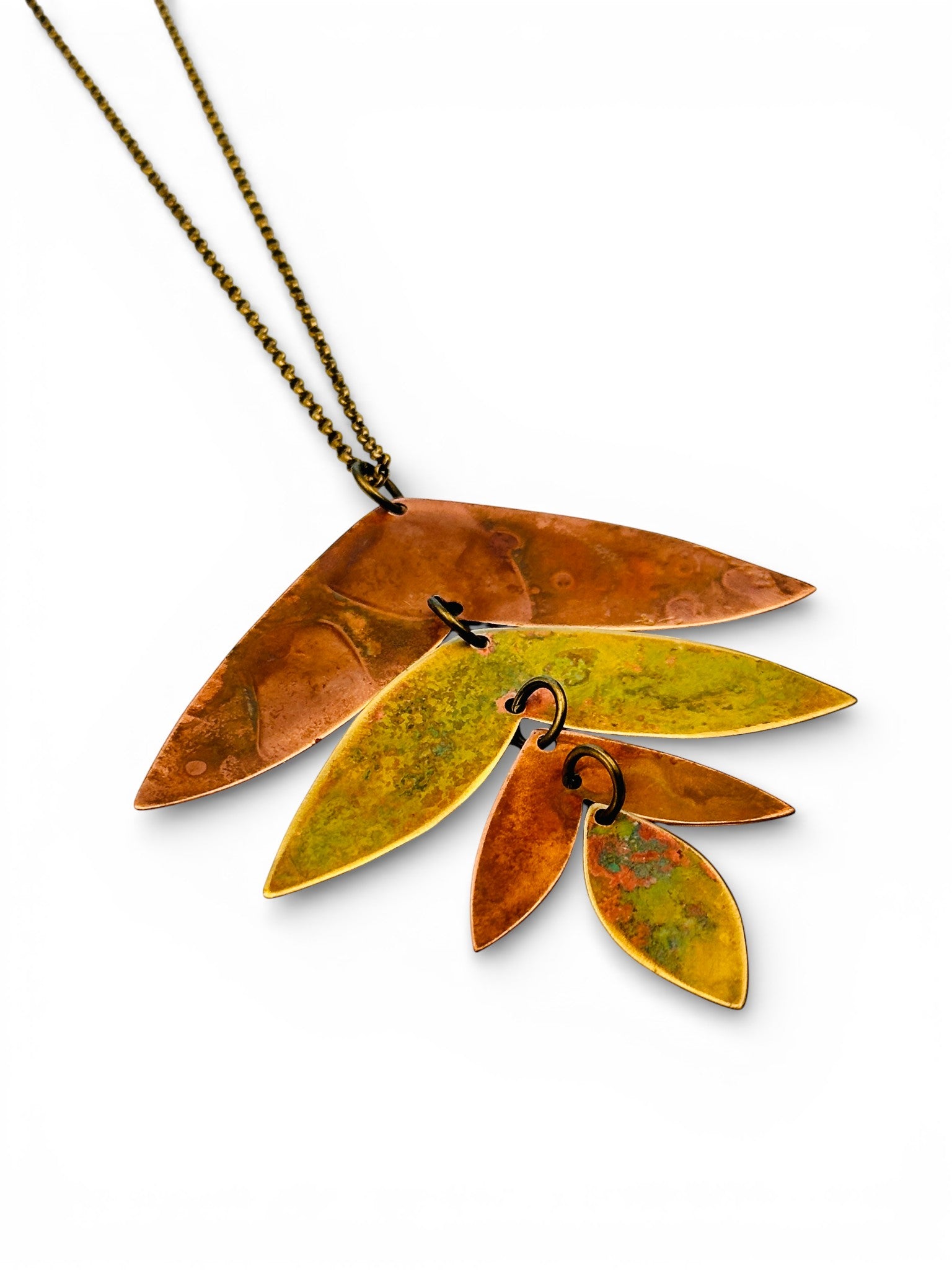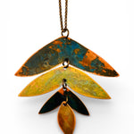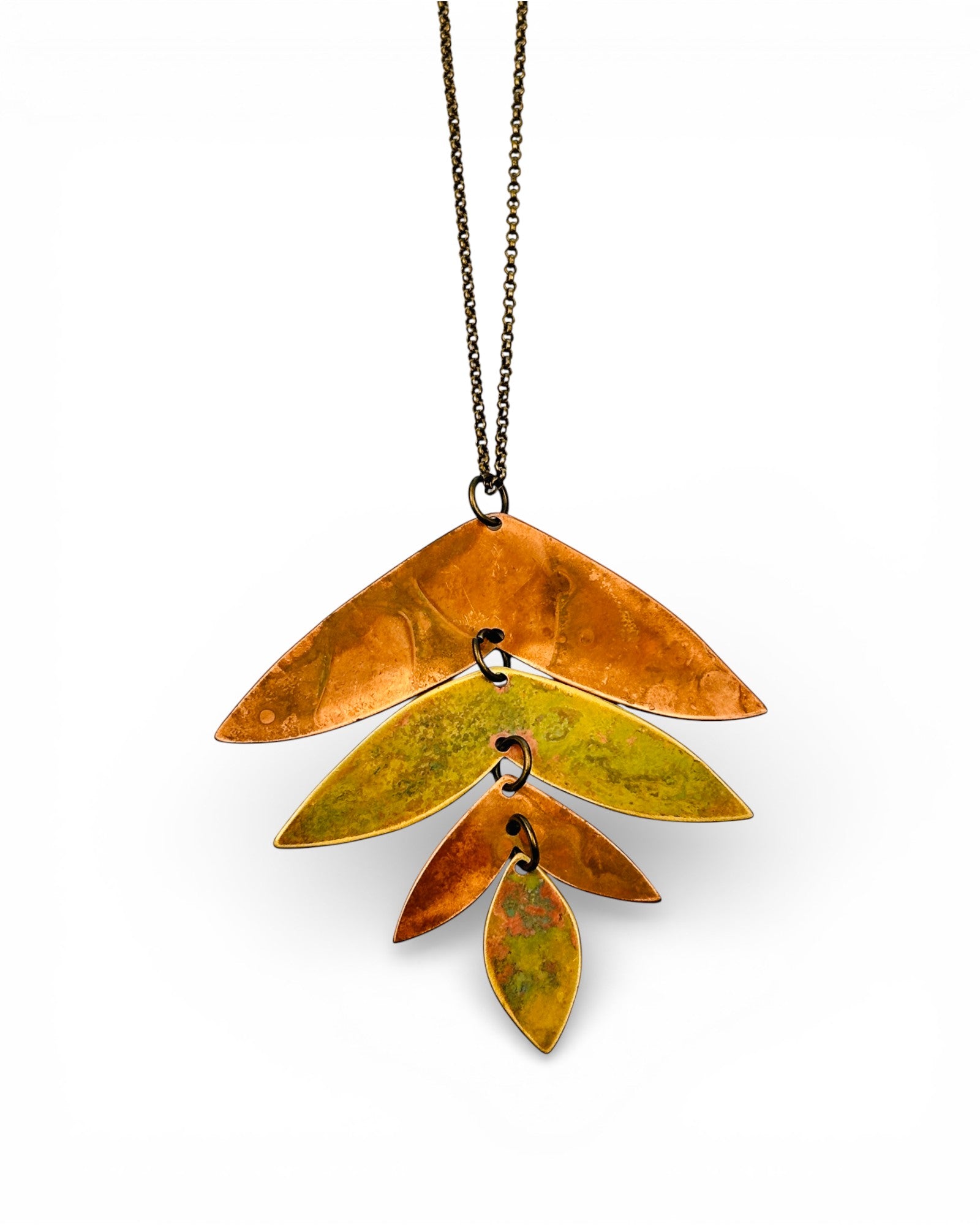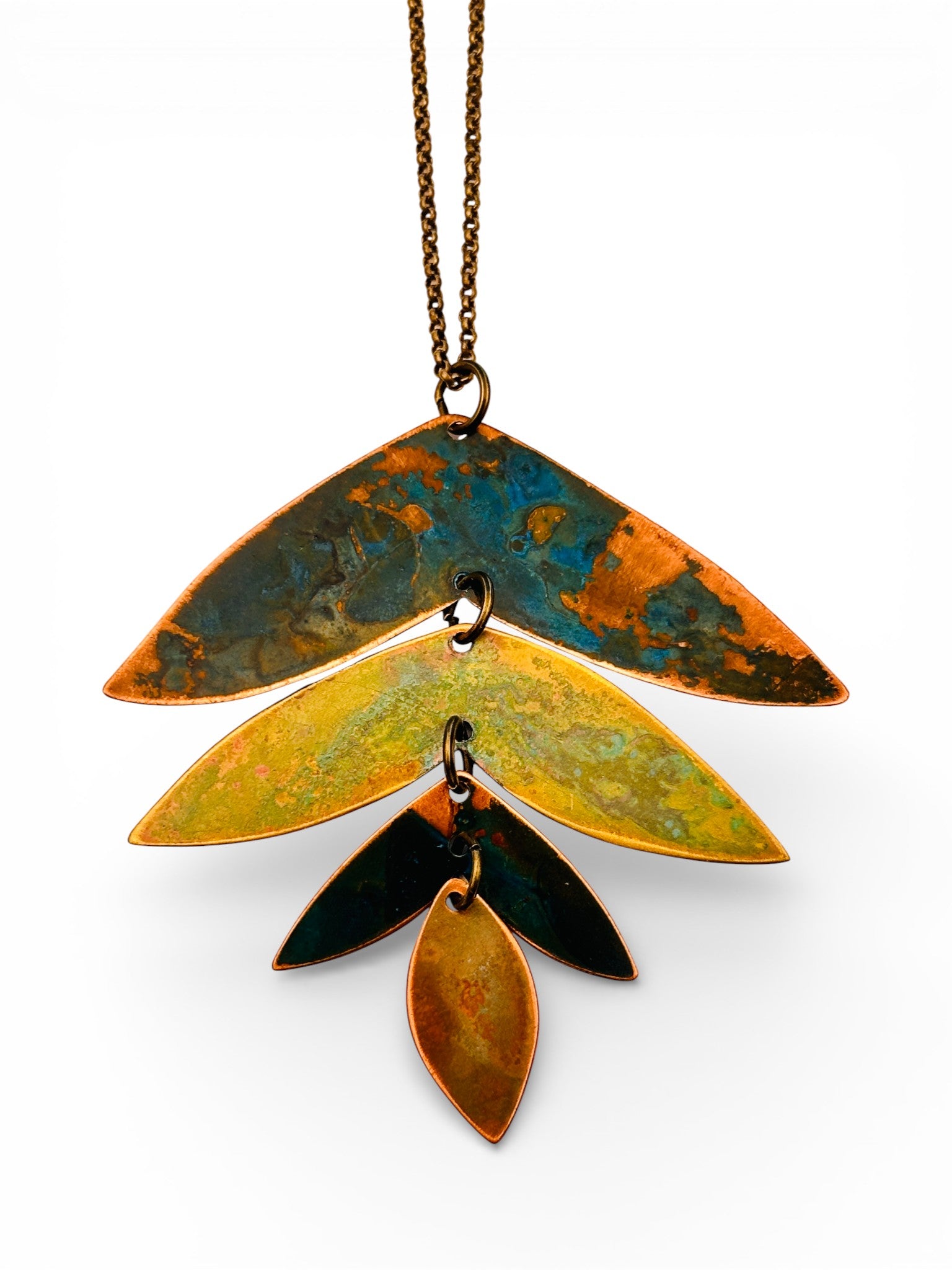 Colar com três peças de cobre e latão oxidadas articuladas, com corrente de latão de 70cm.