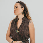 A imagem principal do produto mostra a peça disponível para compra, mas procuramos sempre incluir uma fotografia de contexto, com a peça usada por uma modelo ou em cenário. Essa foto pode não corresponder exatamente à peça que que receberá, podendo ser de outro metal ou de uma tonalidade diferente de oxidação; serve apenas como exemplo de como a peça fica no uso.