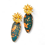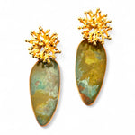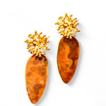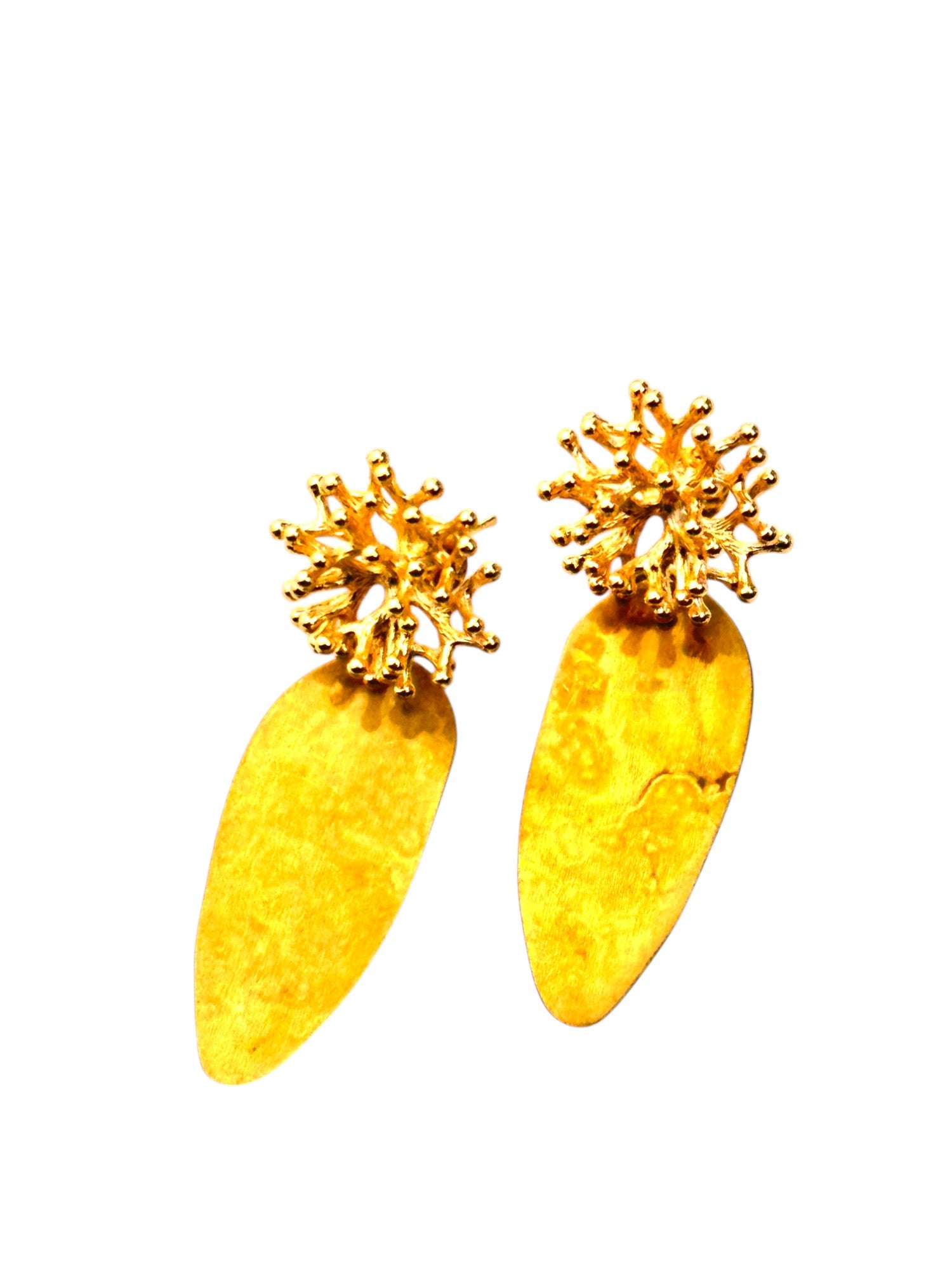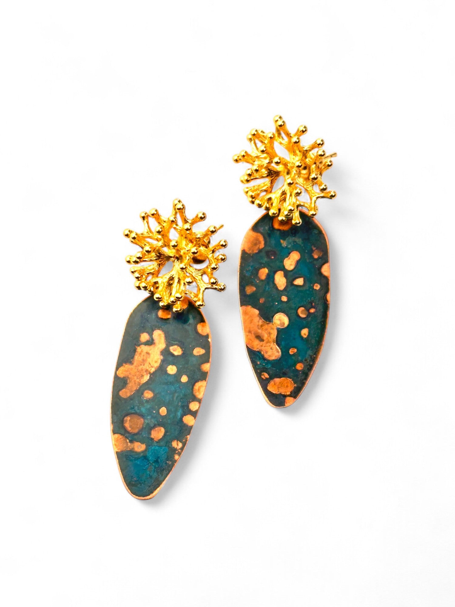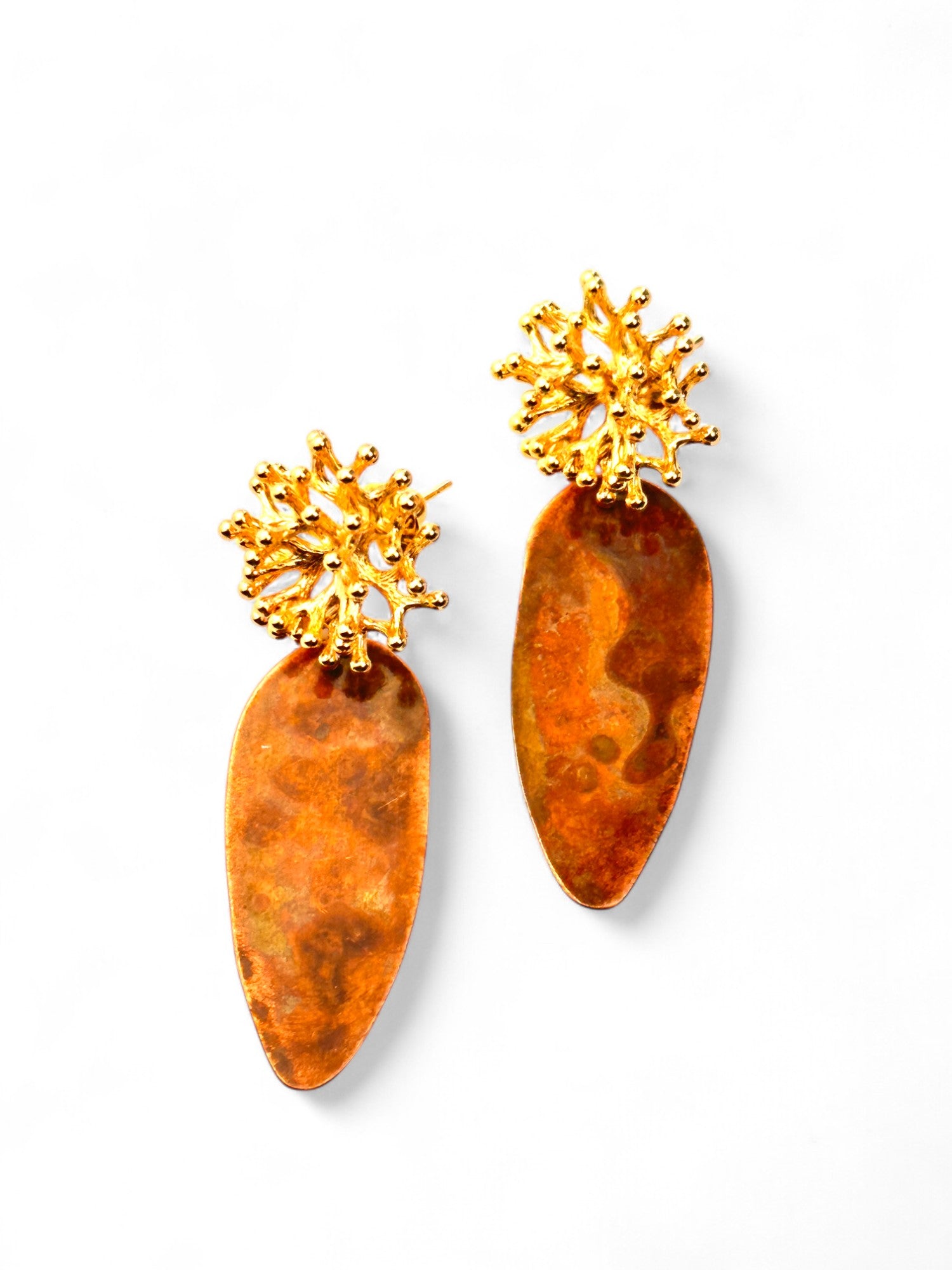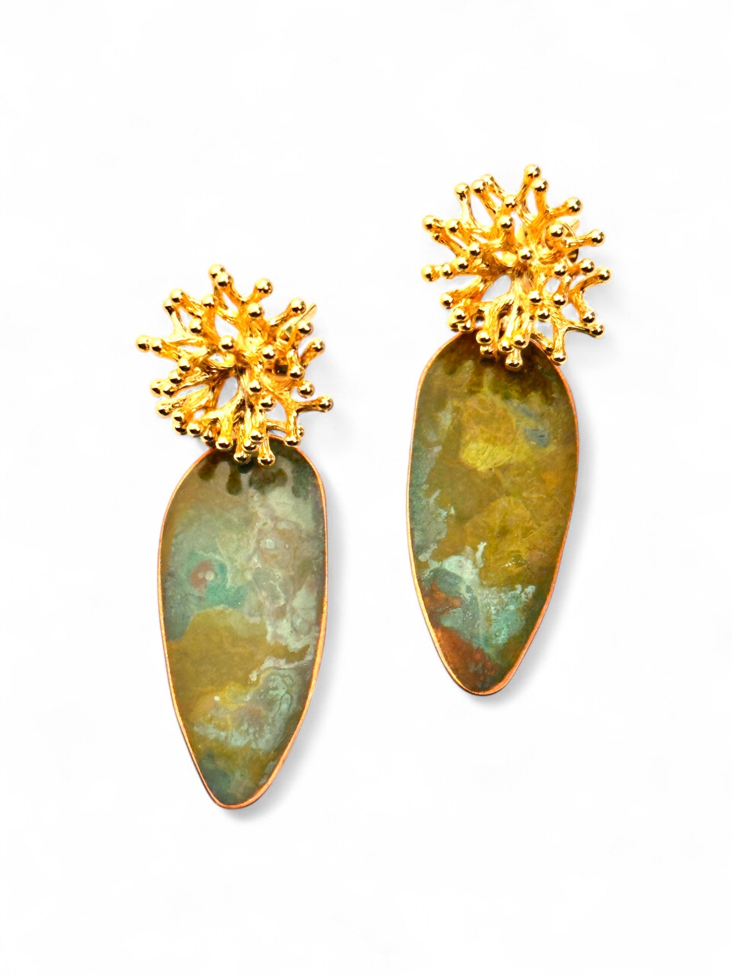 Brincos inspirados em corais marinhos. Alongados, oxidados, com stud orgânico com banho de ouro