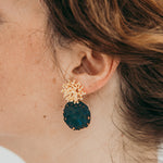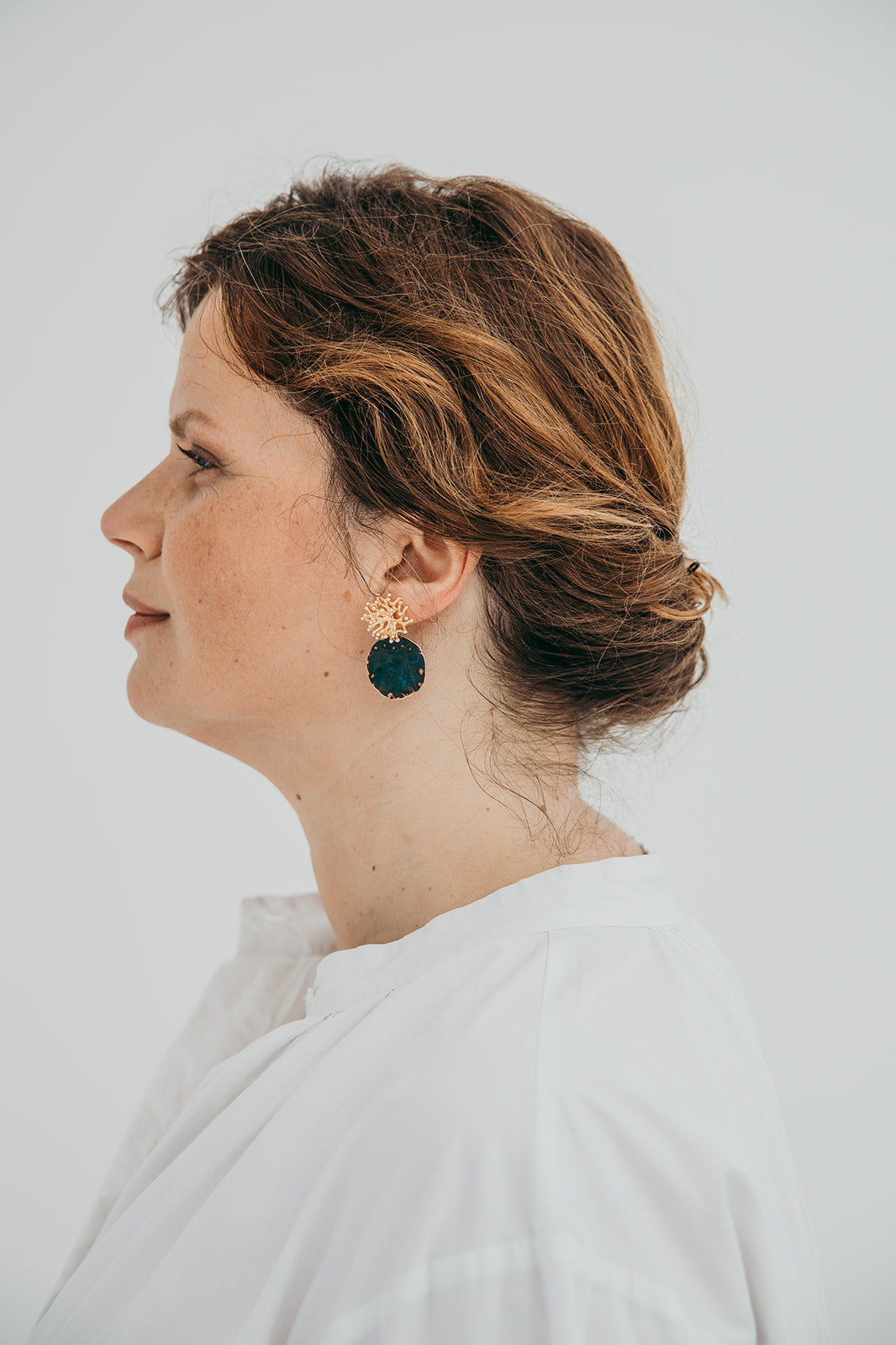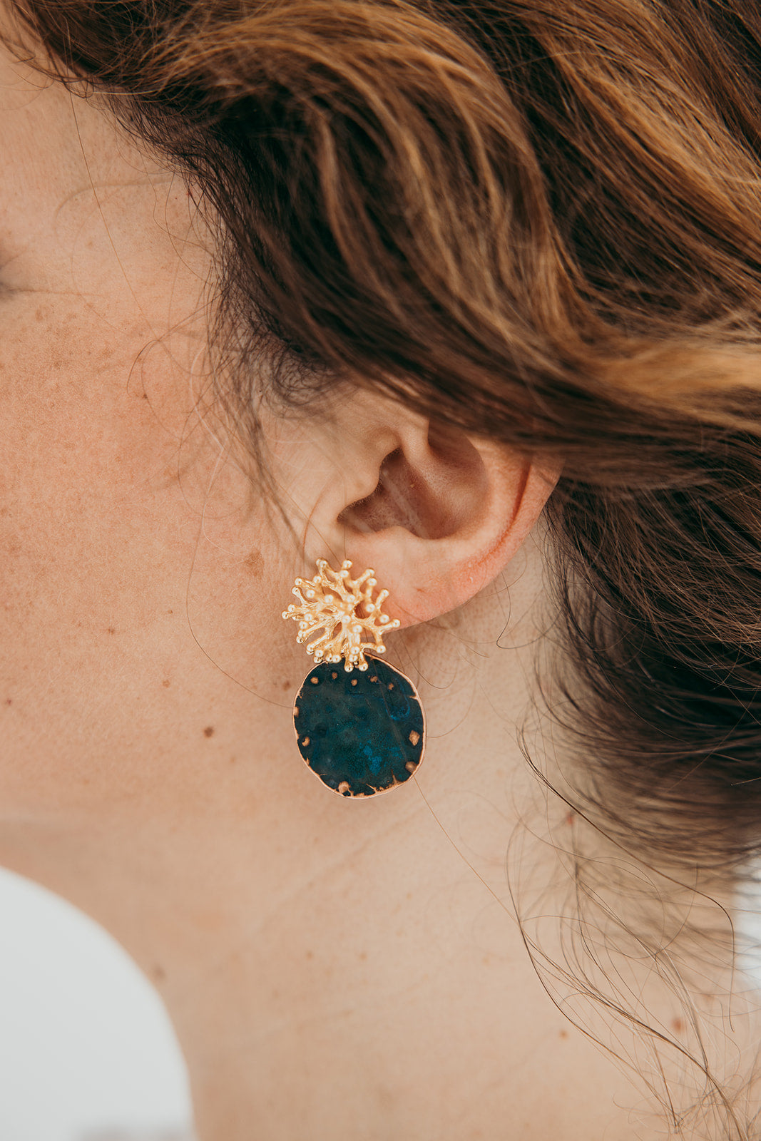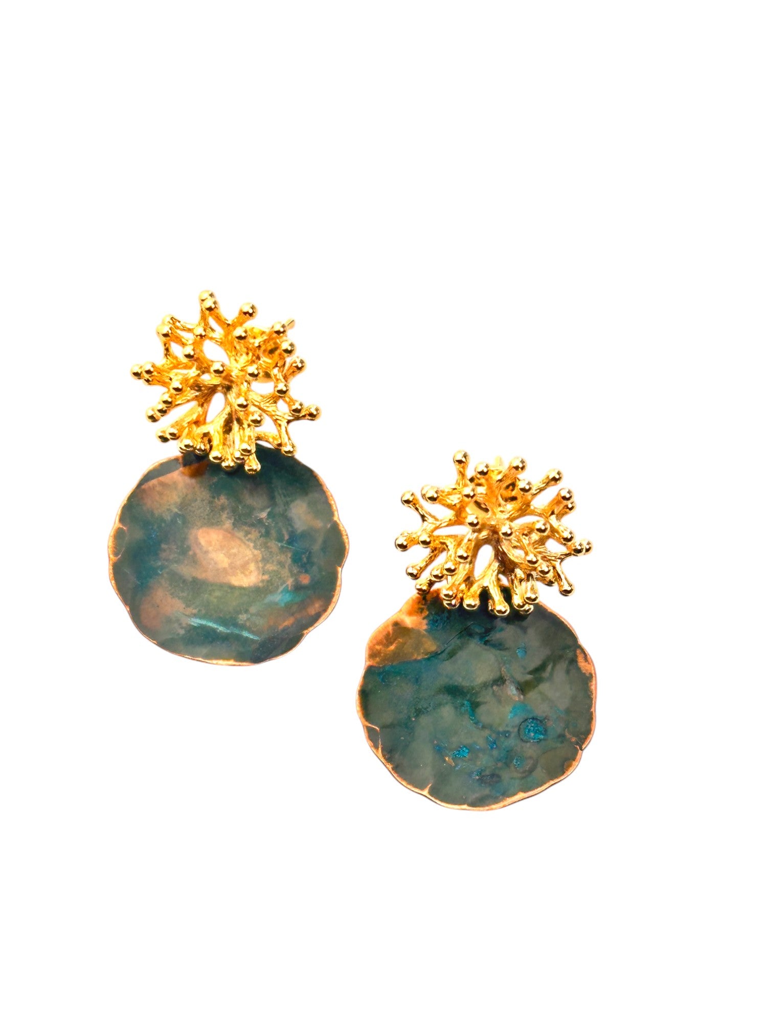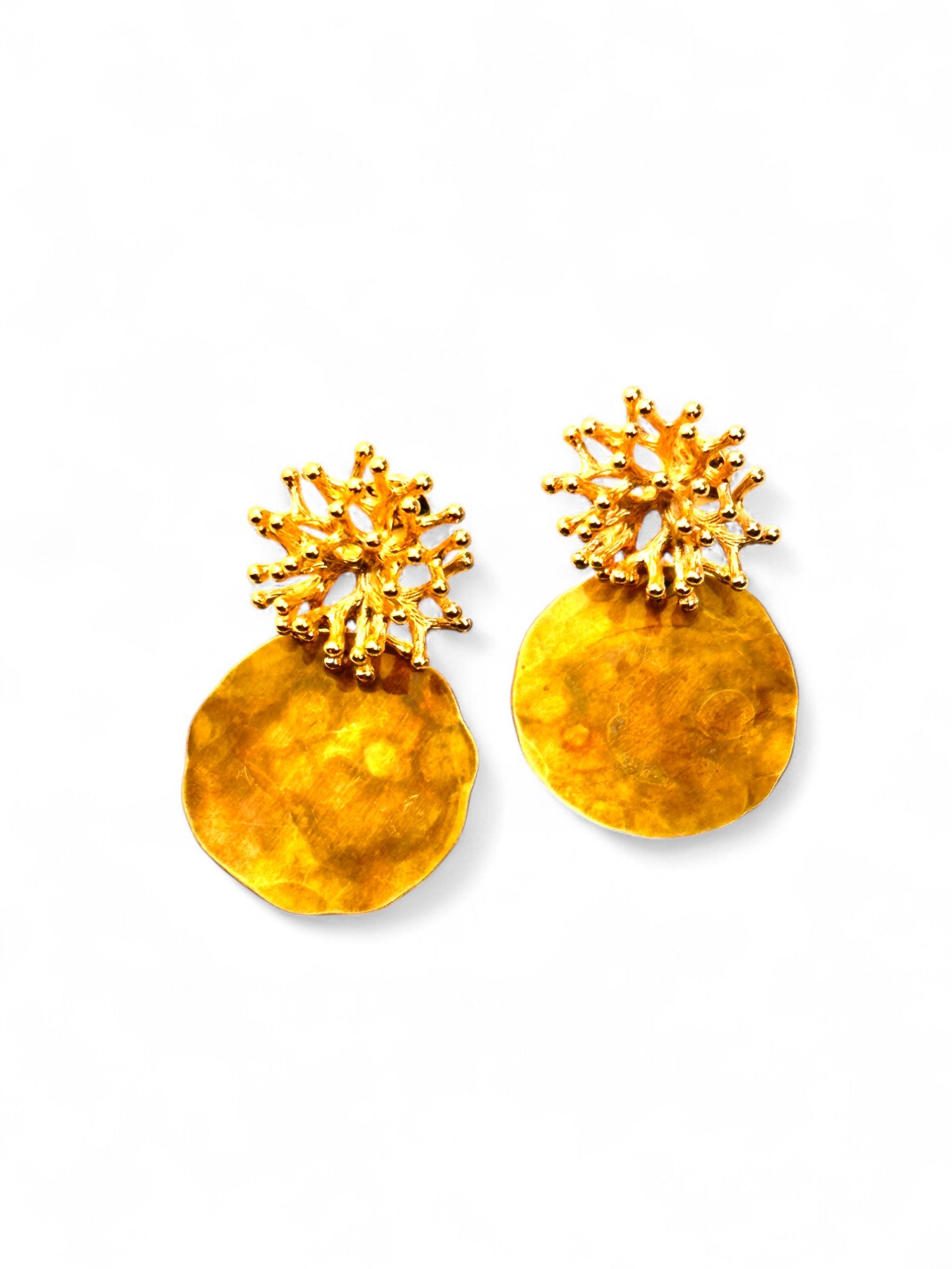 Brincos de tamanho médio, volumosos, com chapa martelada à mão, oxidada e irregular, com espigão em forma de coral, com banho de ouro