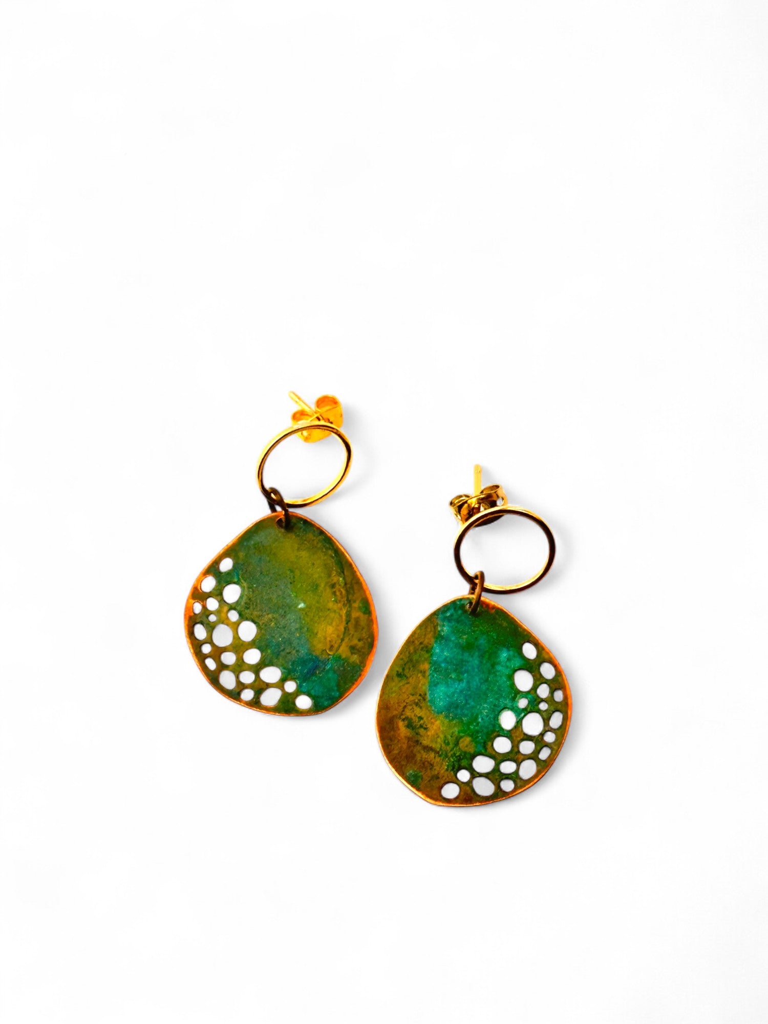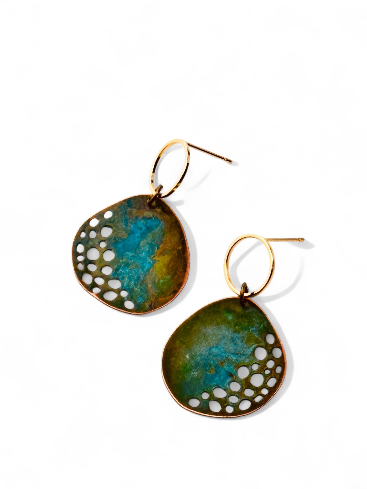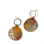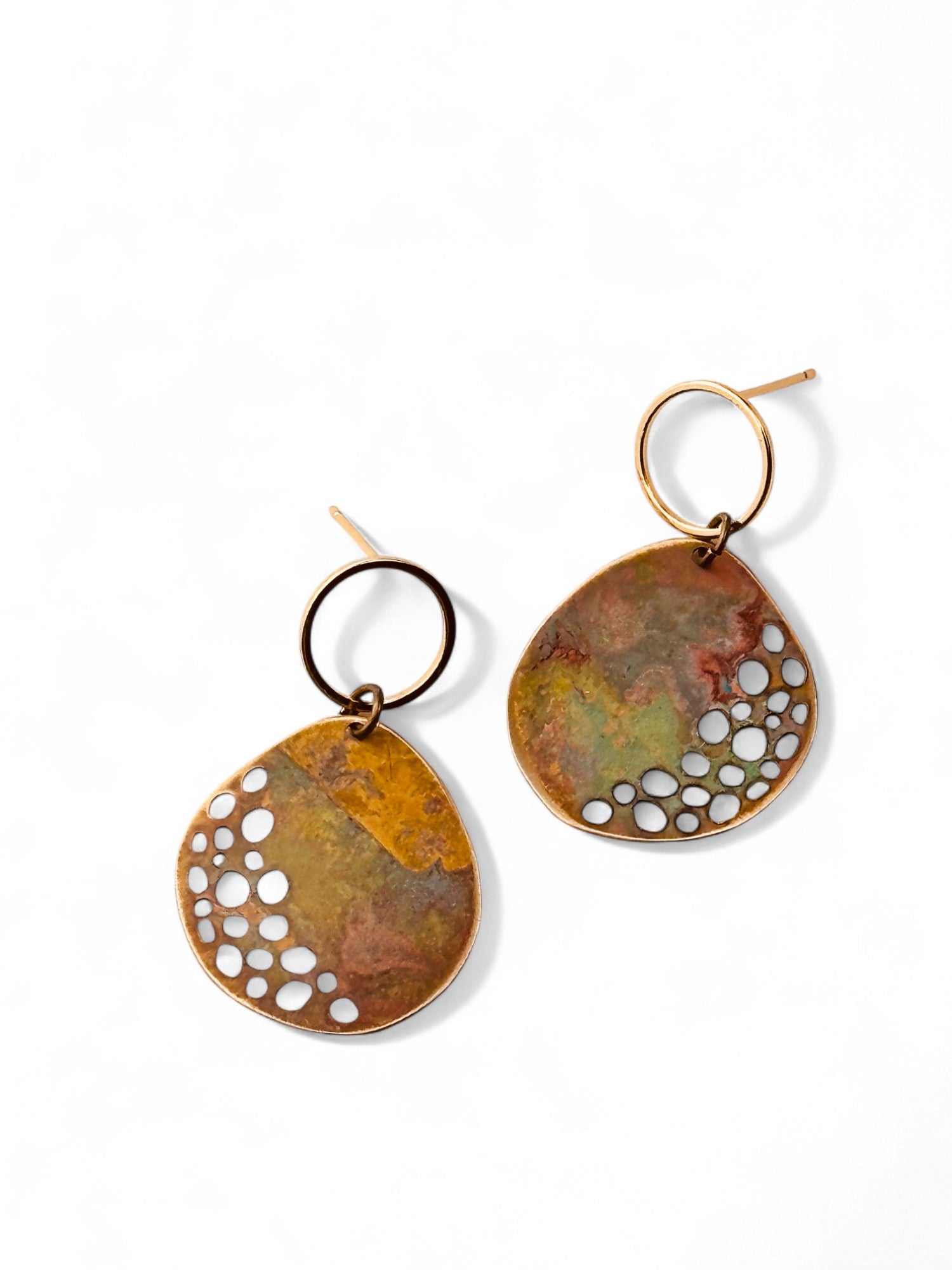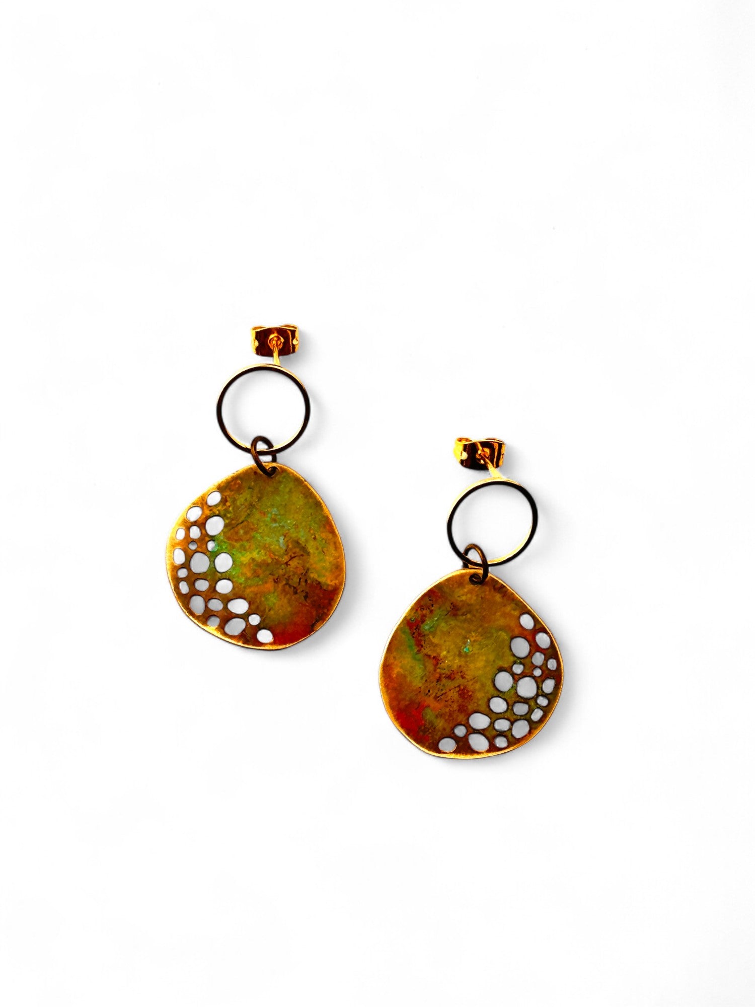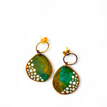 Brincos stud Portinho da Arrábida, com oxidações naturais. Stud circular com banho de ouro.