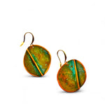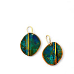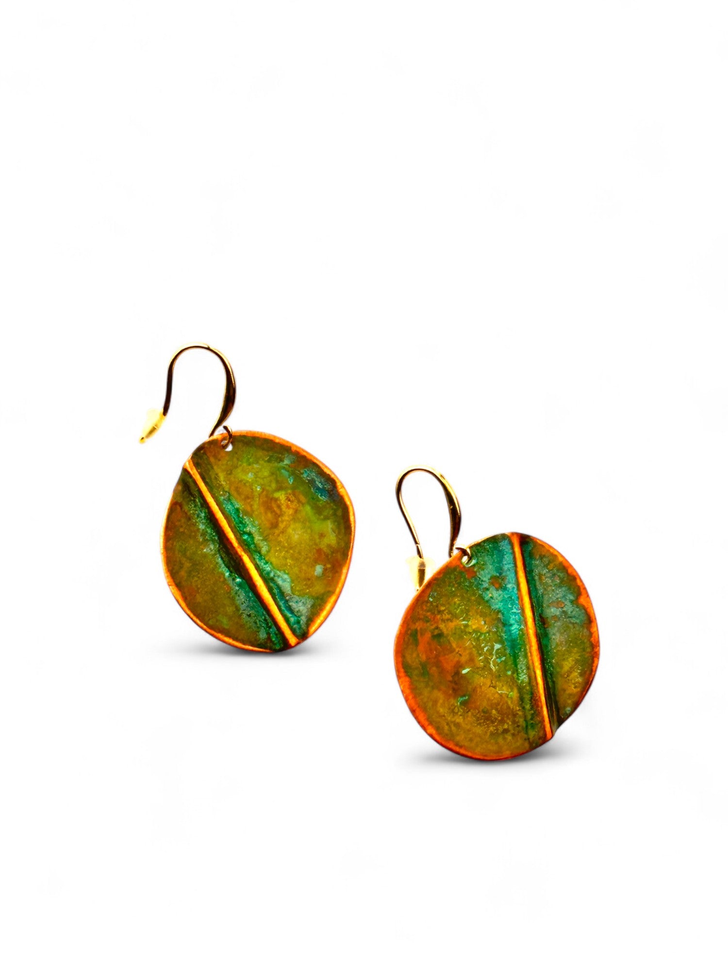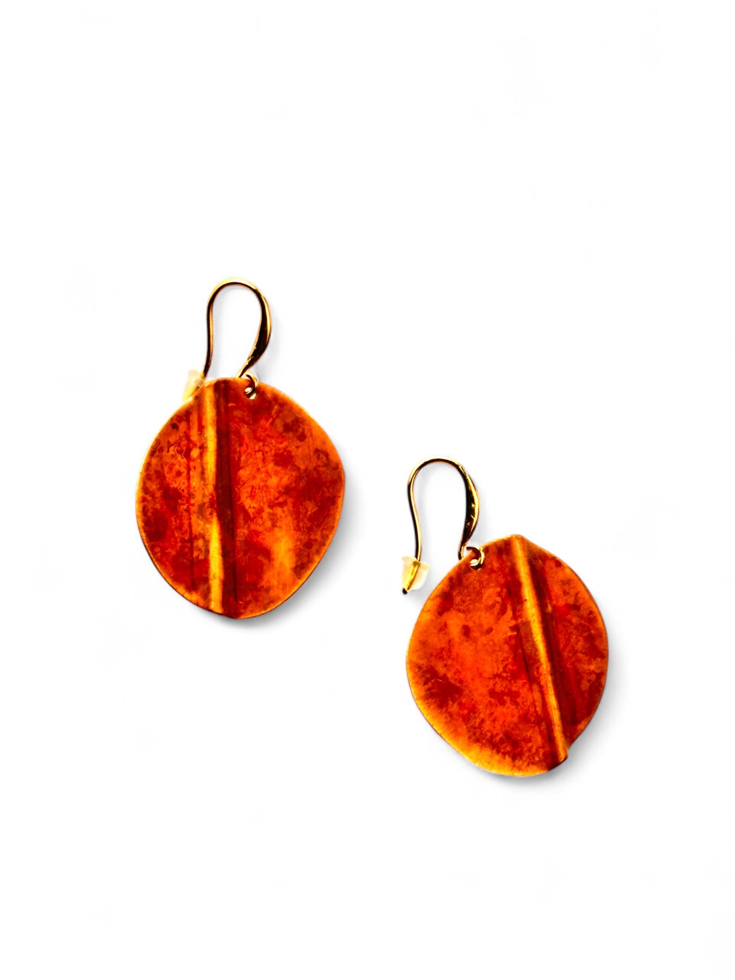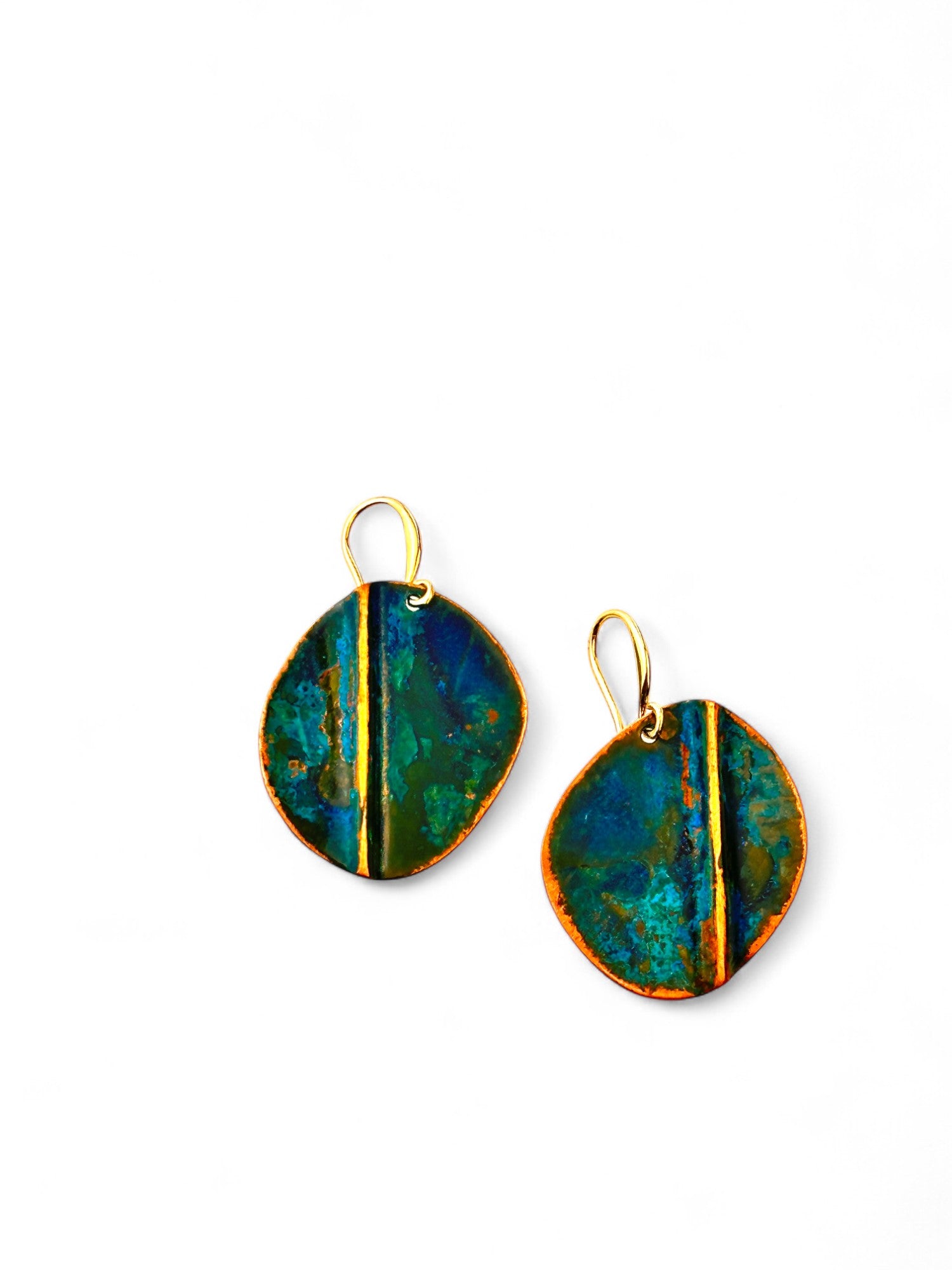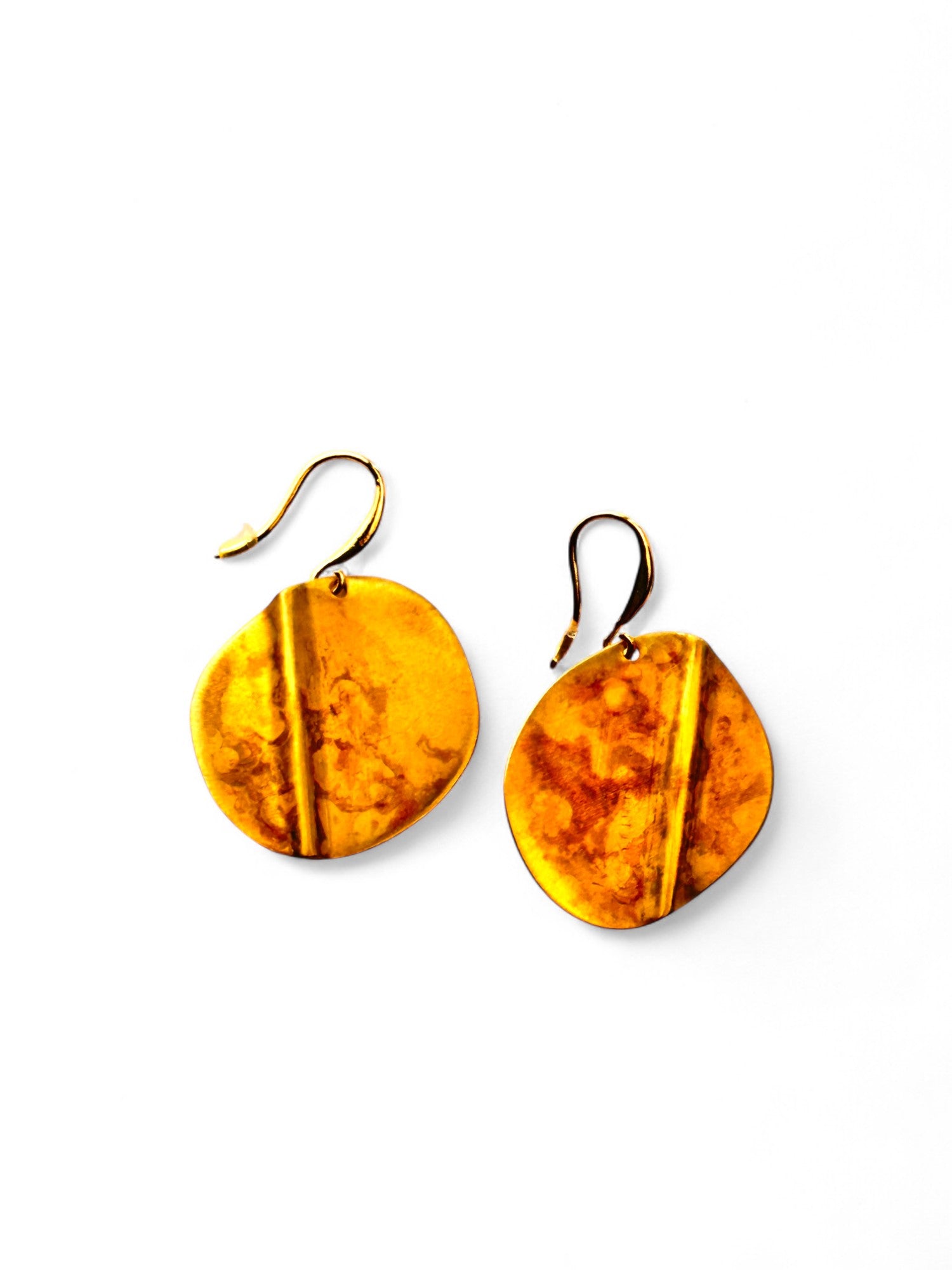 Brincos pequenos, com recorte oval irregular, assimétricos, oxidados, com gancho aberto com banho de ouro