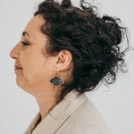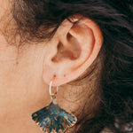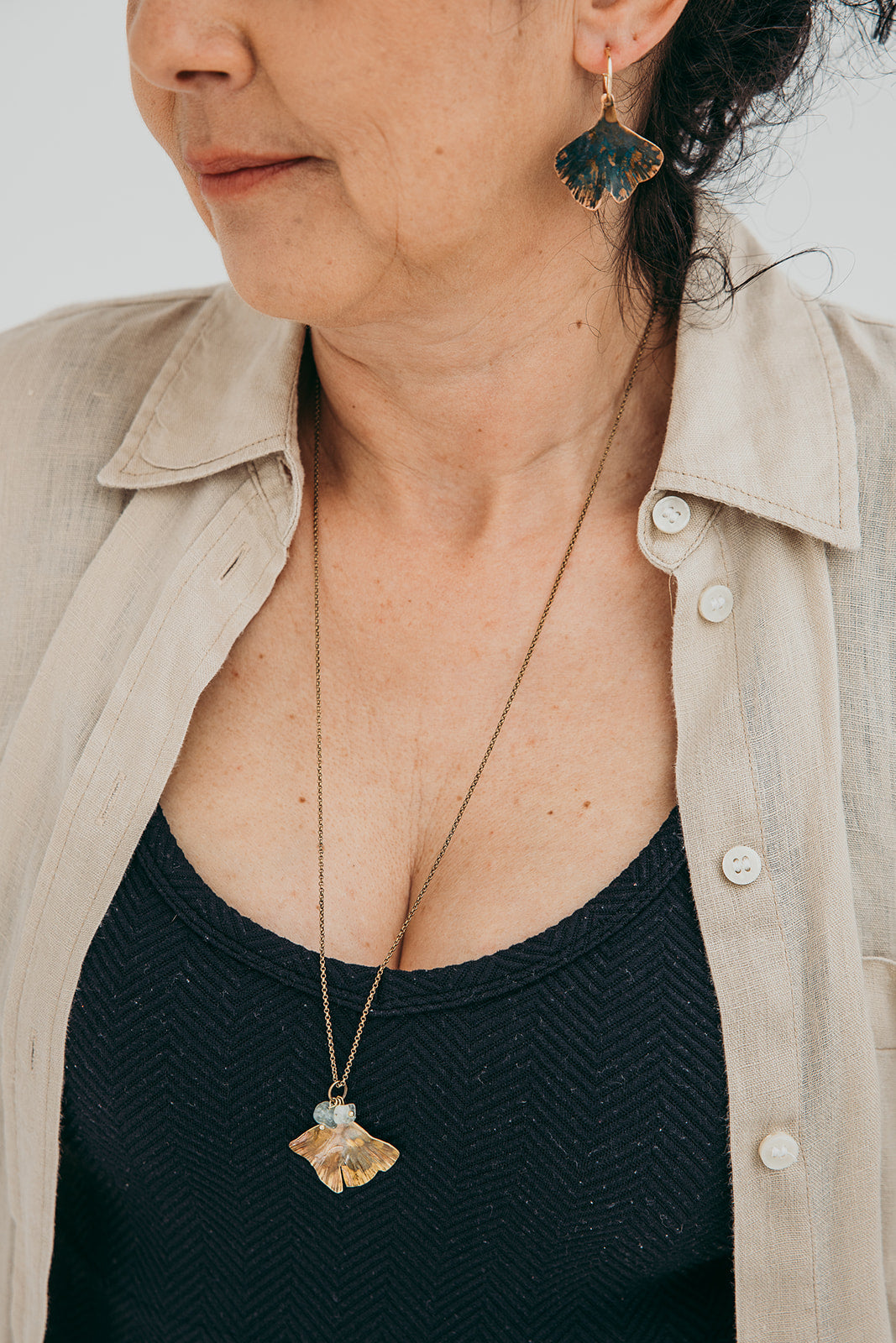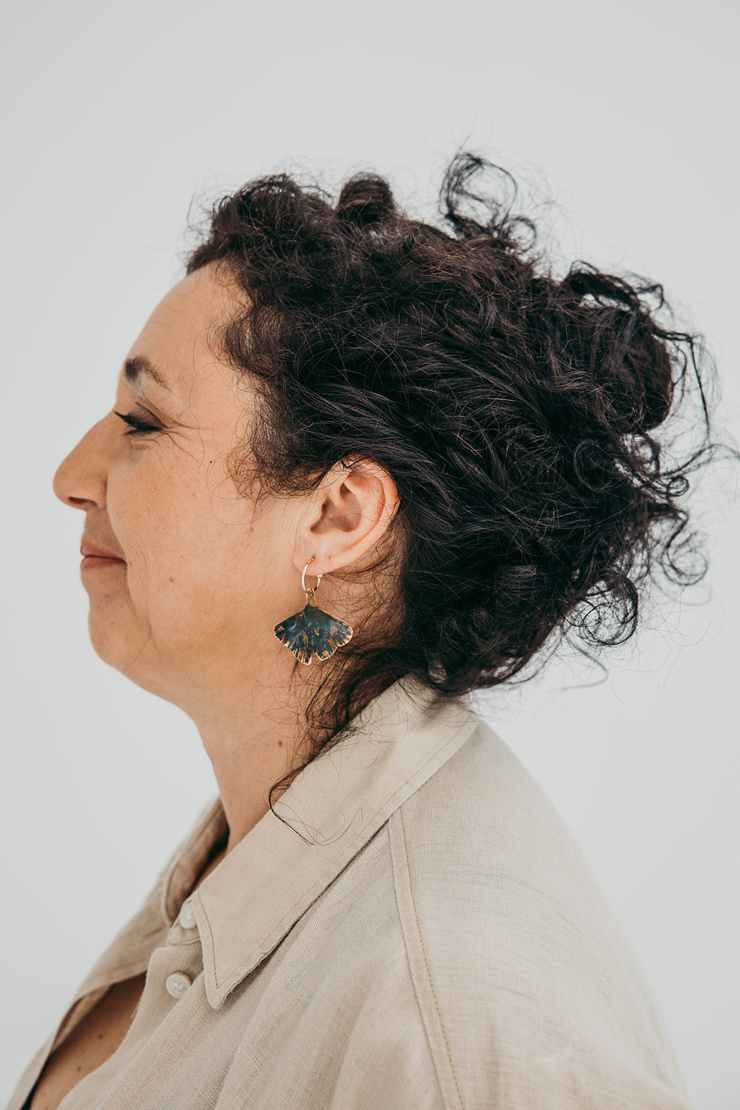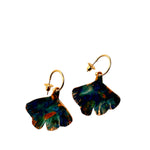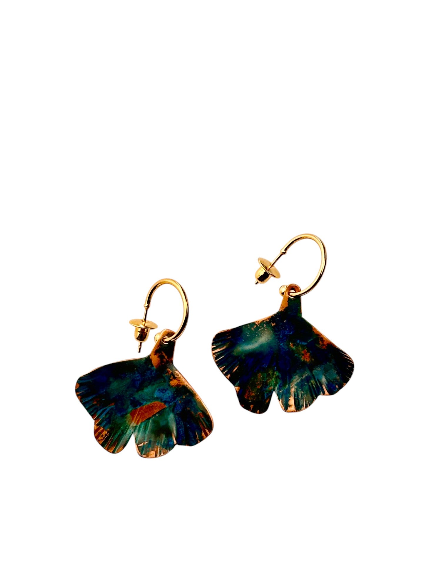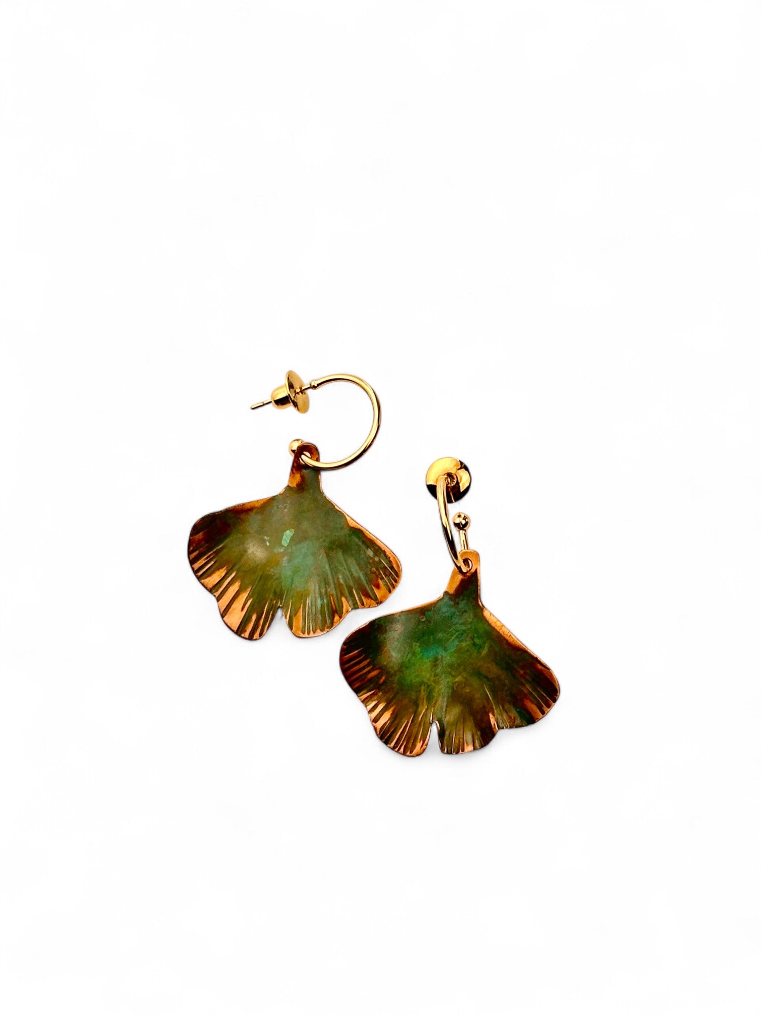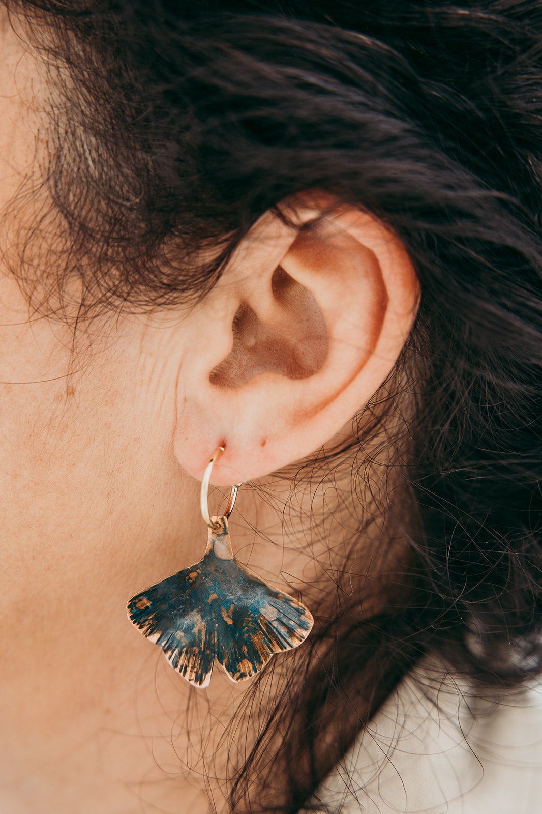 Argolas abertas com folha de gingko pequena. Recortados, martelados e oxidados manualmente, com argola aberta com banho de ouro