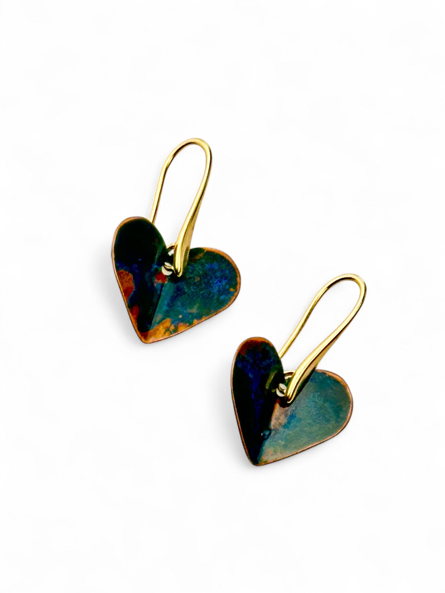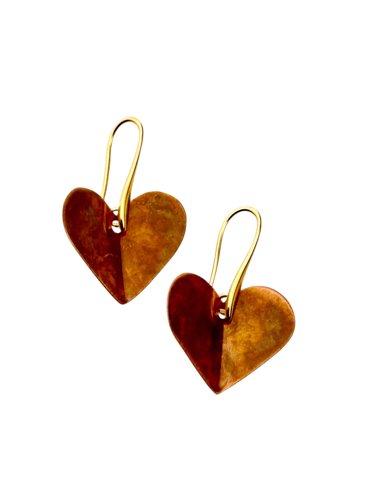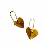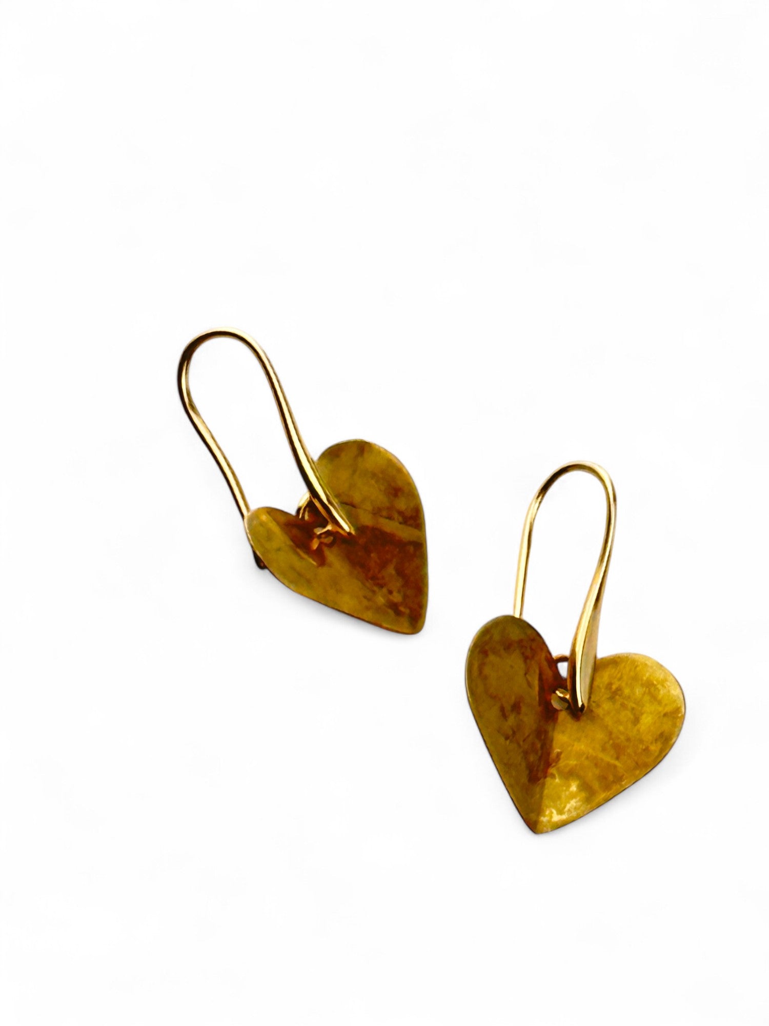 Brincos com pequenos corações recortados à mão e oxidados, com gancho aberto com banho de ouro