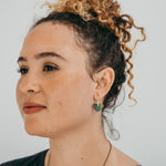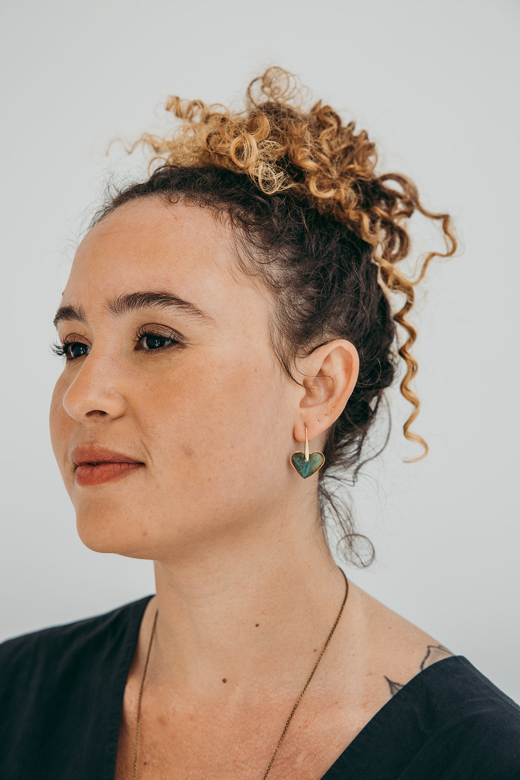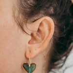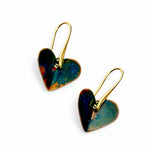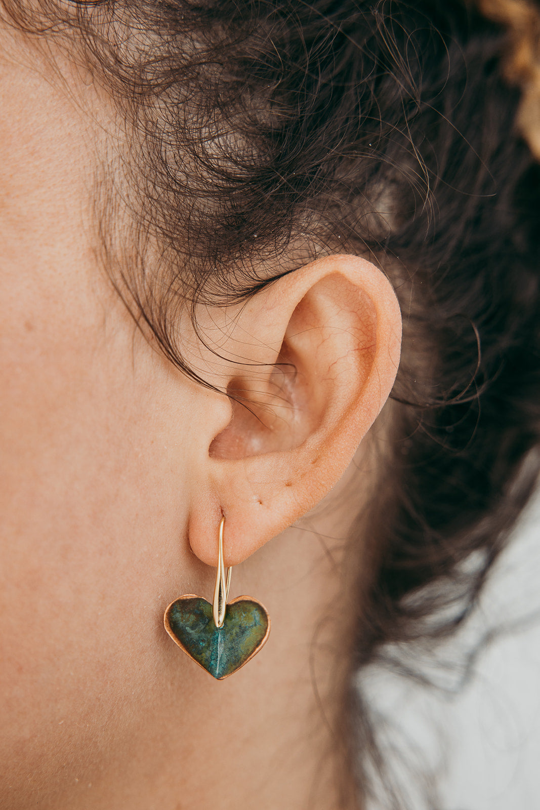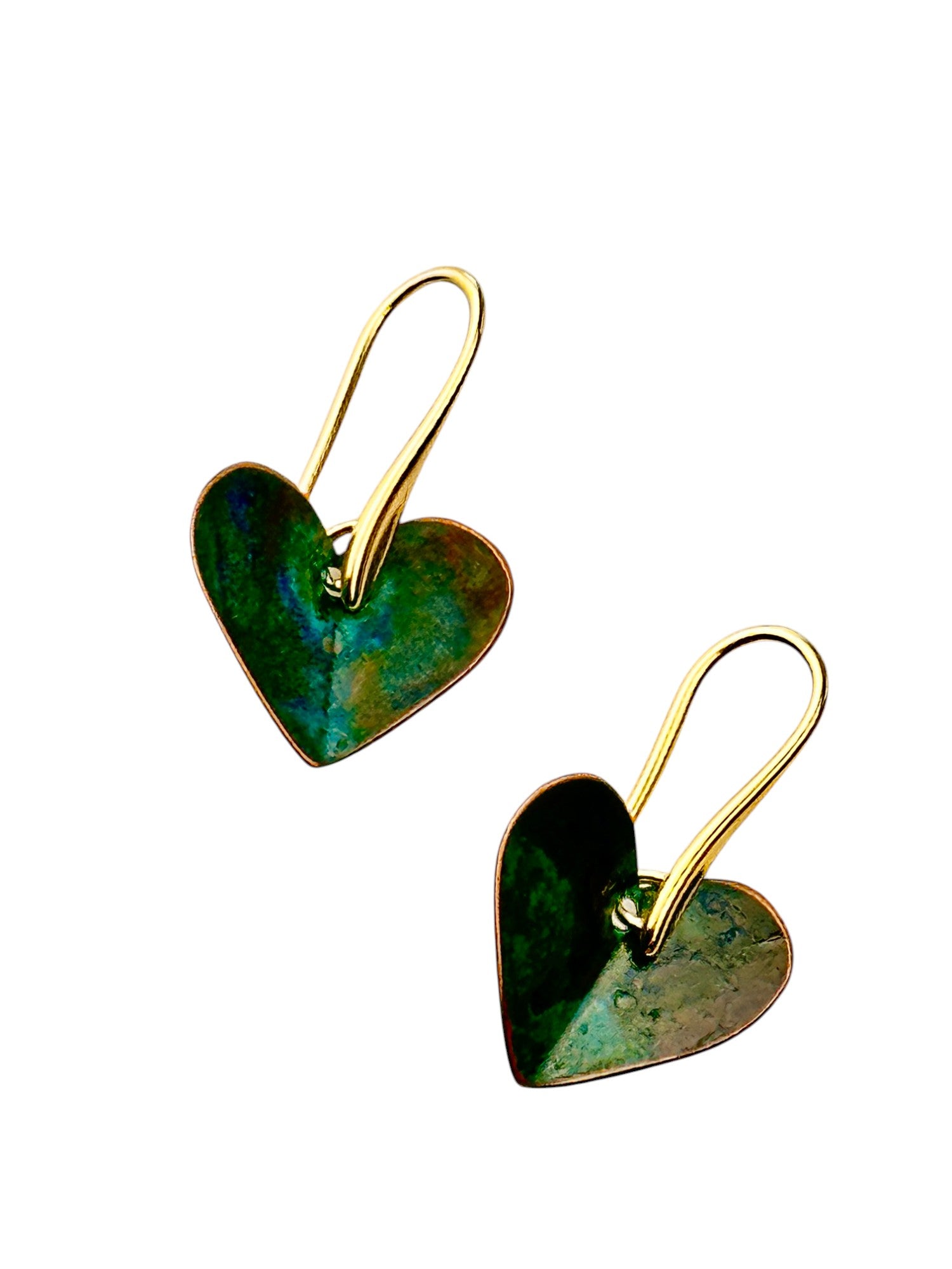 Brincos com pequenos corações recortados à mão e oxidados, com gancho aberto com banho de ouro