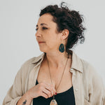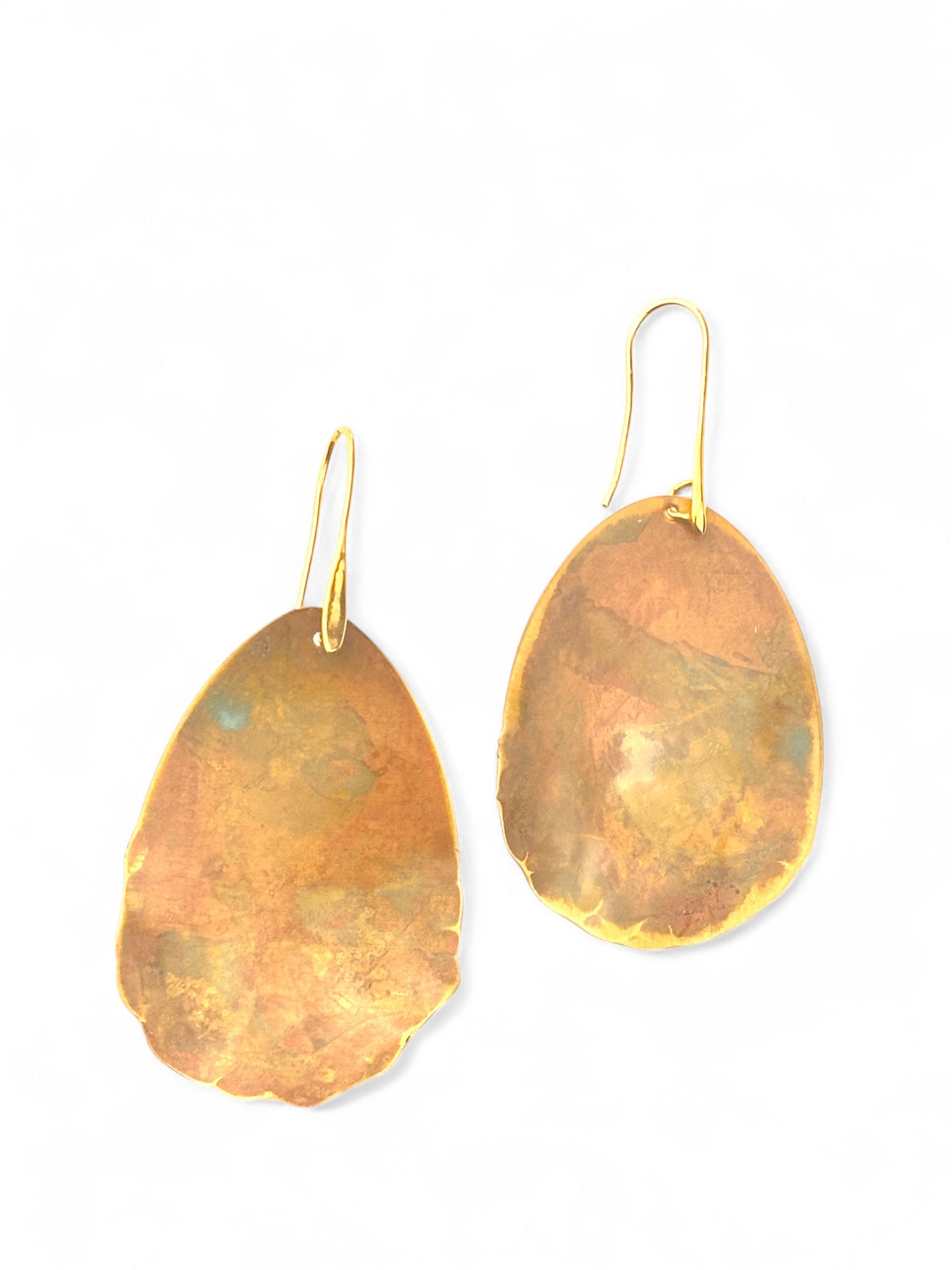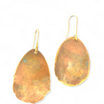 Brincos Jacarandá grandes. Cortados, martelados e oxidados manualmente. Gancho aberto com banho de ouro.