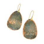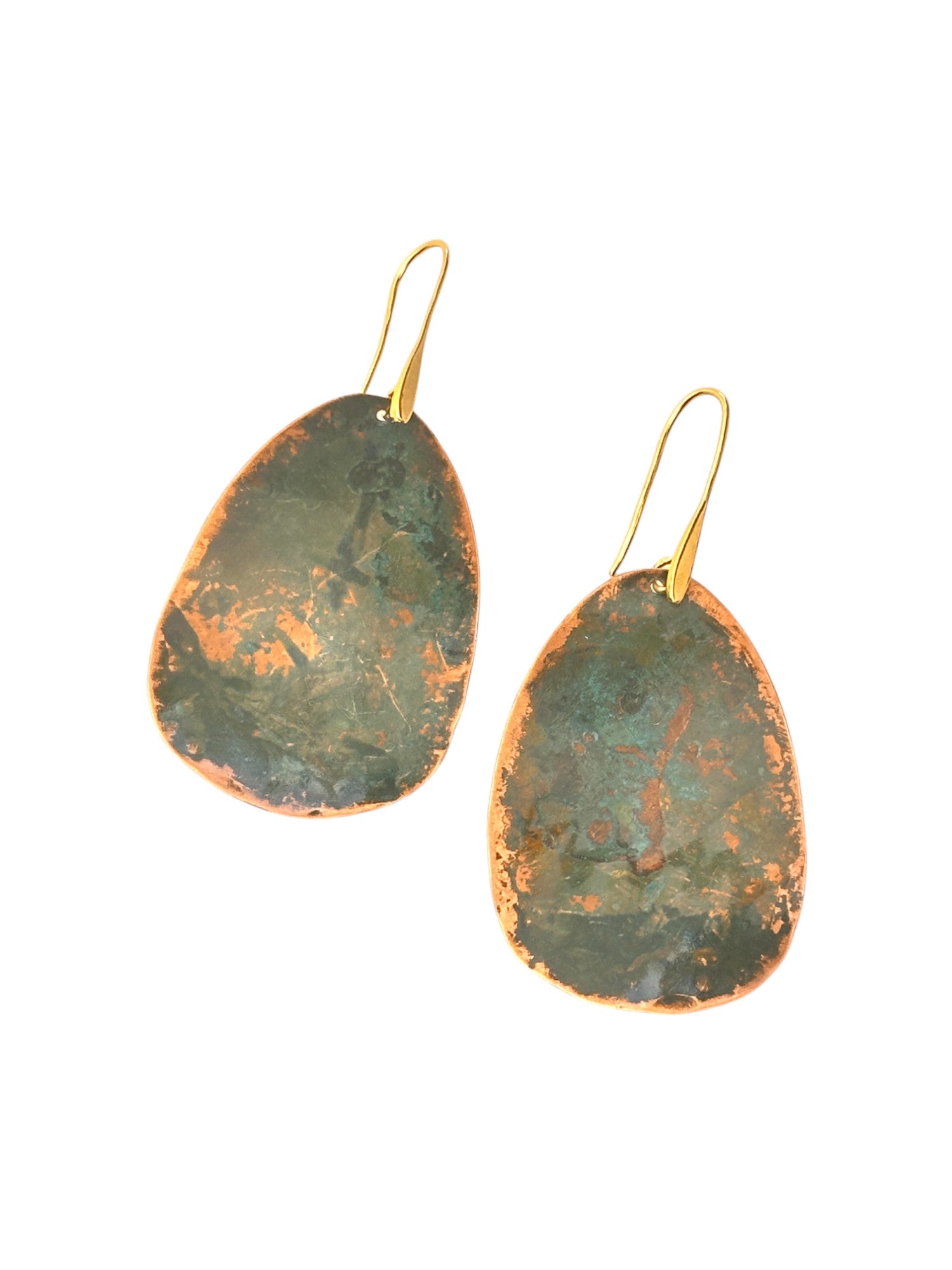 Brincos Jacarandá médio. Cortados, martelados e oxidados manualmente. Gancho aberto com banho de ouro.