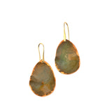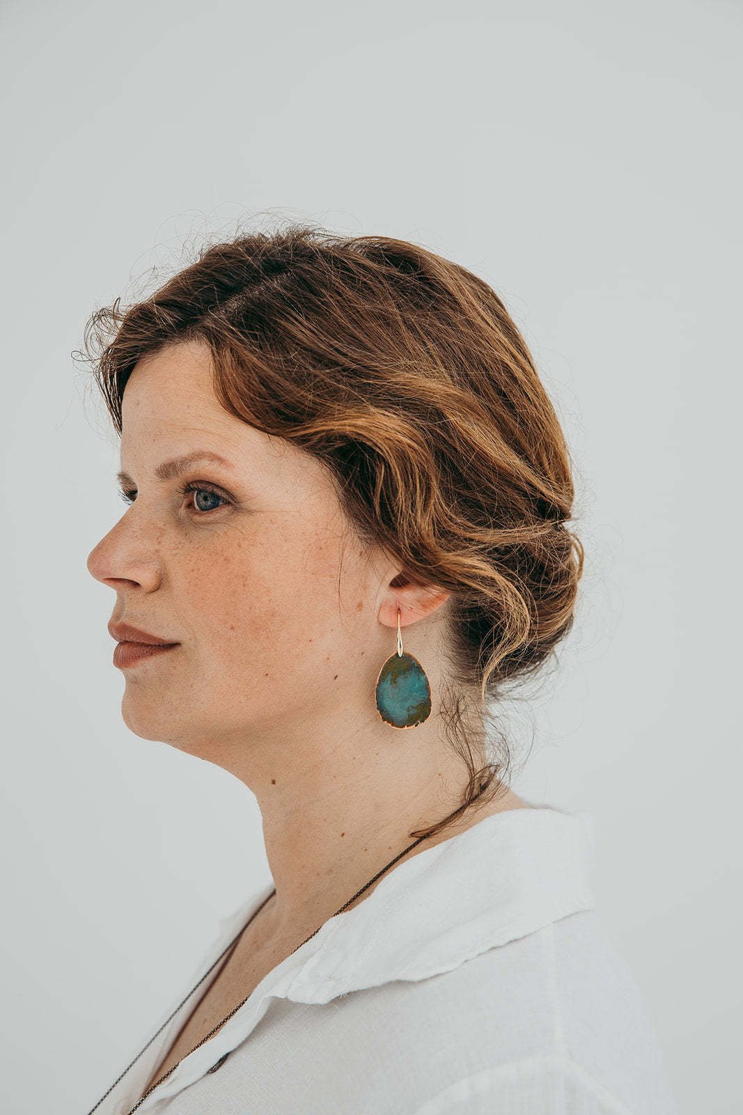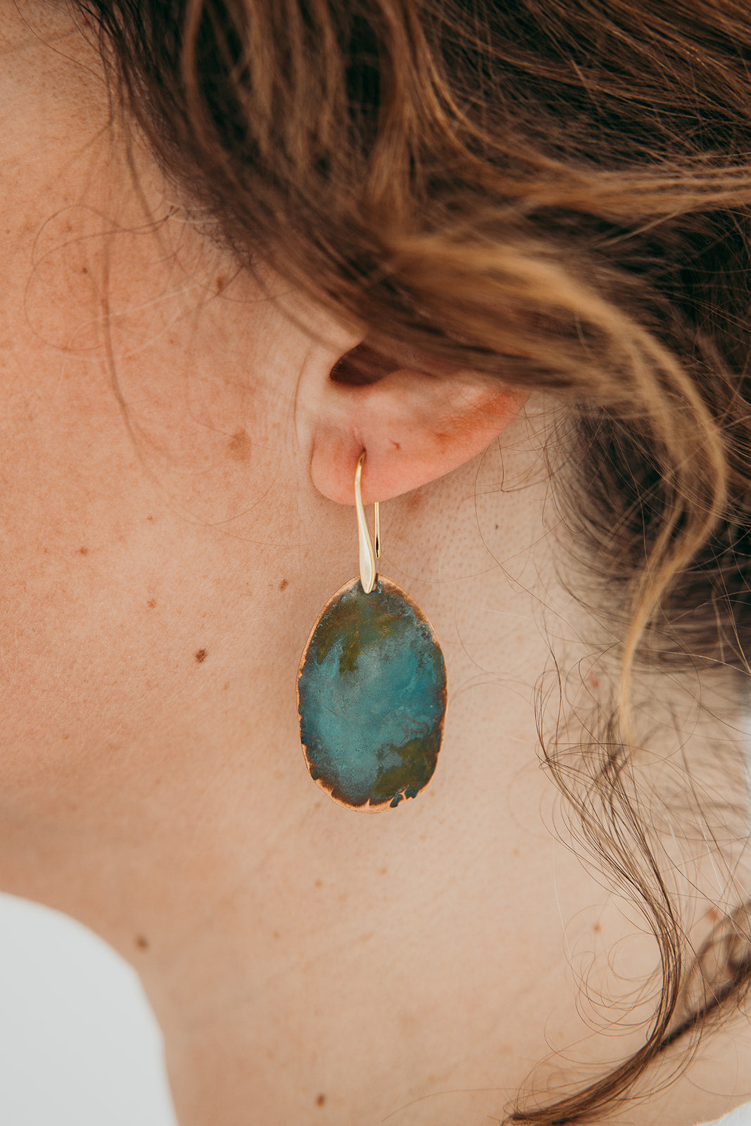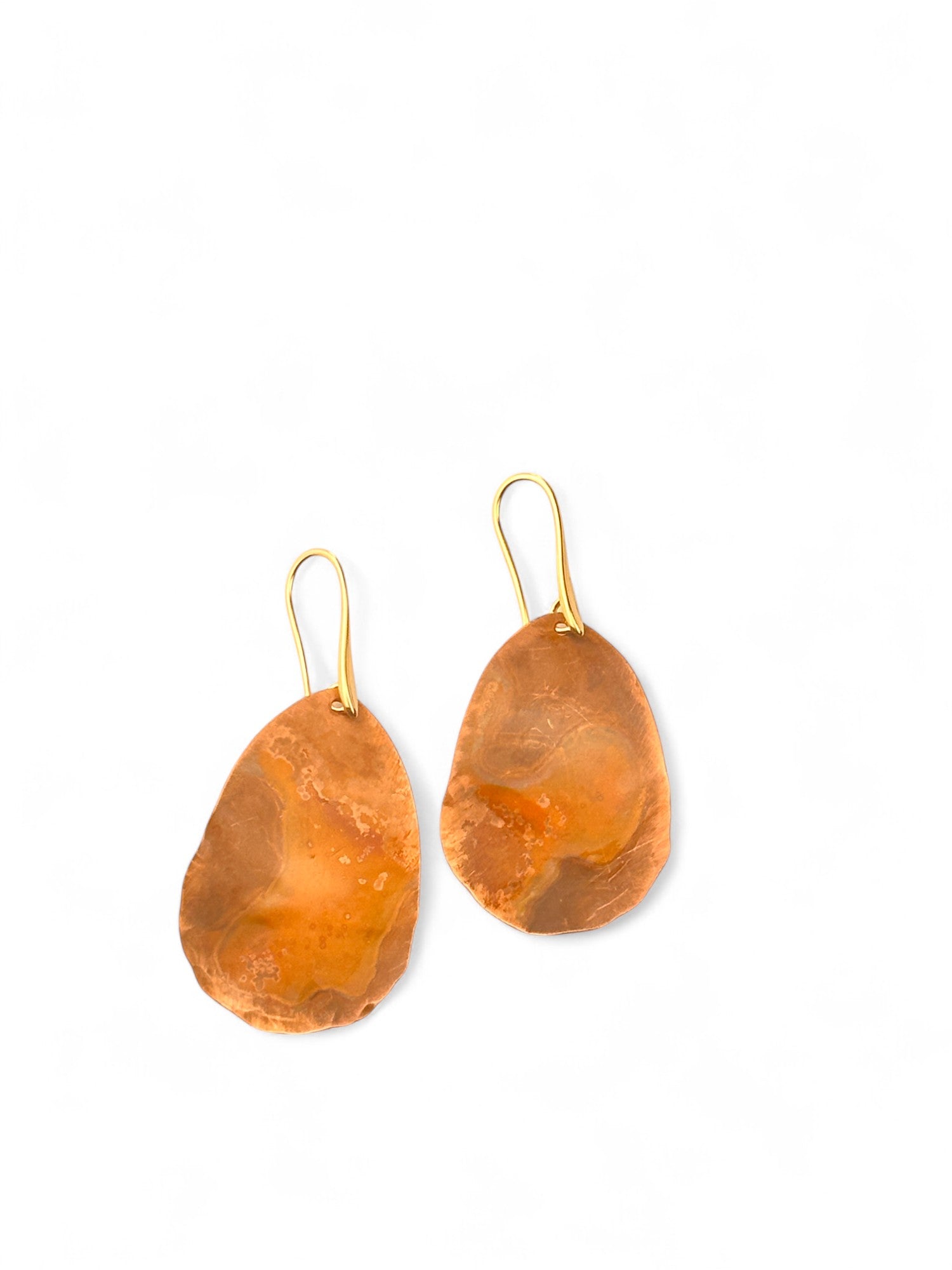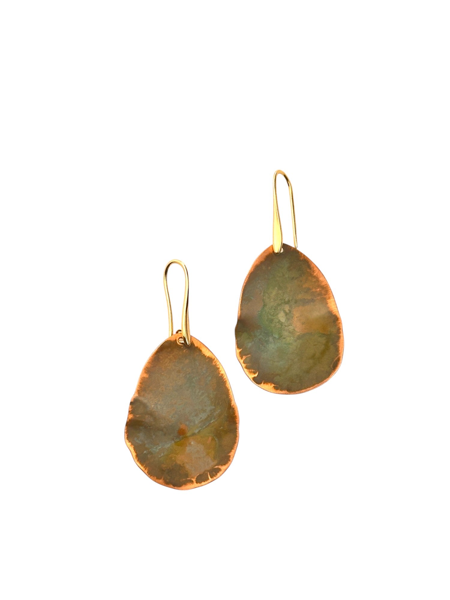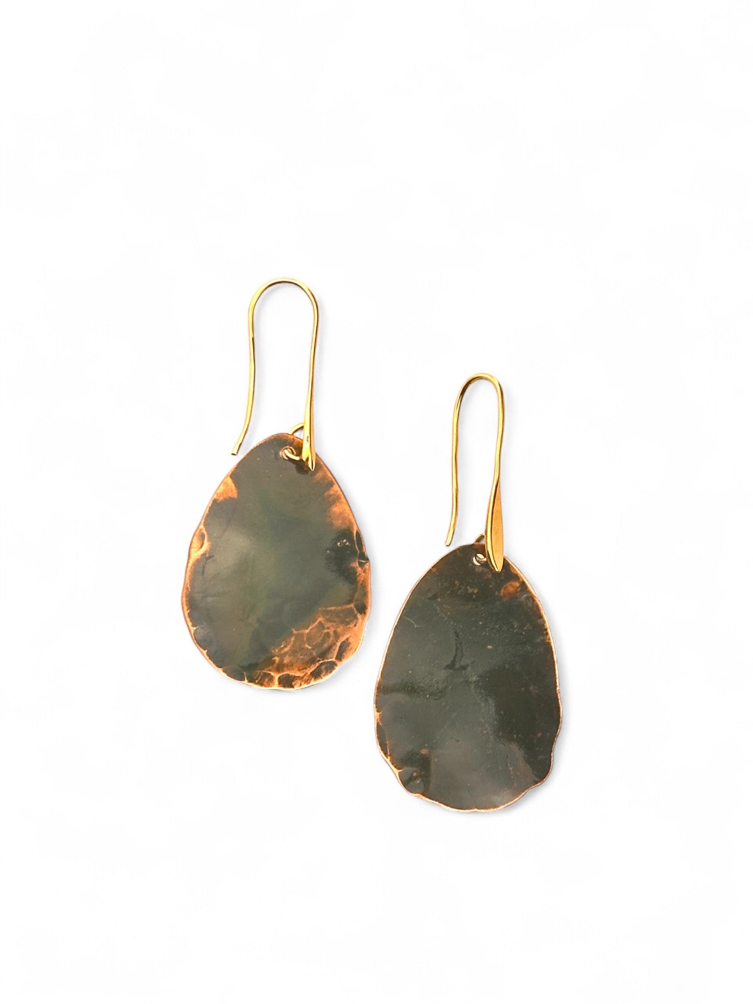 Brincos Jacarandá martelados à mão, com irregularidades e oxidados, com gancho aberto com banho de ouro