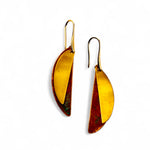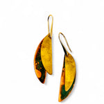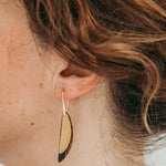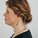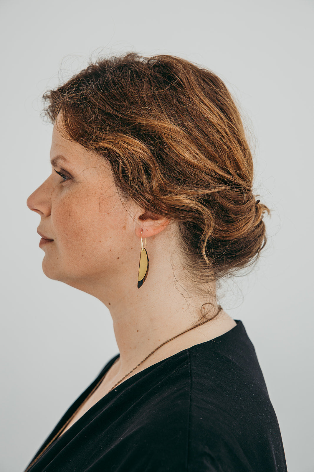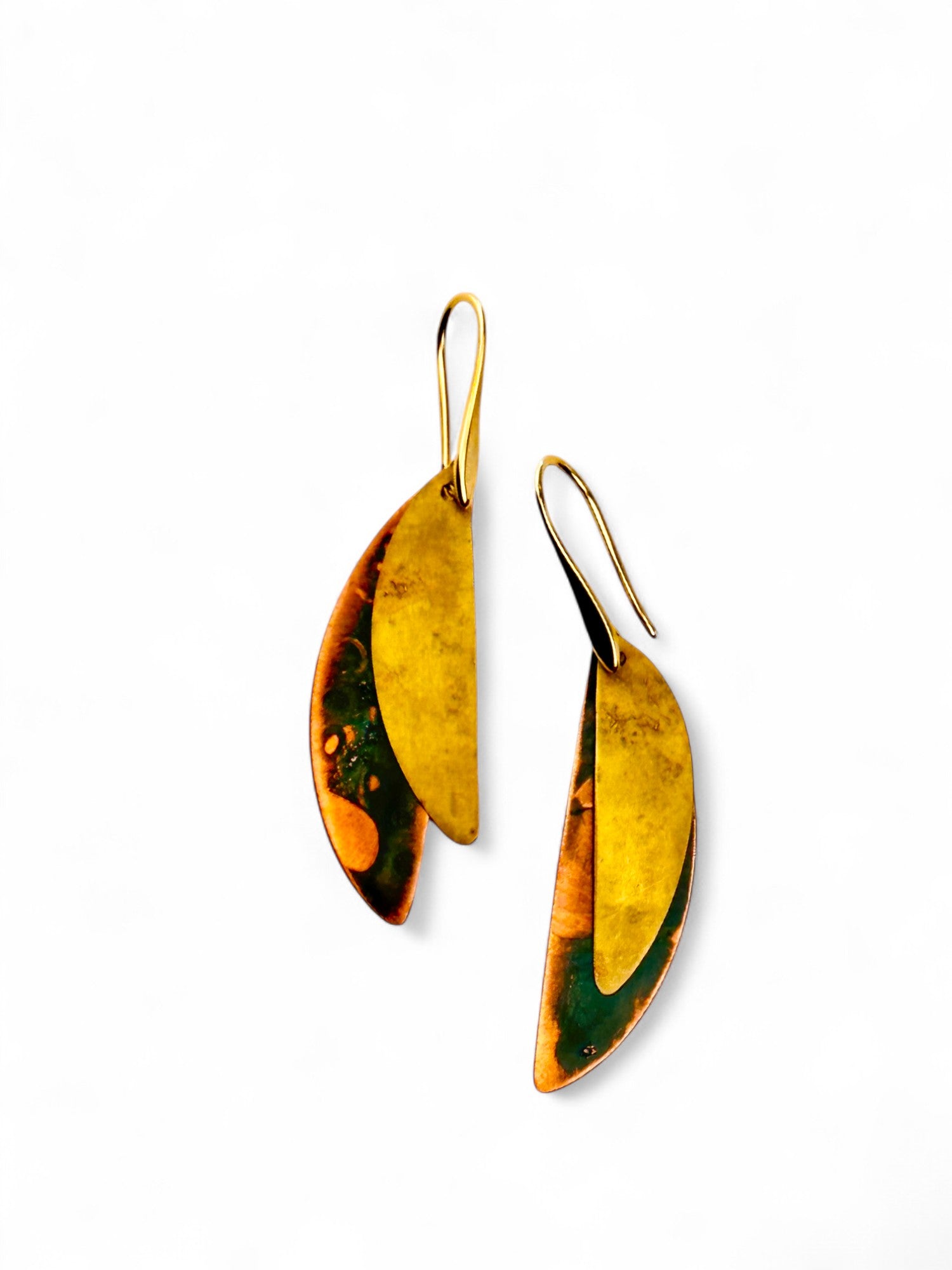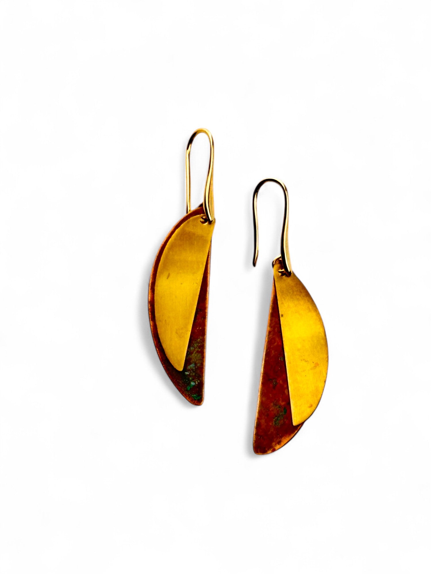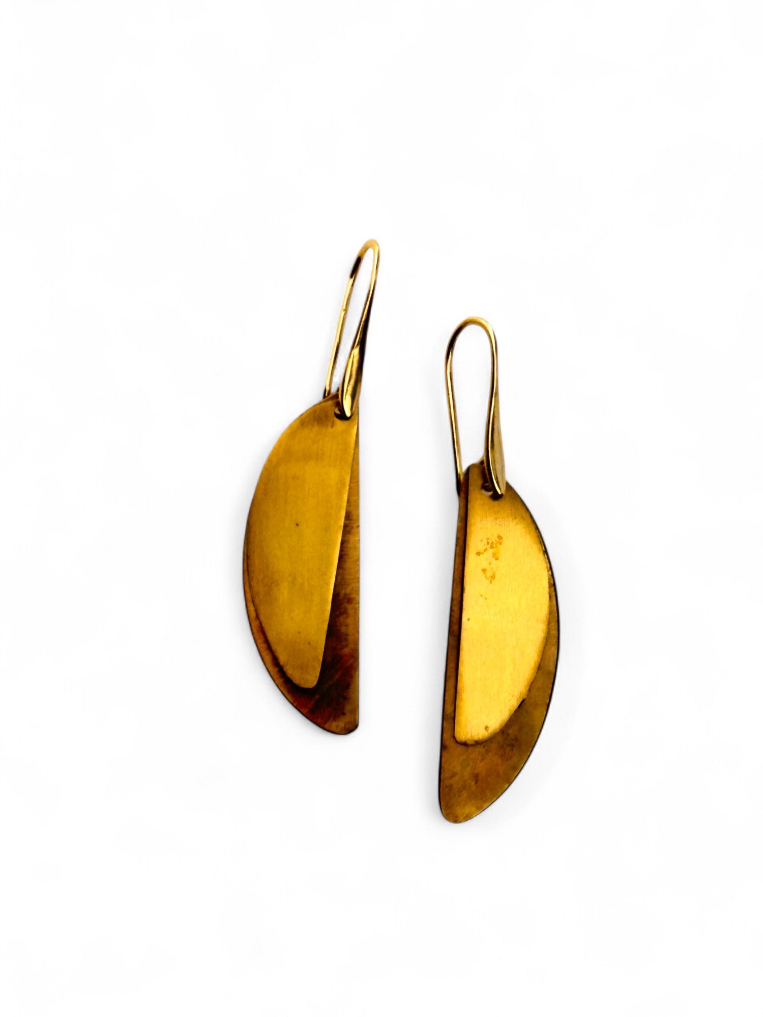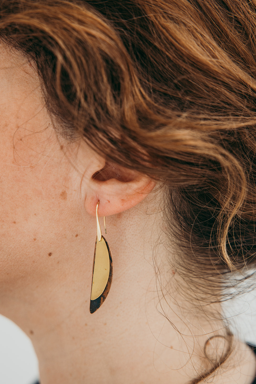 Brincos Lotus pequenos duplos com peça de latão satinado sobreposto. Cortados e oxidados manualmente. Gancho aberto com banho de ouro.