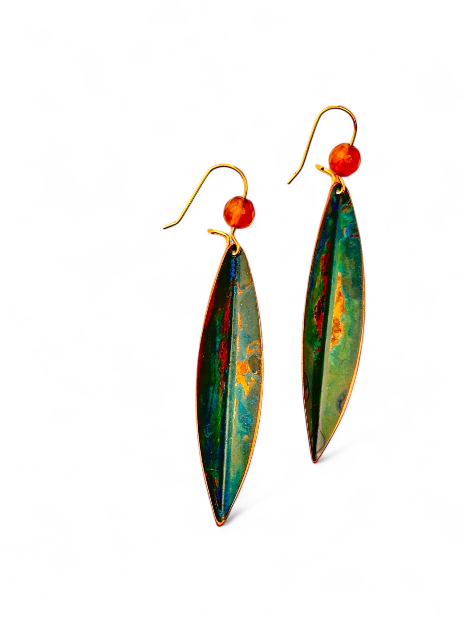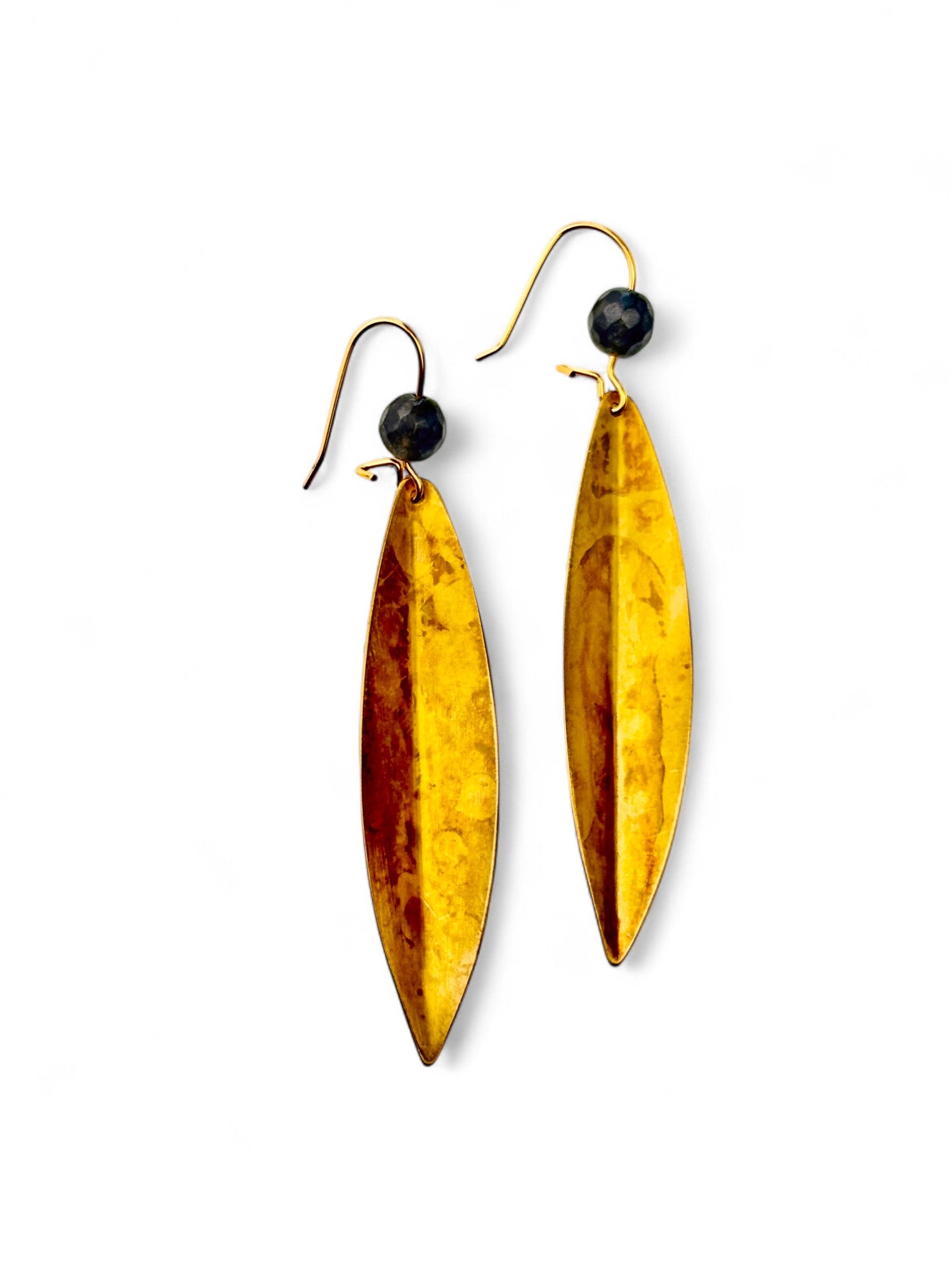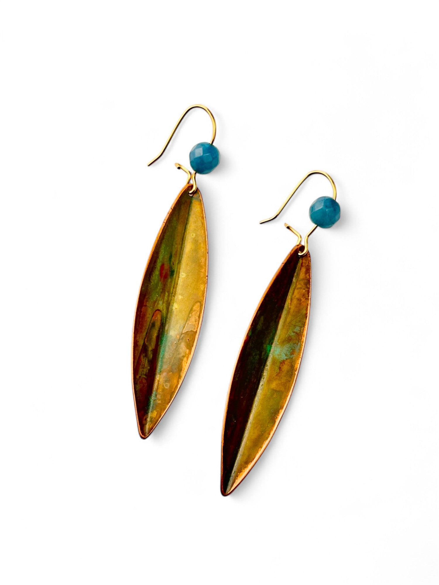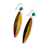 Brincos Olive pequenos, cortados, dobrados e oxidados manualmente. Gancho com banho de ouro.