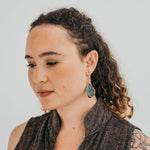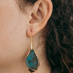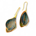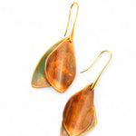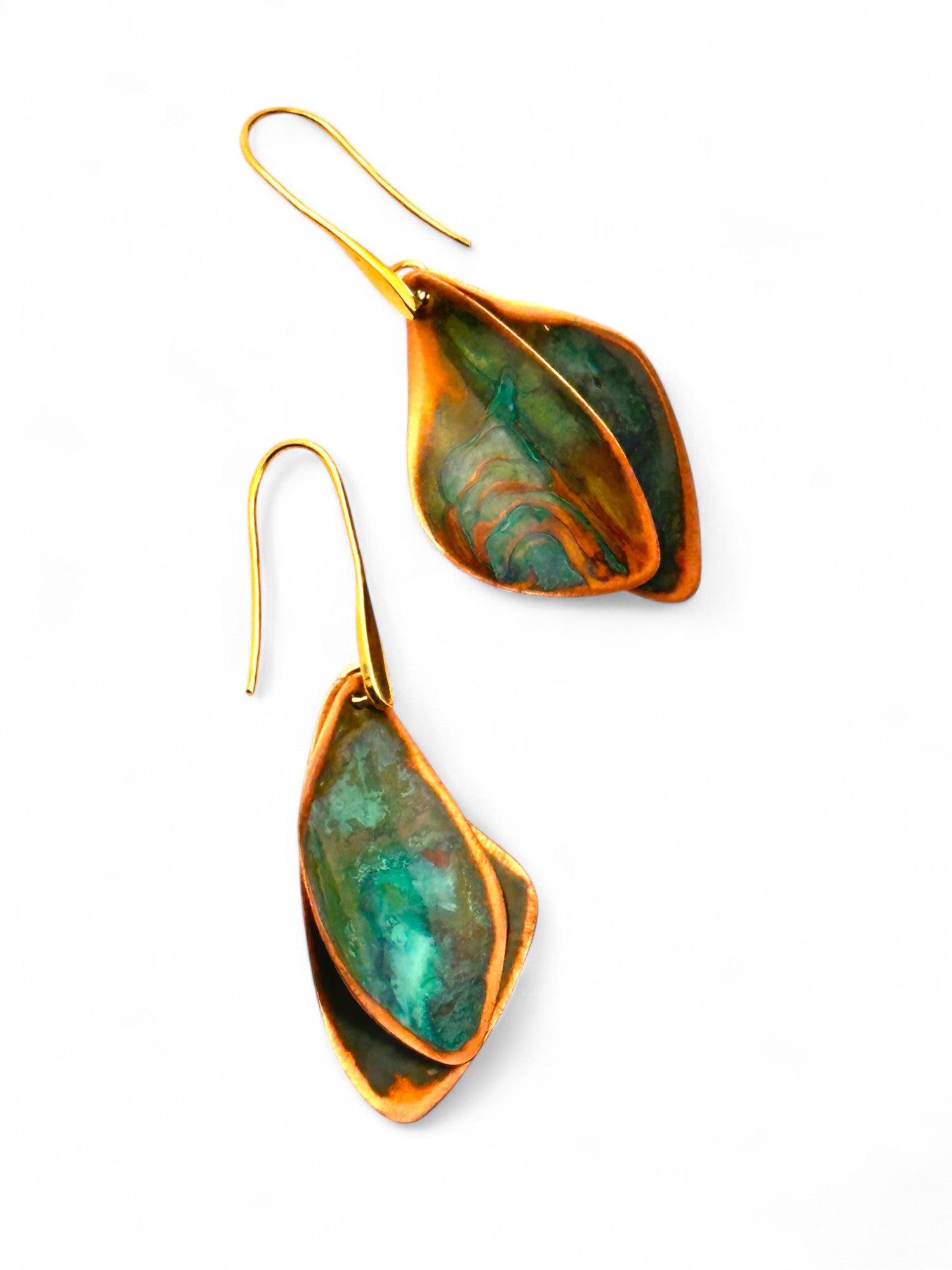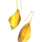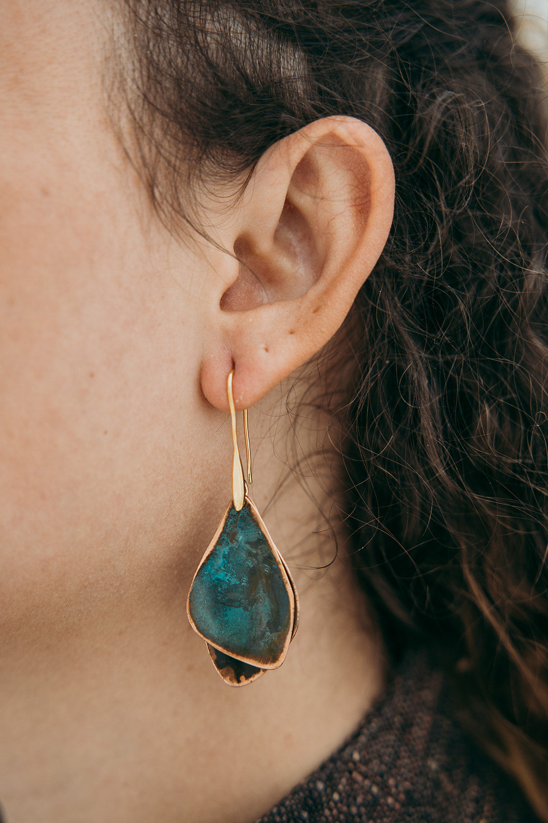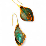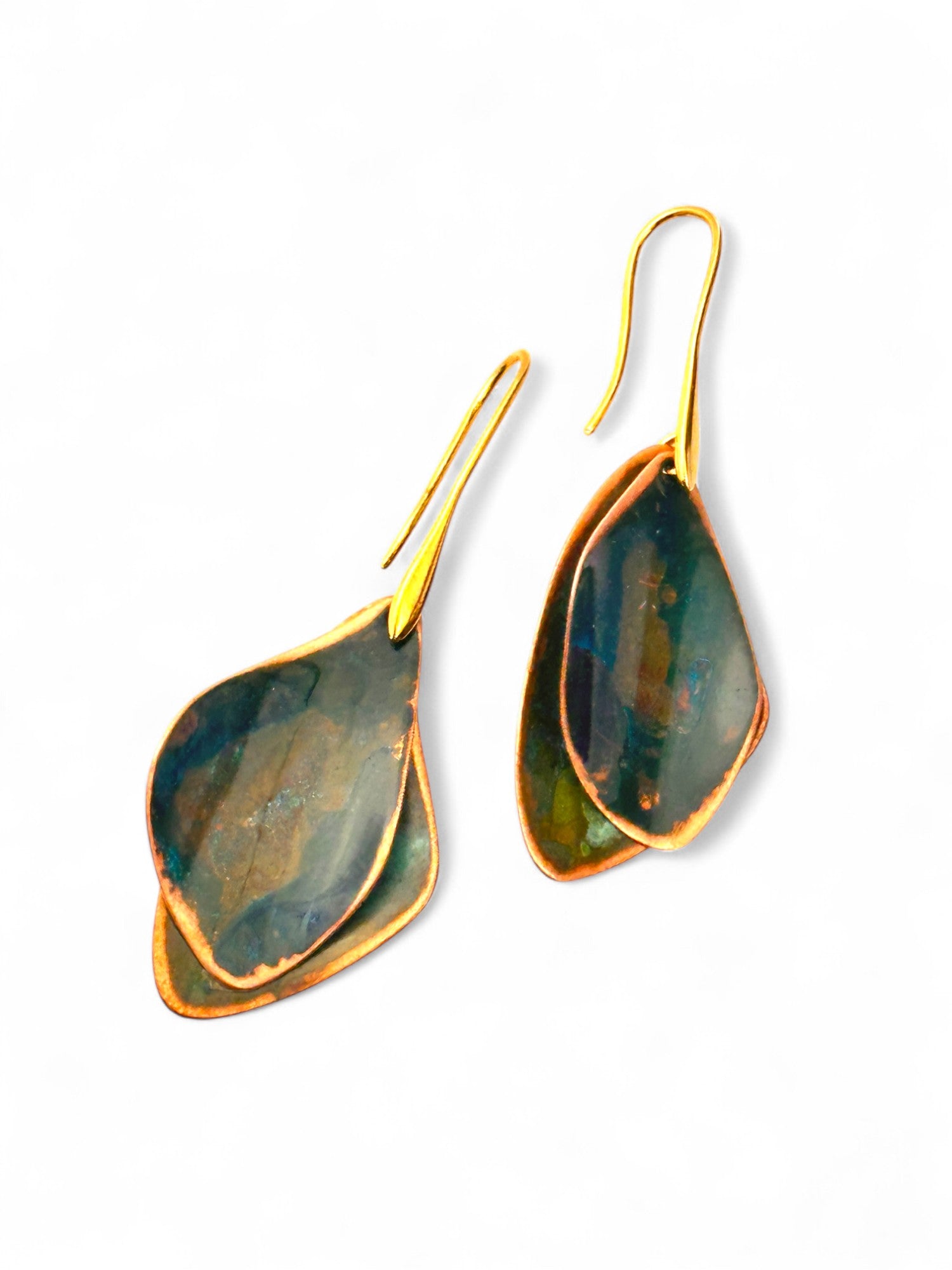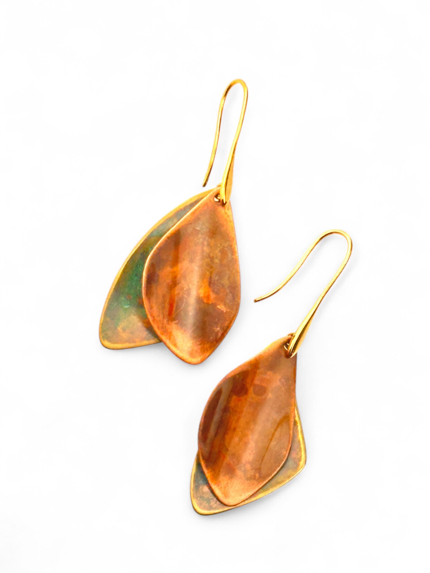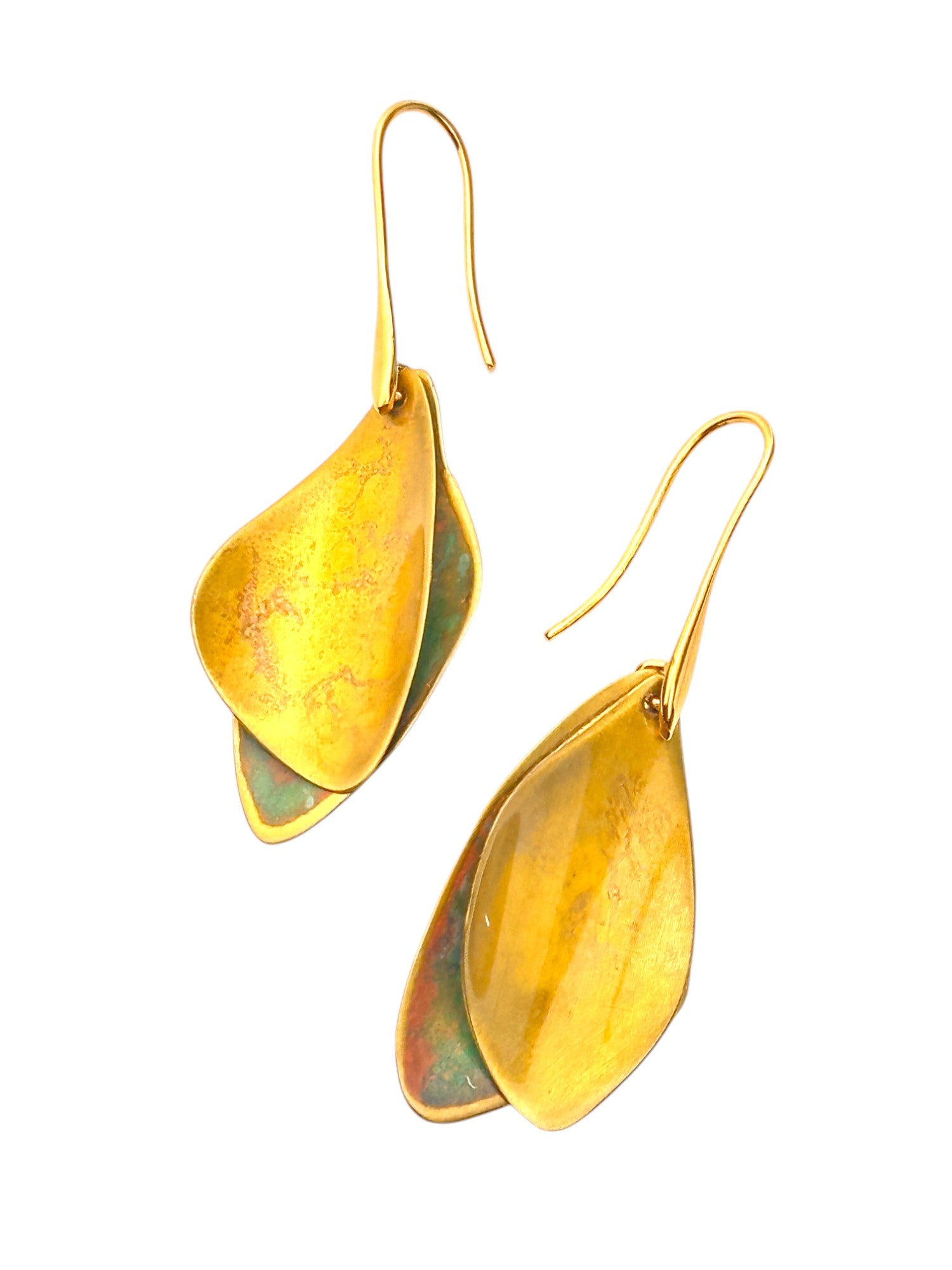 Brincos Petal, com duas chapas metálicas oxidadas e dobradas manualmente. Gancho aberto com banho de ouro