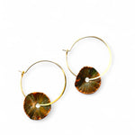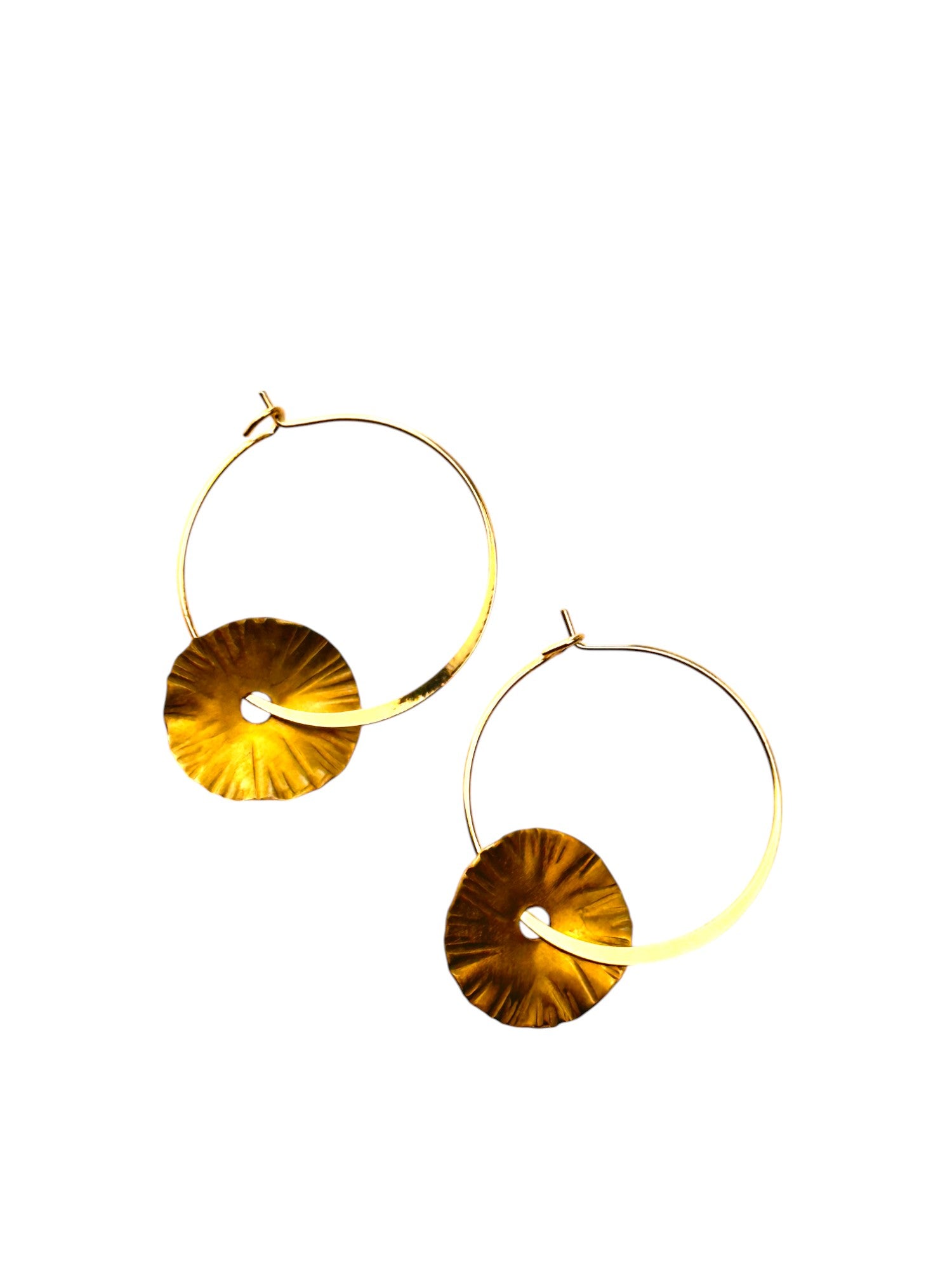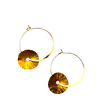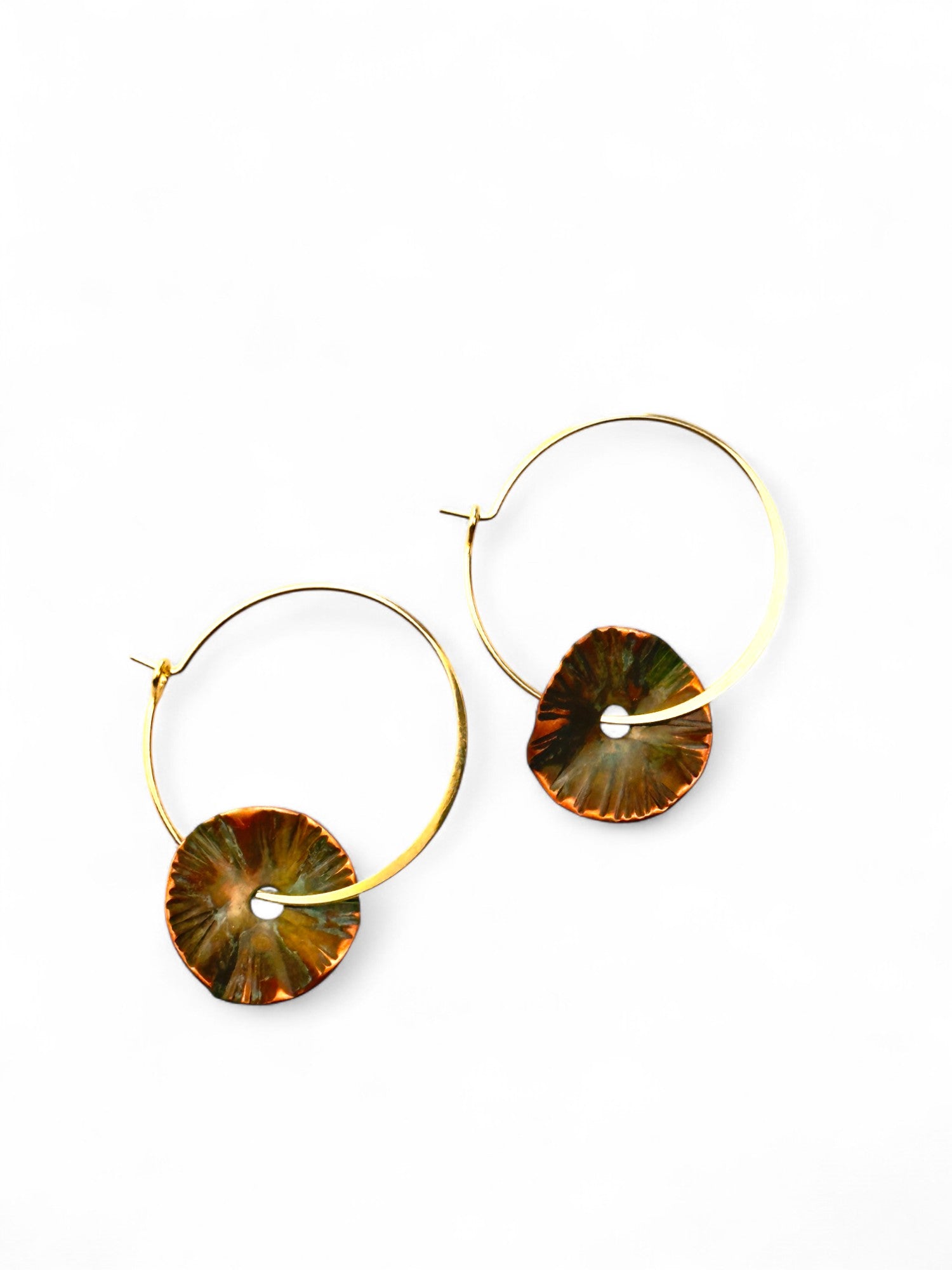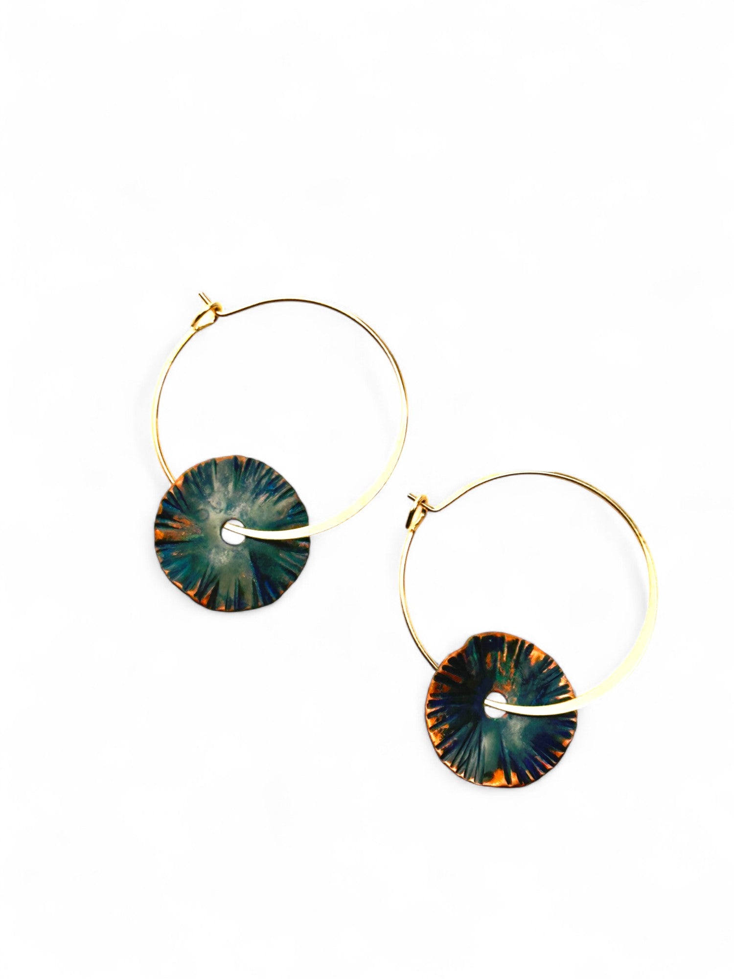 As argolas Spinner mini, são marteladas originando estrias e ondulações desiguais nas chapas. Oxidado e cortado manualmente. Argola fechada banhada a ouro.