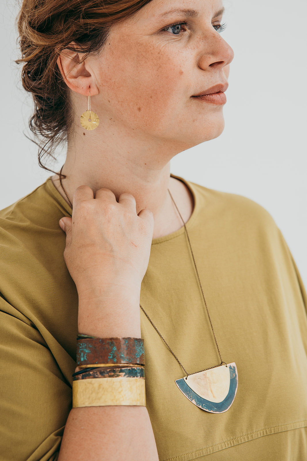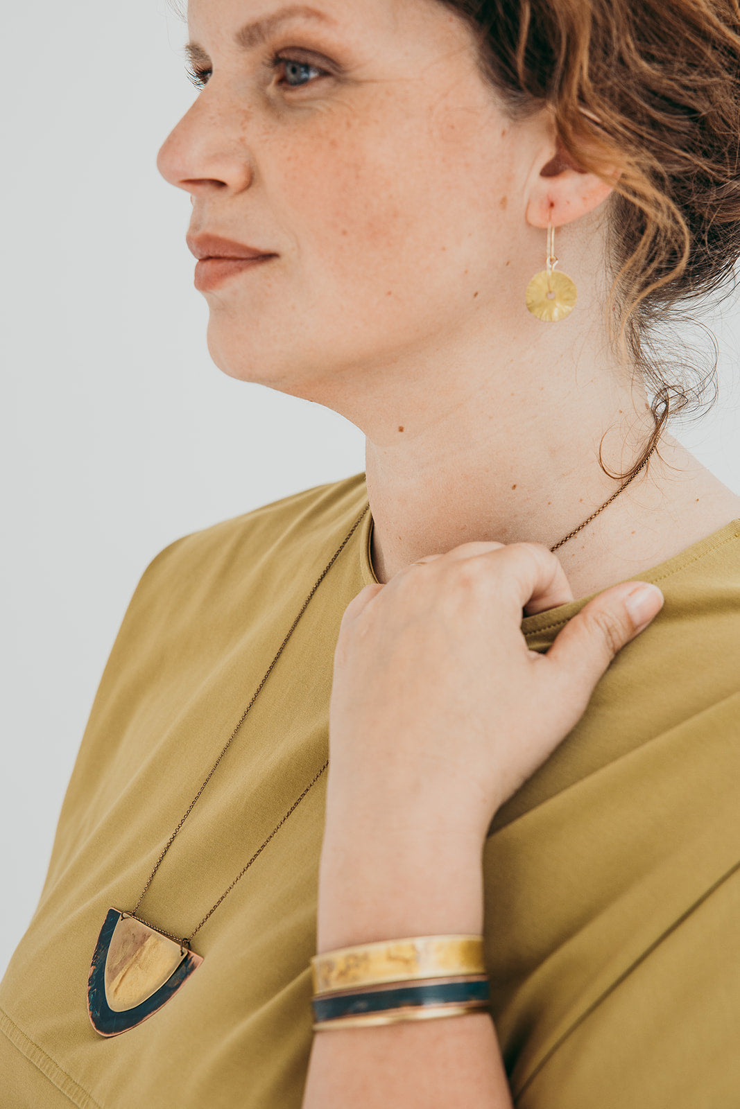 A imagem principal do produto mostra a peça disponível para compra, mas procuramos sempre incluir uma fotografia de contexto, com a peça usada por uma modelo ou em cenário. Essa foto pode não corresponder exatamente à peça que que receberá, podendo ser de outro metal ou de uma tonalidade diferente de oxidação; serve apenas como exemplo de como a peça fica no uso.