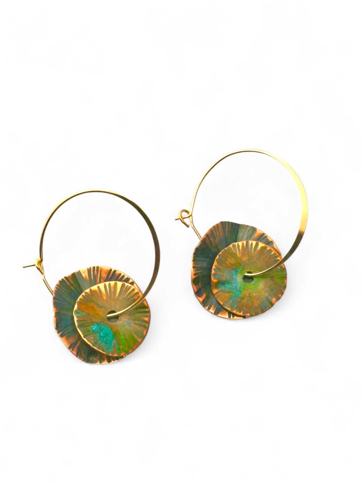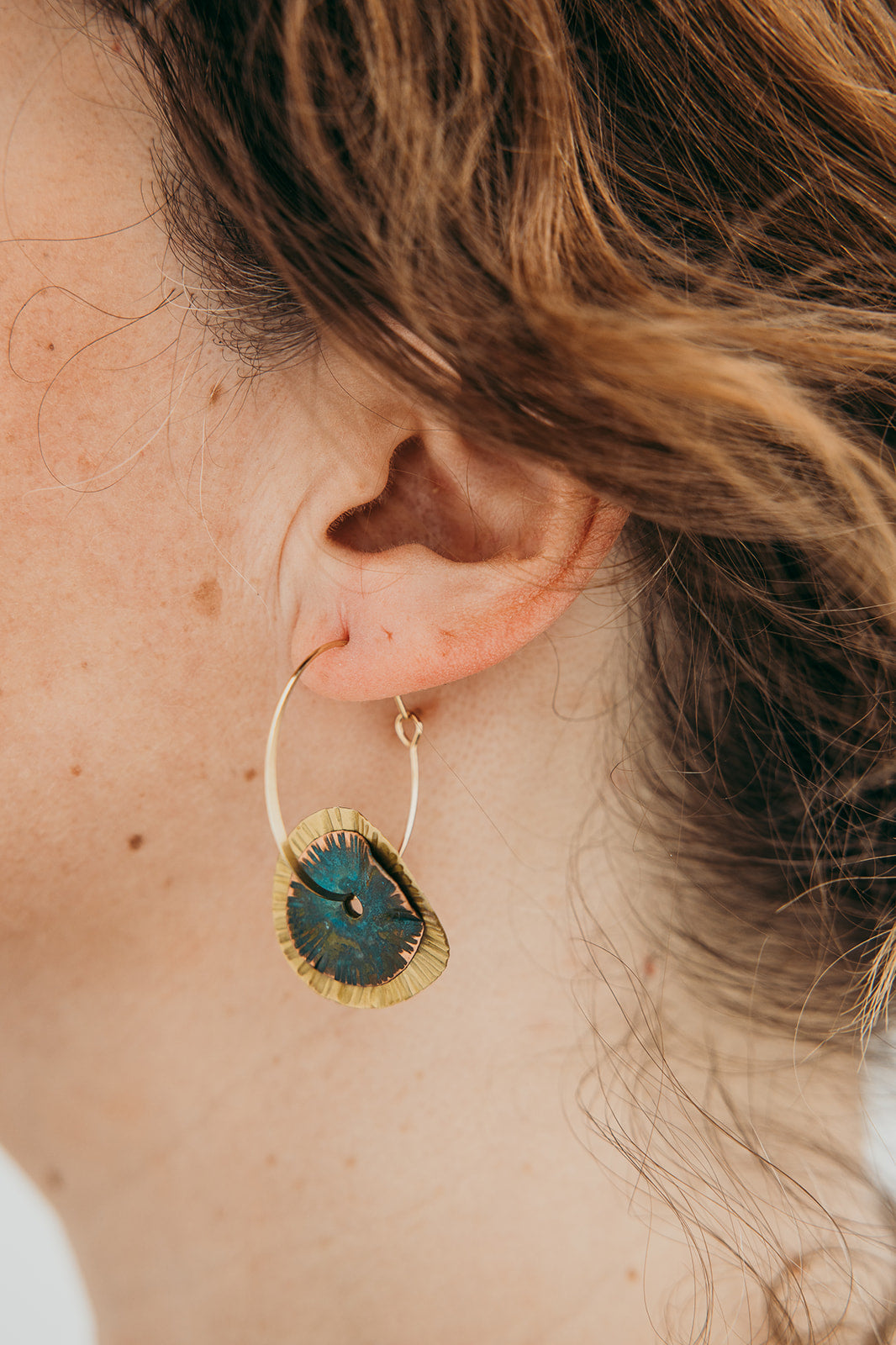 As argolas Spinner são marteladas originando estrias e ondulações desiguais nas chapas. Oxidado e cortado manualmente. Argola fechada banhada a ouro