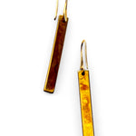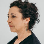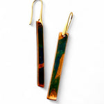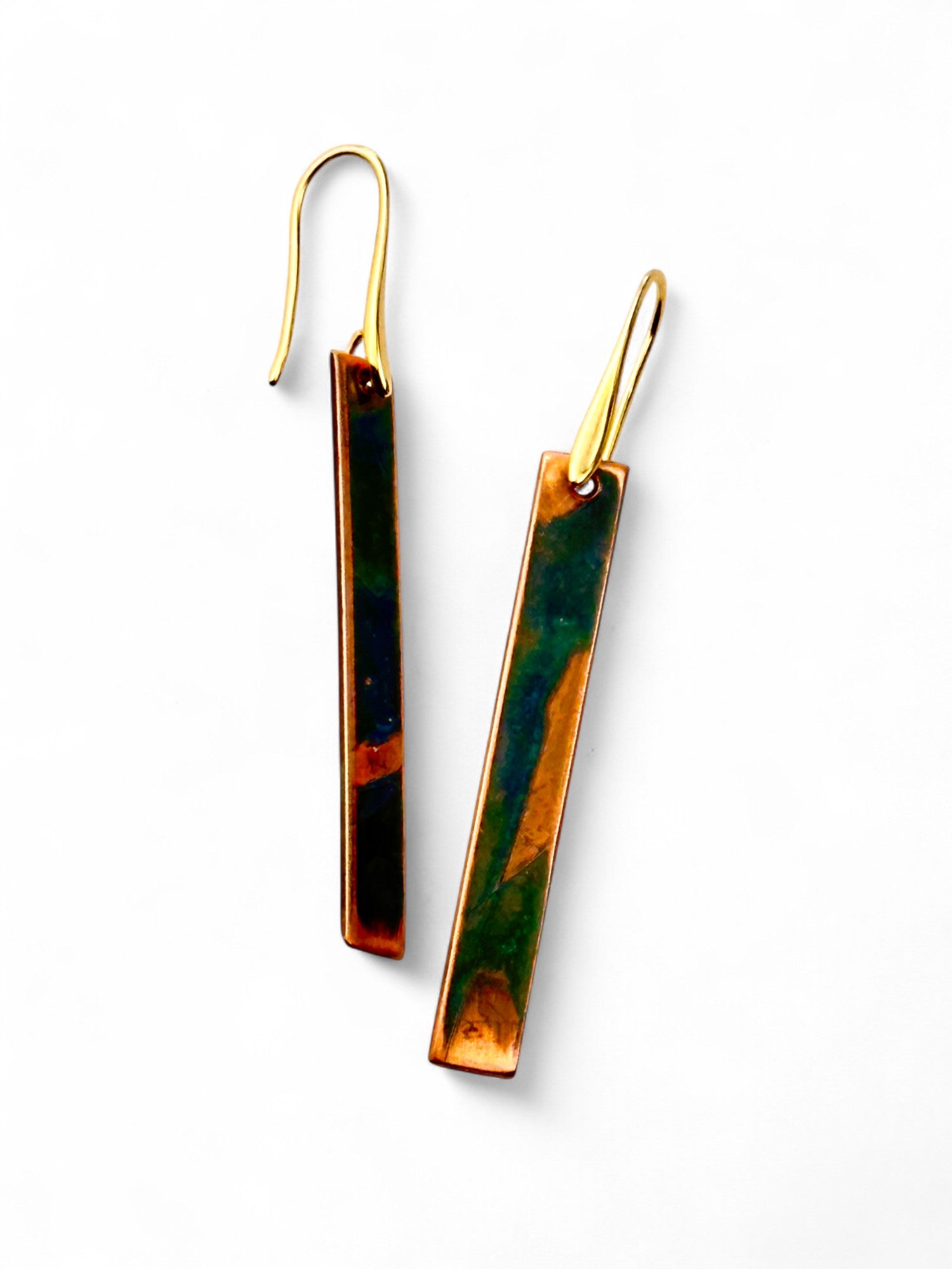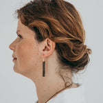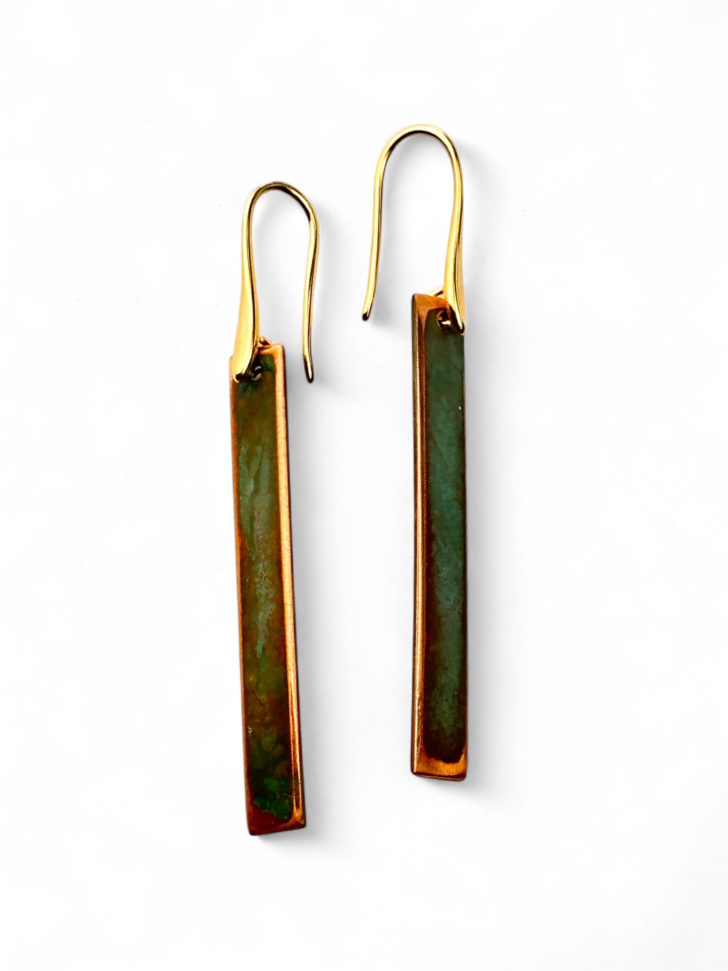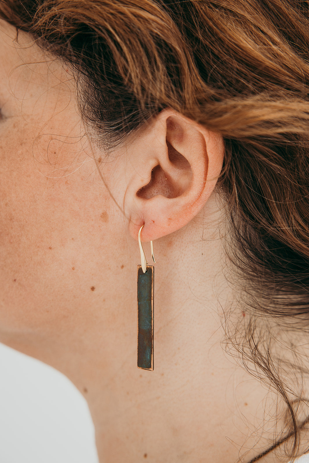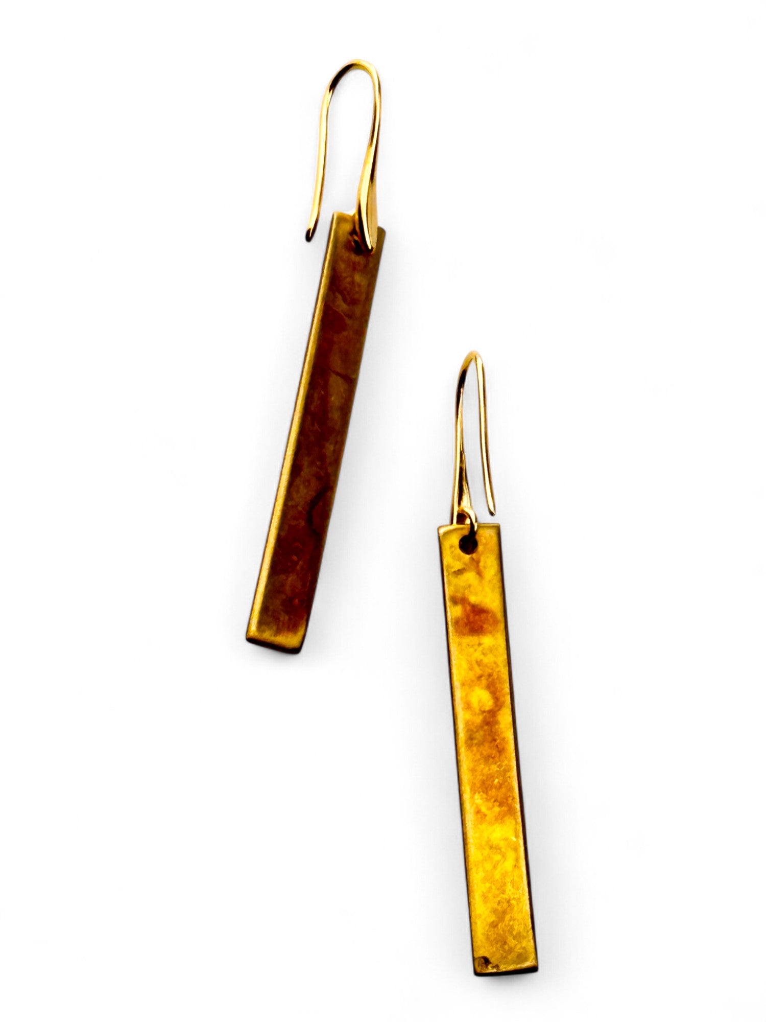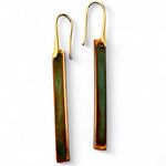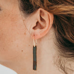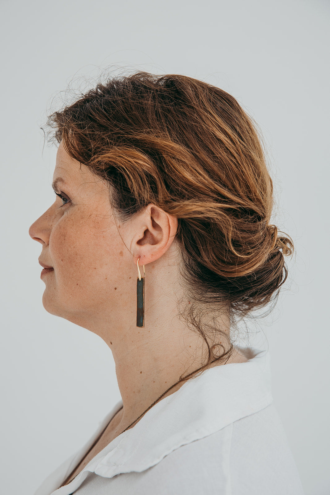 Os brincos Tribu Slim compridos, são cortados e oxidados manualmente. Gancho aberto com banho de ouro.