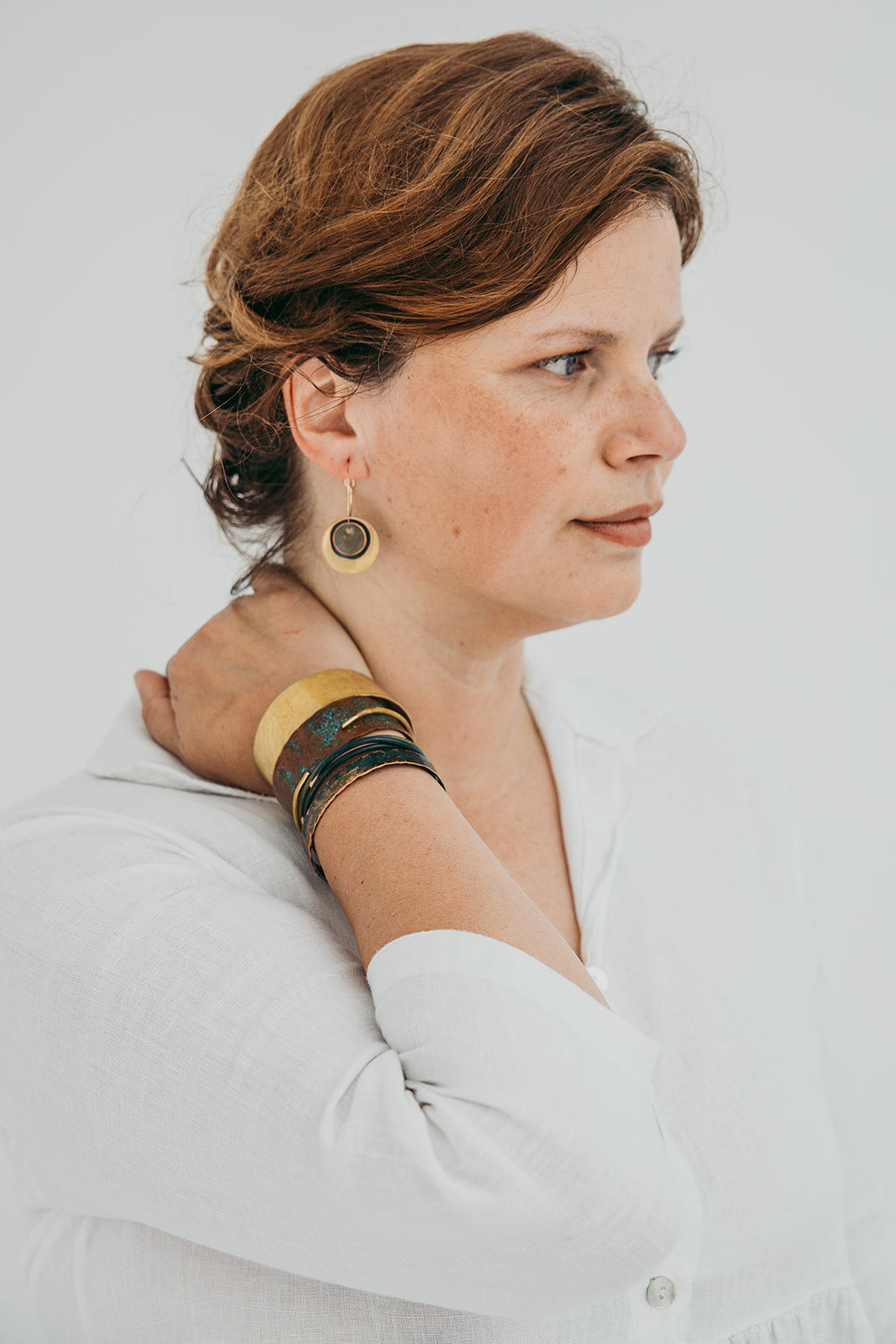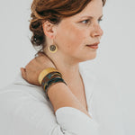 A imagem principal do produto mostra a peça disponível para compra, mas procuramos sempre incluir uma fotografia de contexto, com a peça usada por uma modelo ou em cenário. Essa foto pode não corresponder exatamente à peça que que receberá, podendo ser de outro metal ou de uma tonalidade diferente de oxidação; serve apenas como exemplo de como a peça fica no uso.