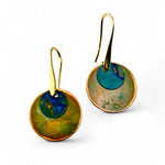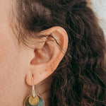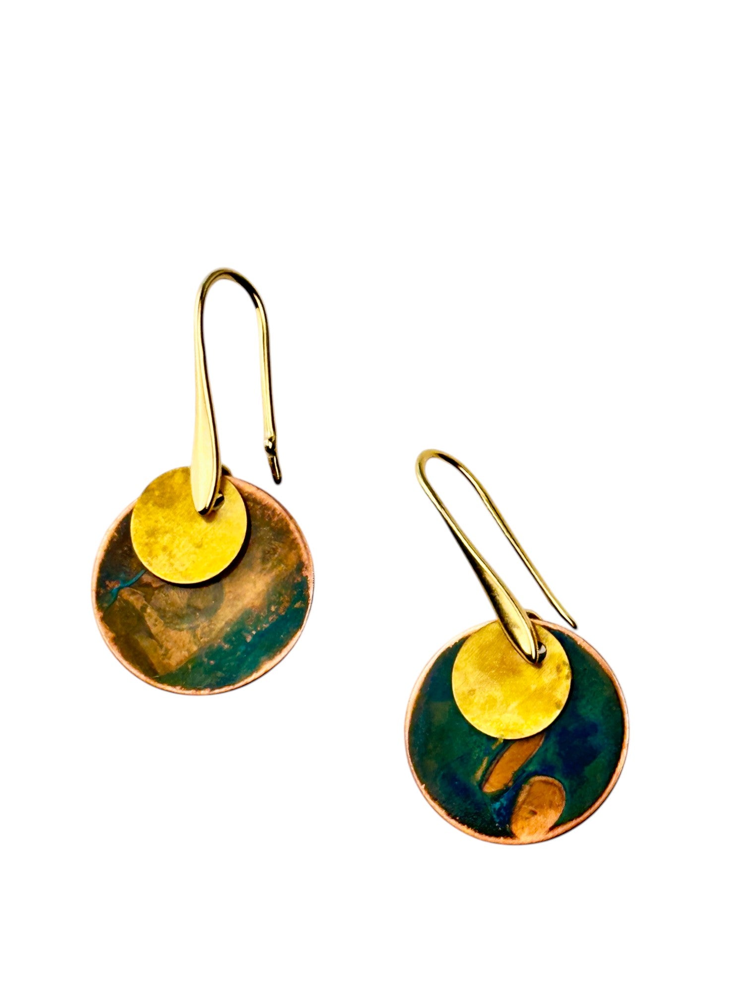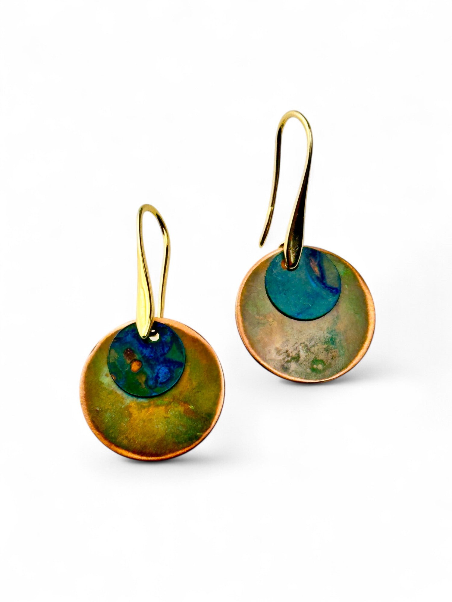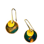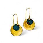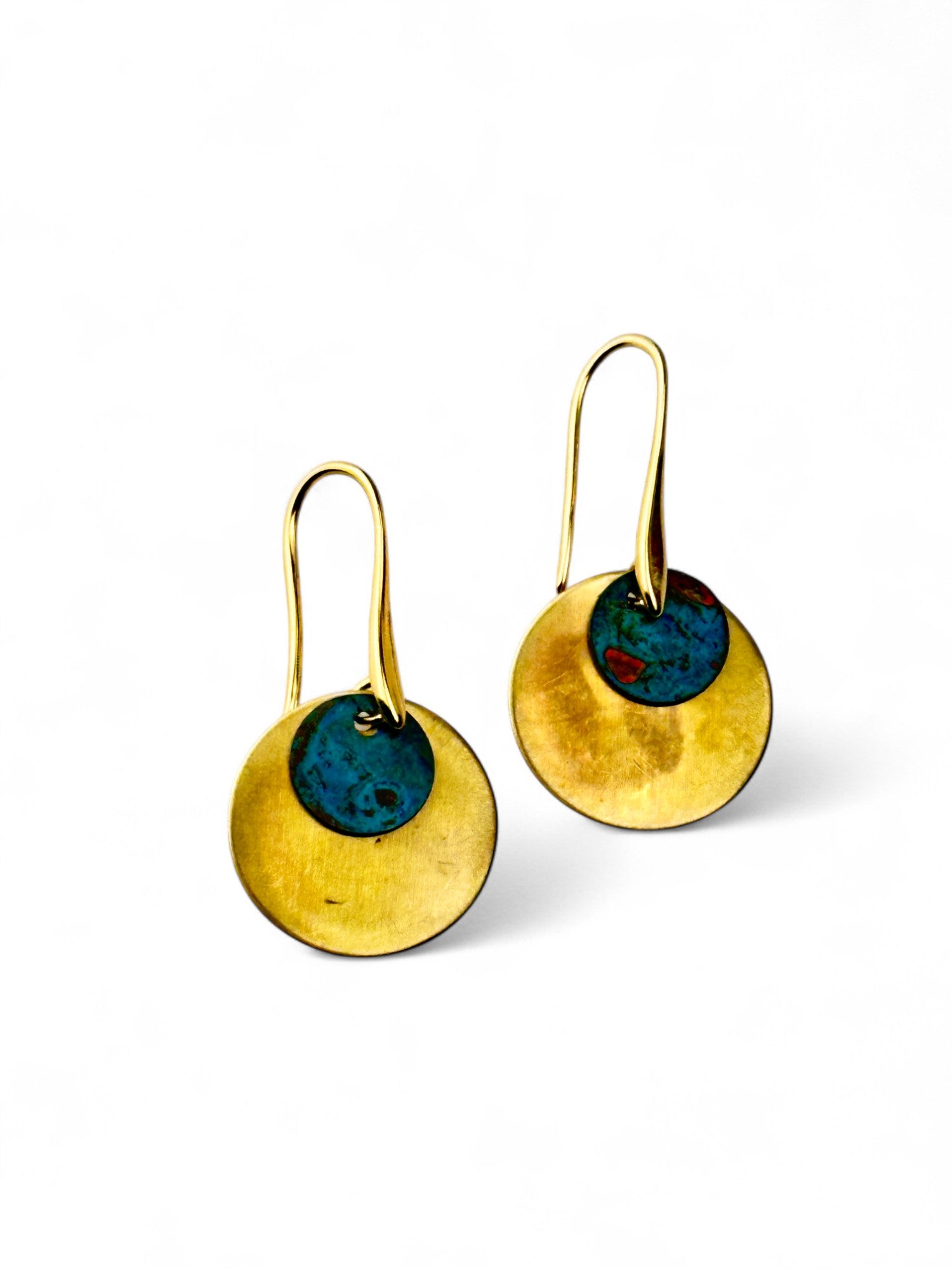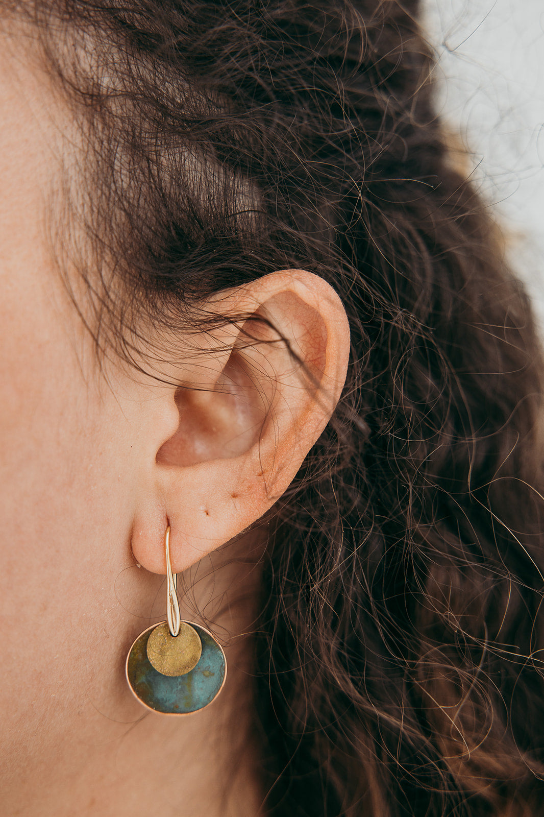 Brincos com duas chapas mini, sobrepostas, oxidadas com gancho aberto com banho de ouro
