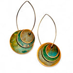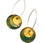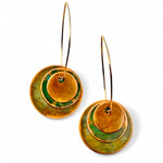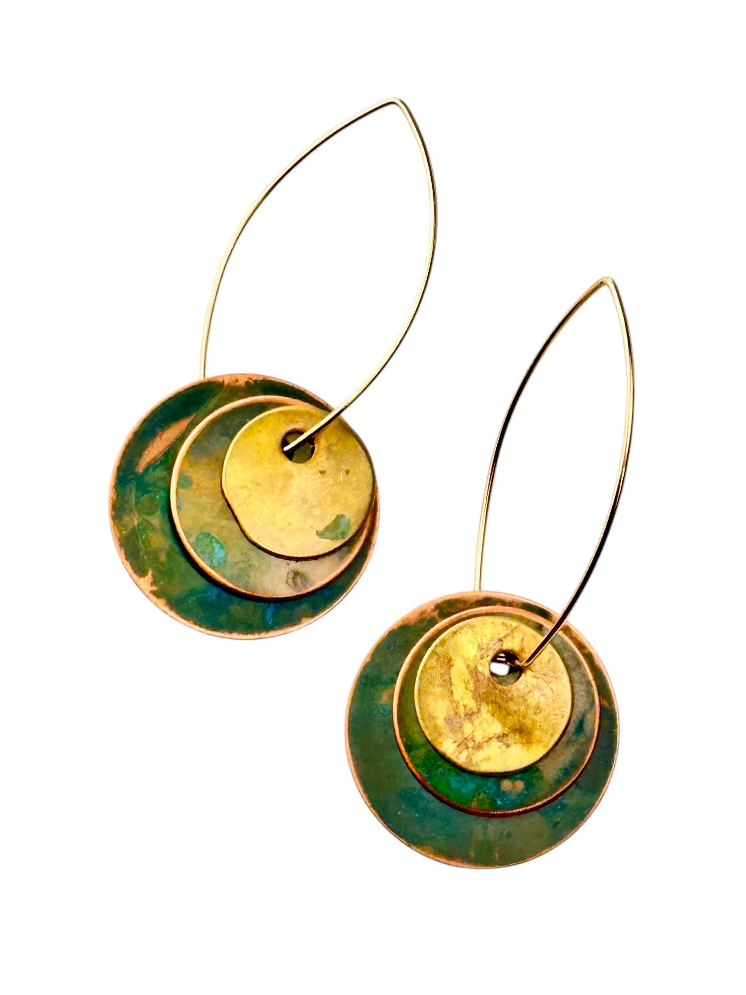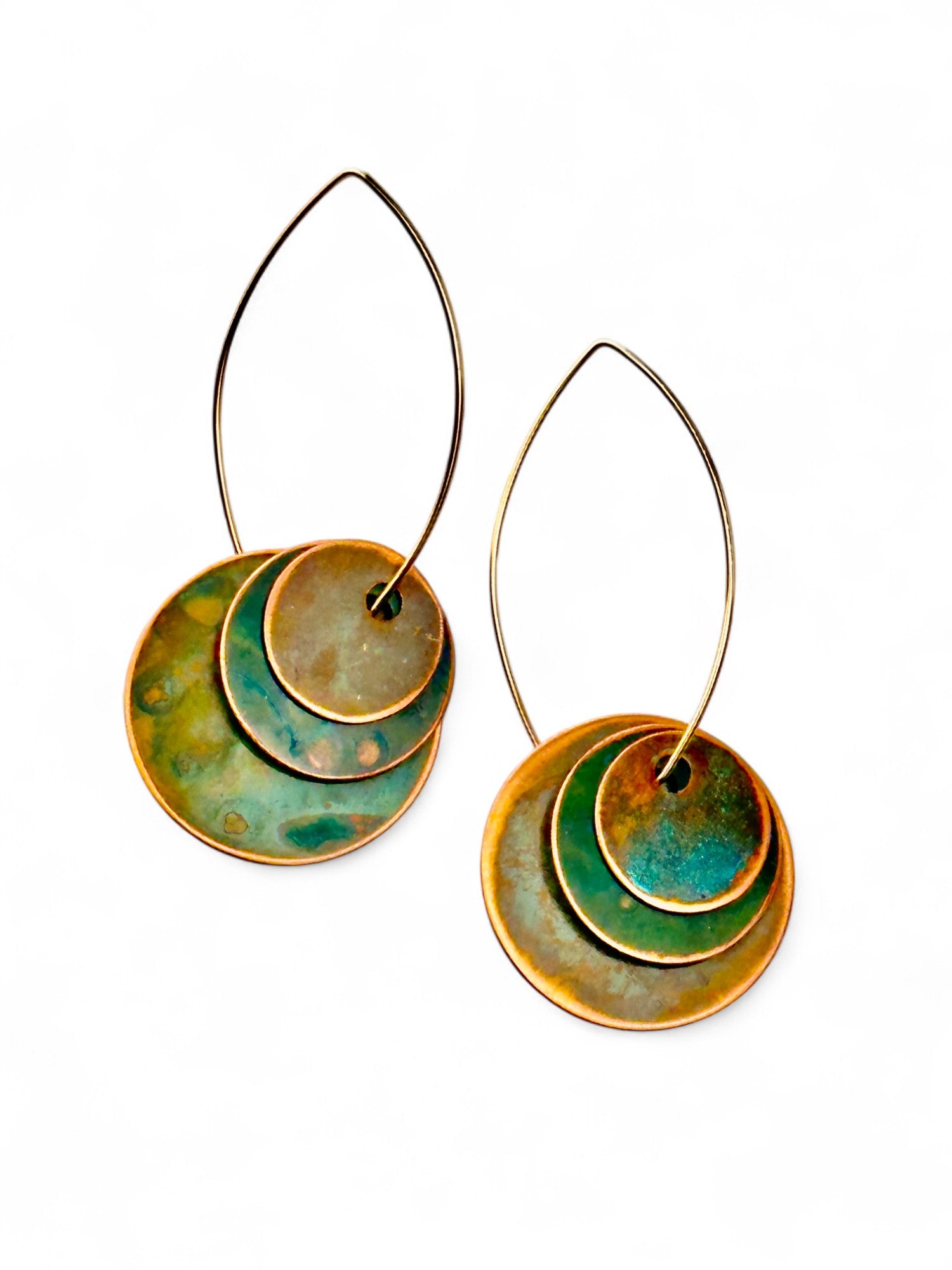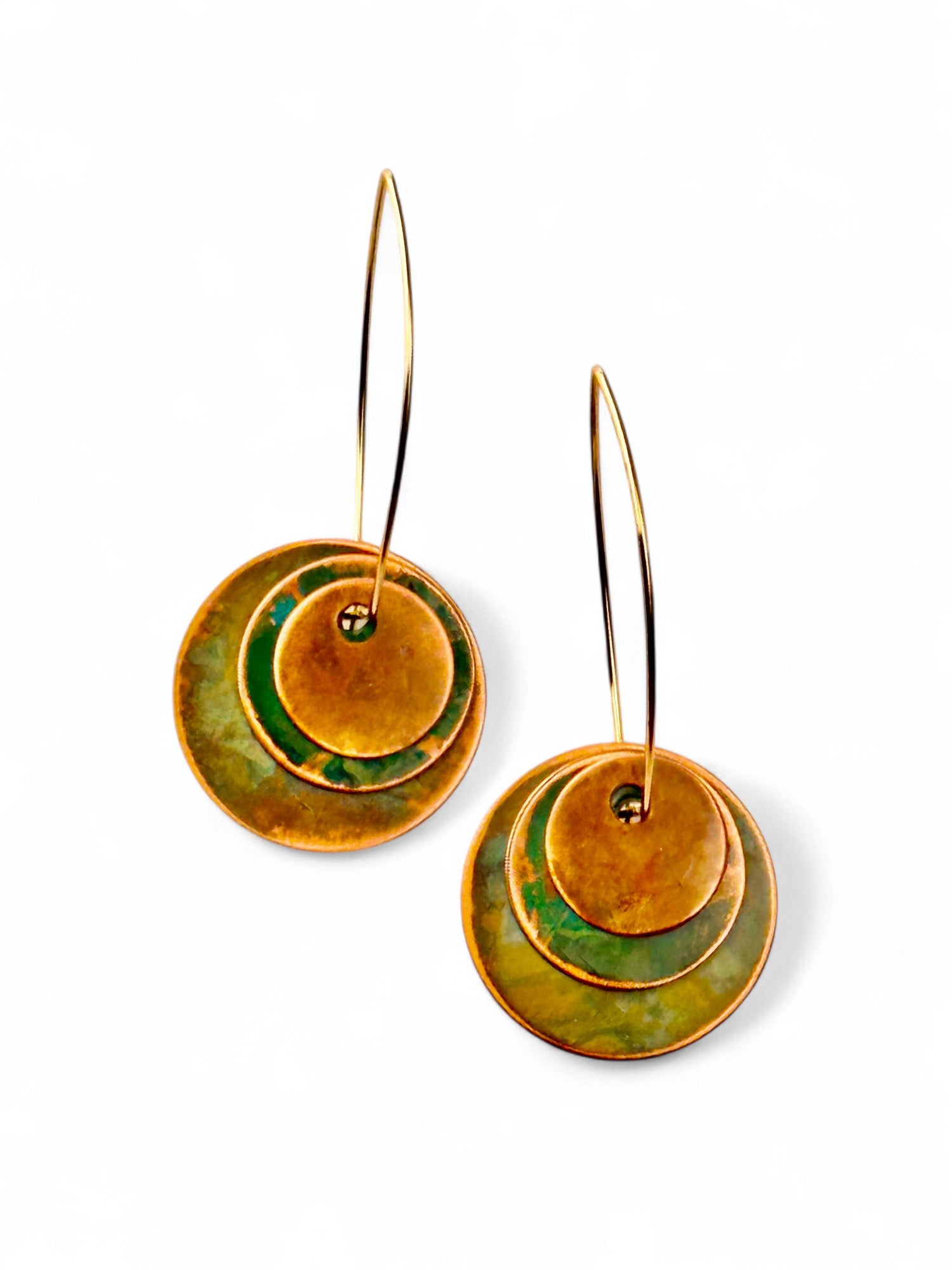 Brincos com três discos Hoiko Basic, com discos oxidados. Gancho comprido fechado com banho de ouro.