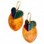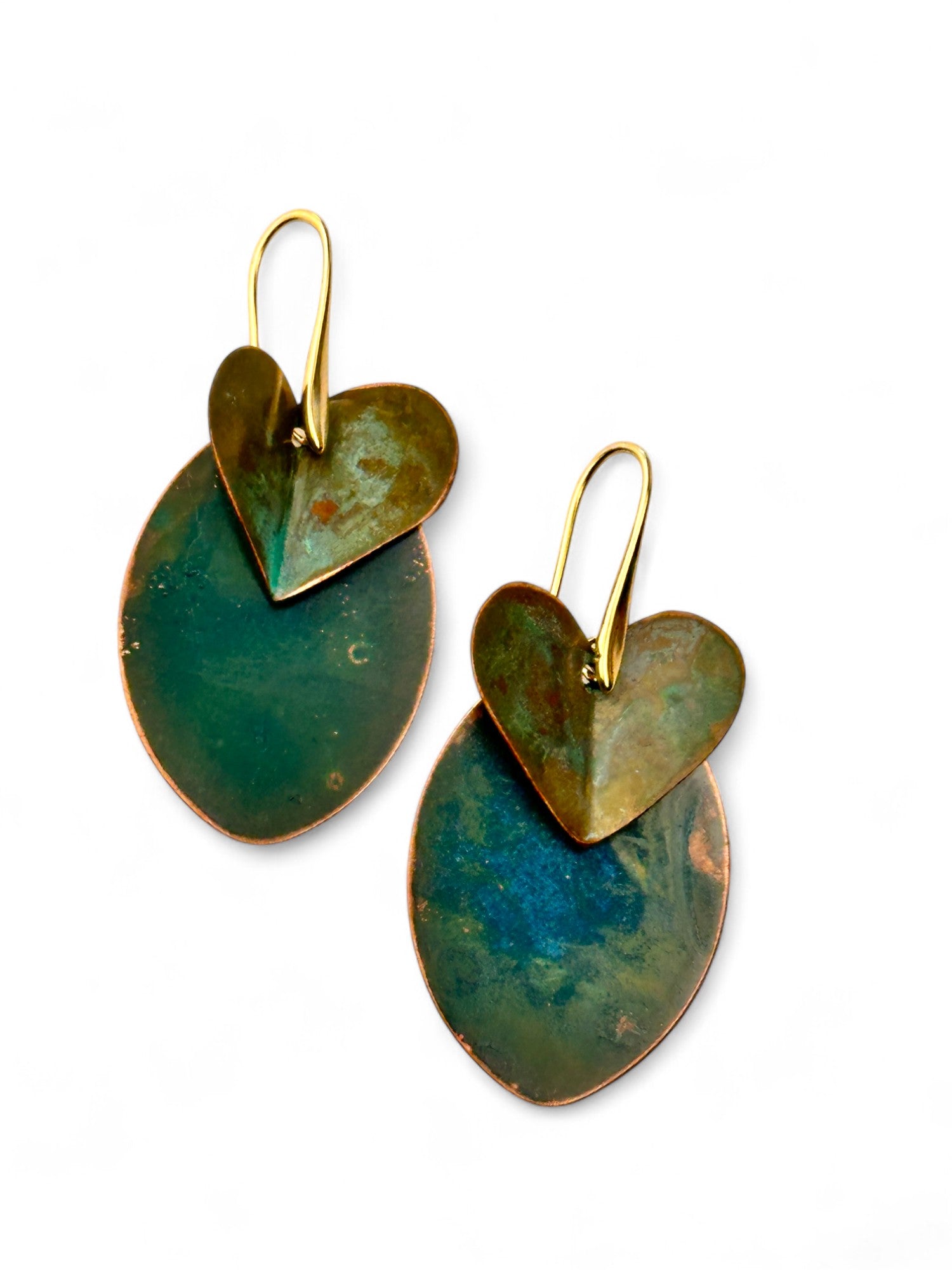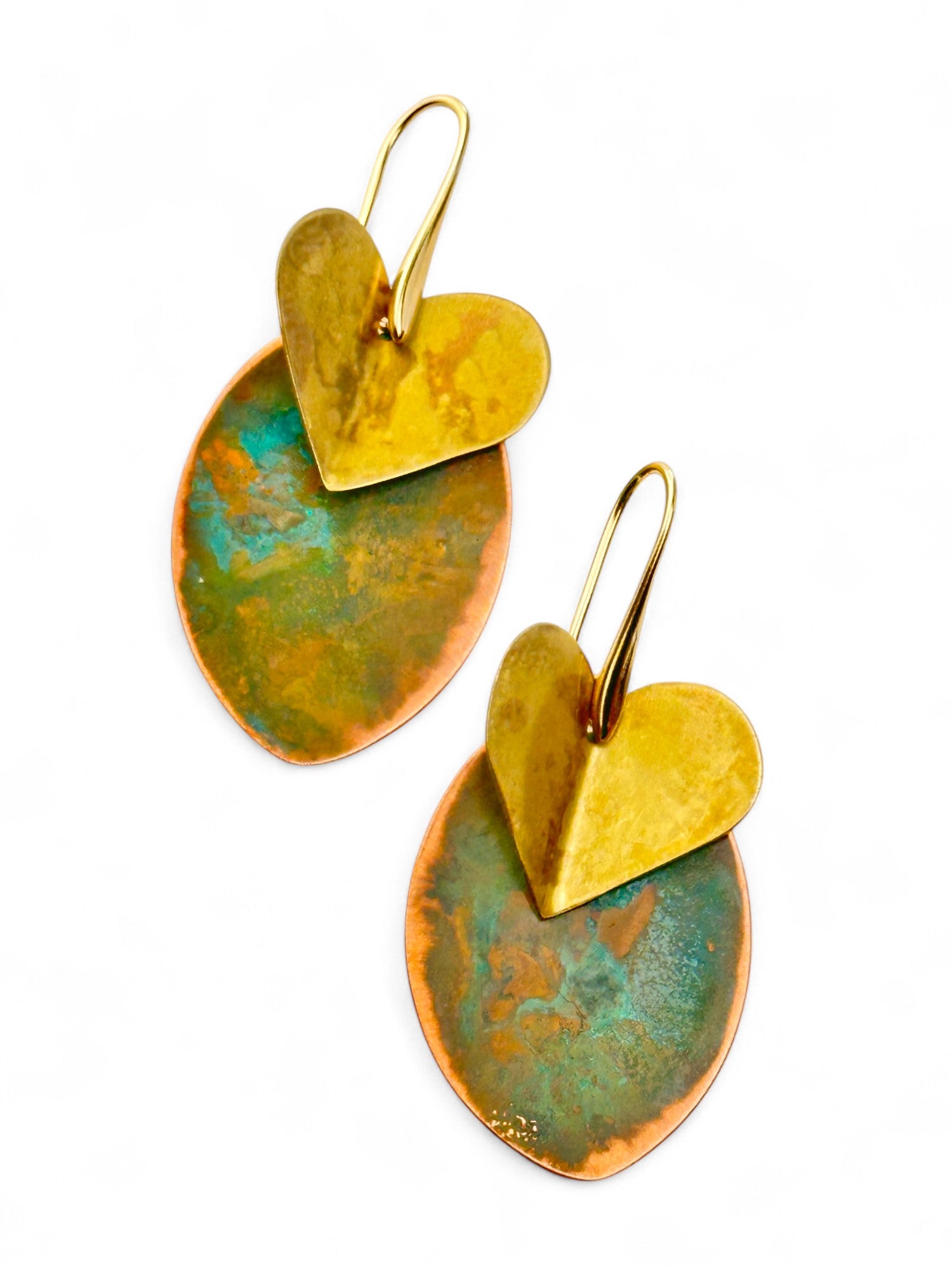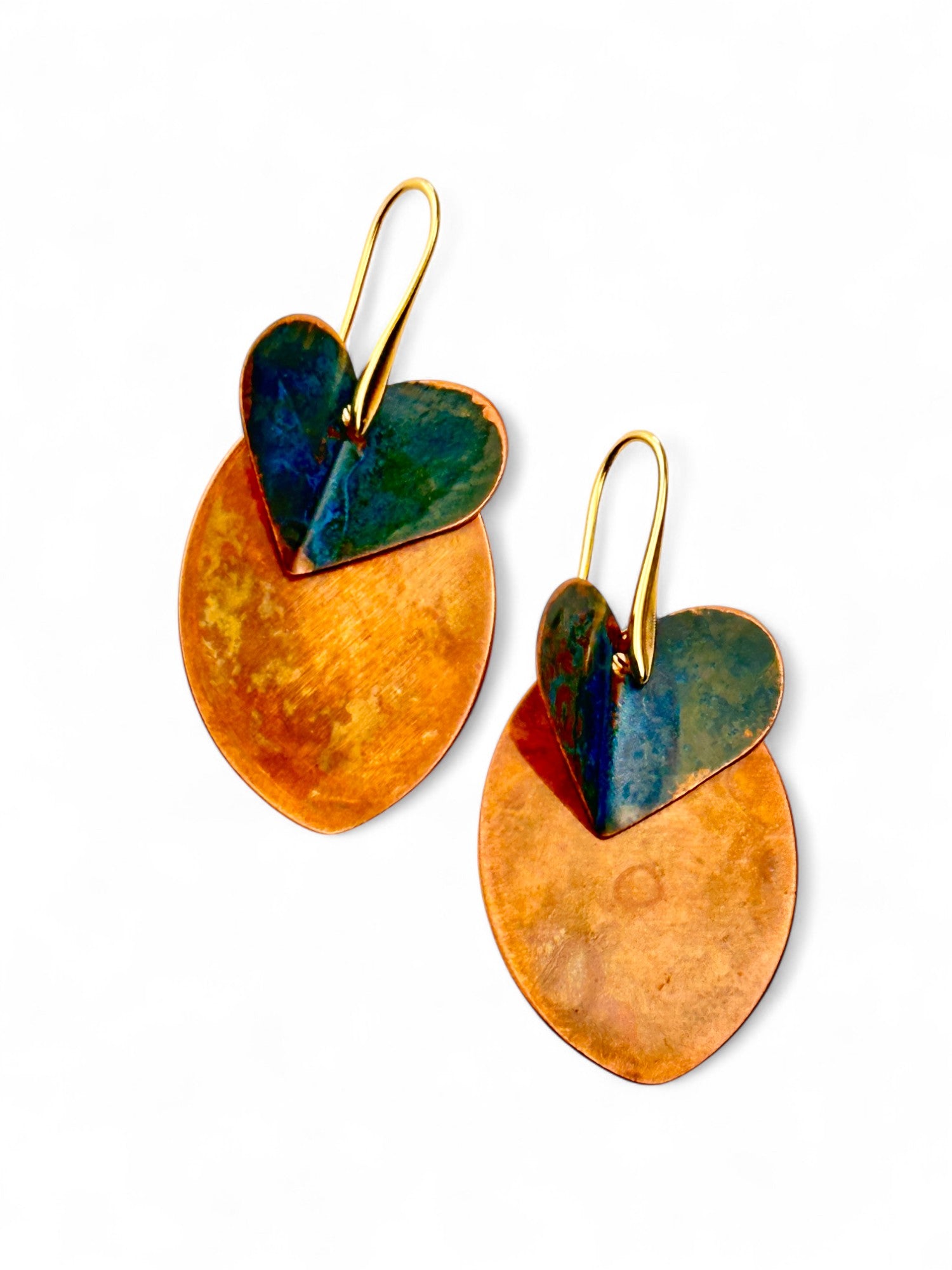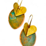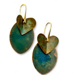 Brincos Heart pequeno duplo. Recortado e martelado manualmente, oxidados. Gancho aberto com banho de ouro.