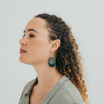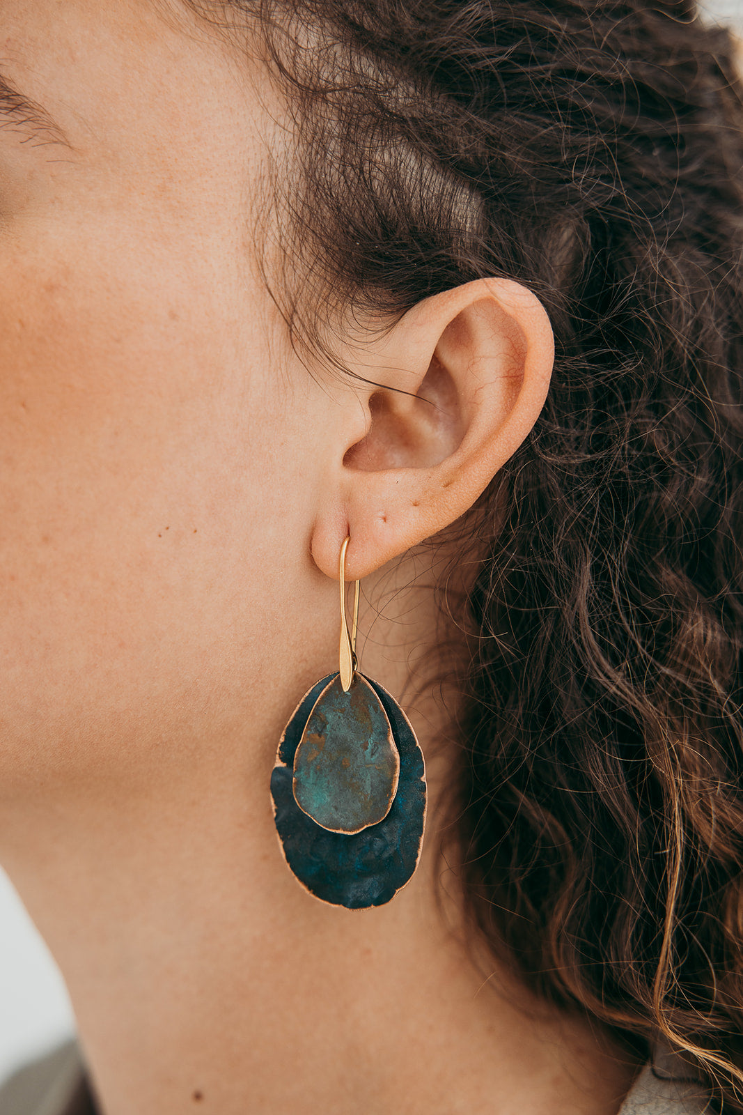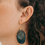 Brincos Jacarandá médio duplo. Cortados, martelados e oxidados manualmente. Gancho aberto com banho de ouro.