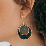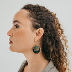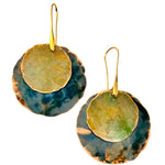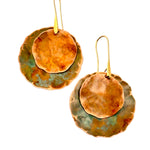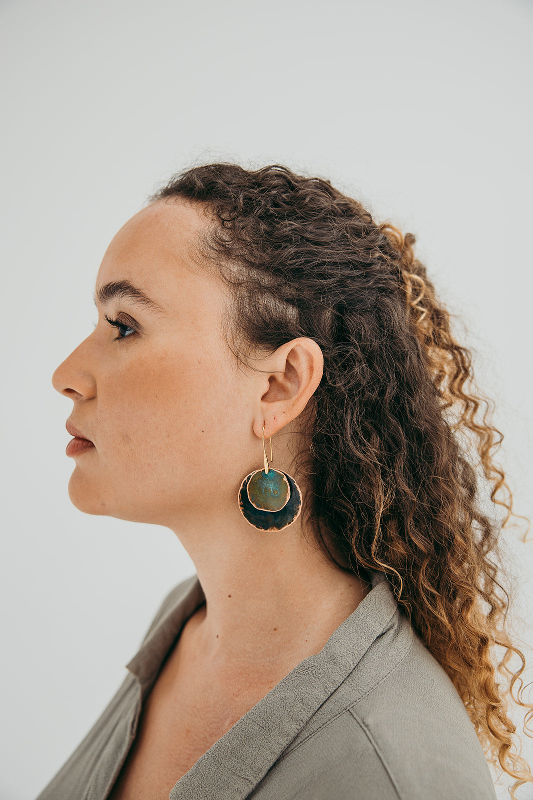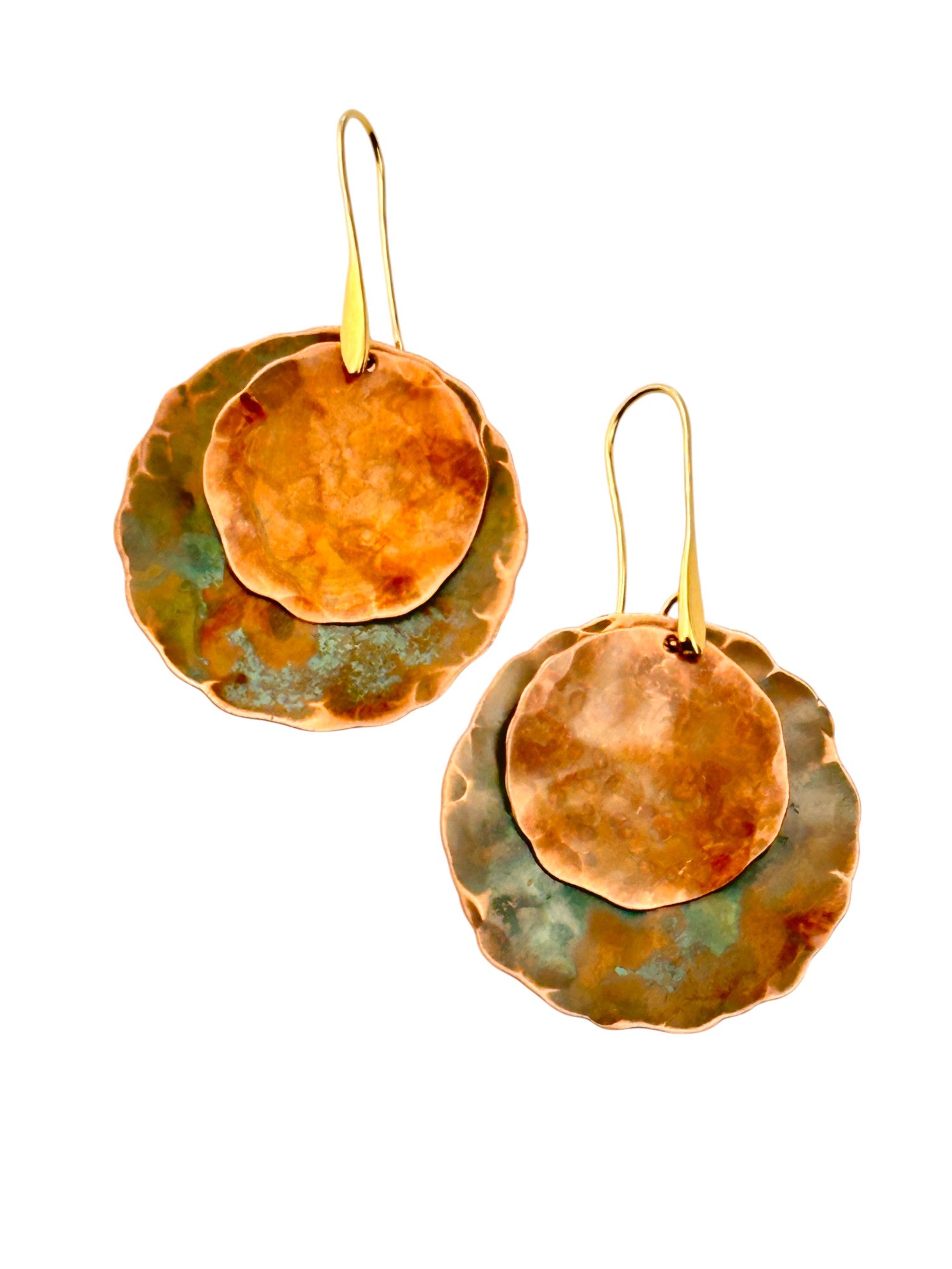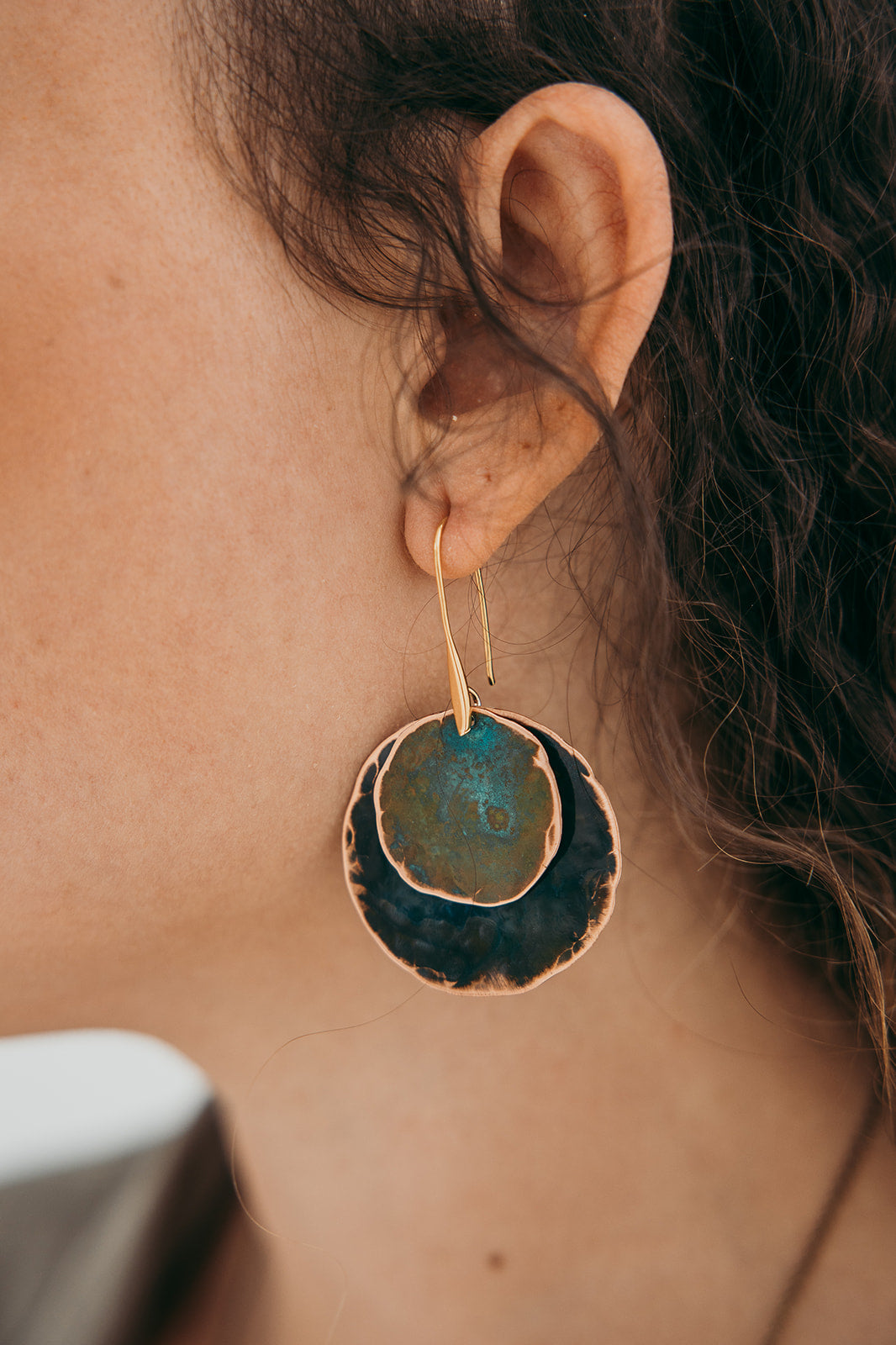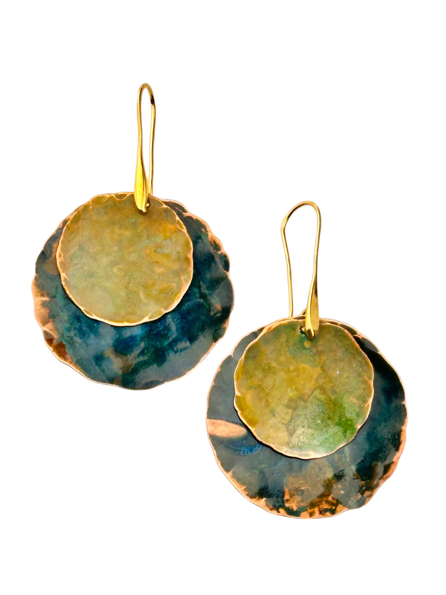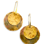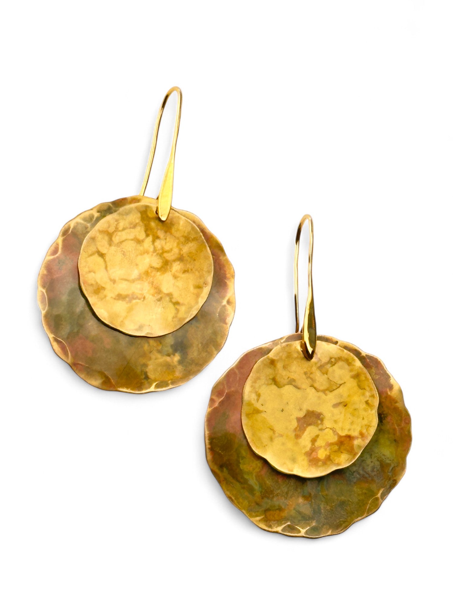 Brincos grandes, com dois discos martelados à mão e oxidados, com efeito irregular com banho de ouro