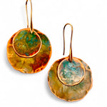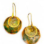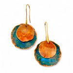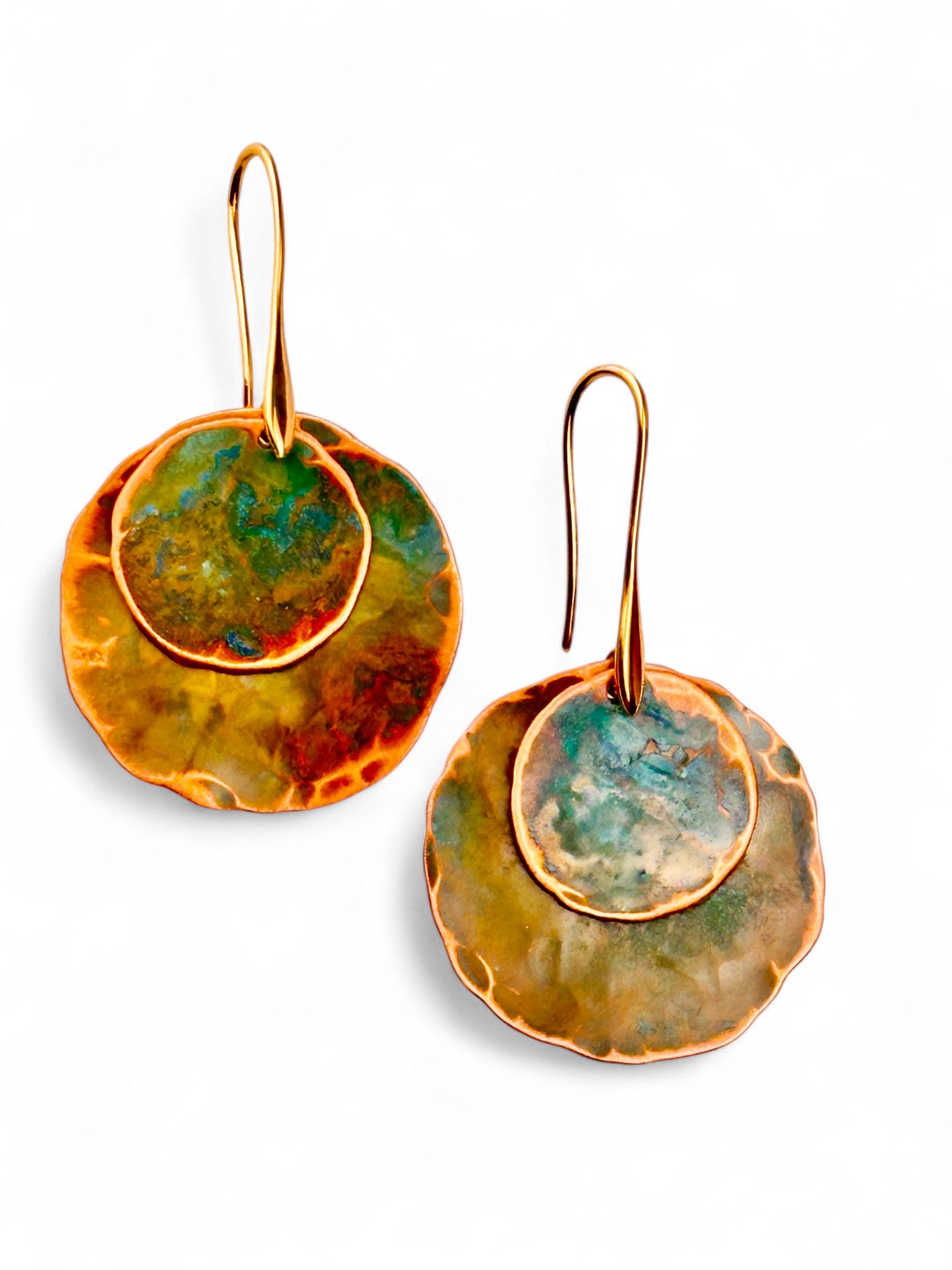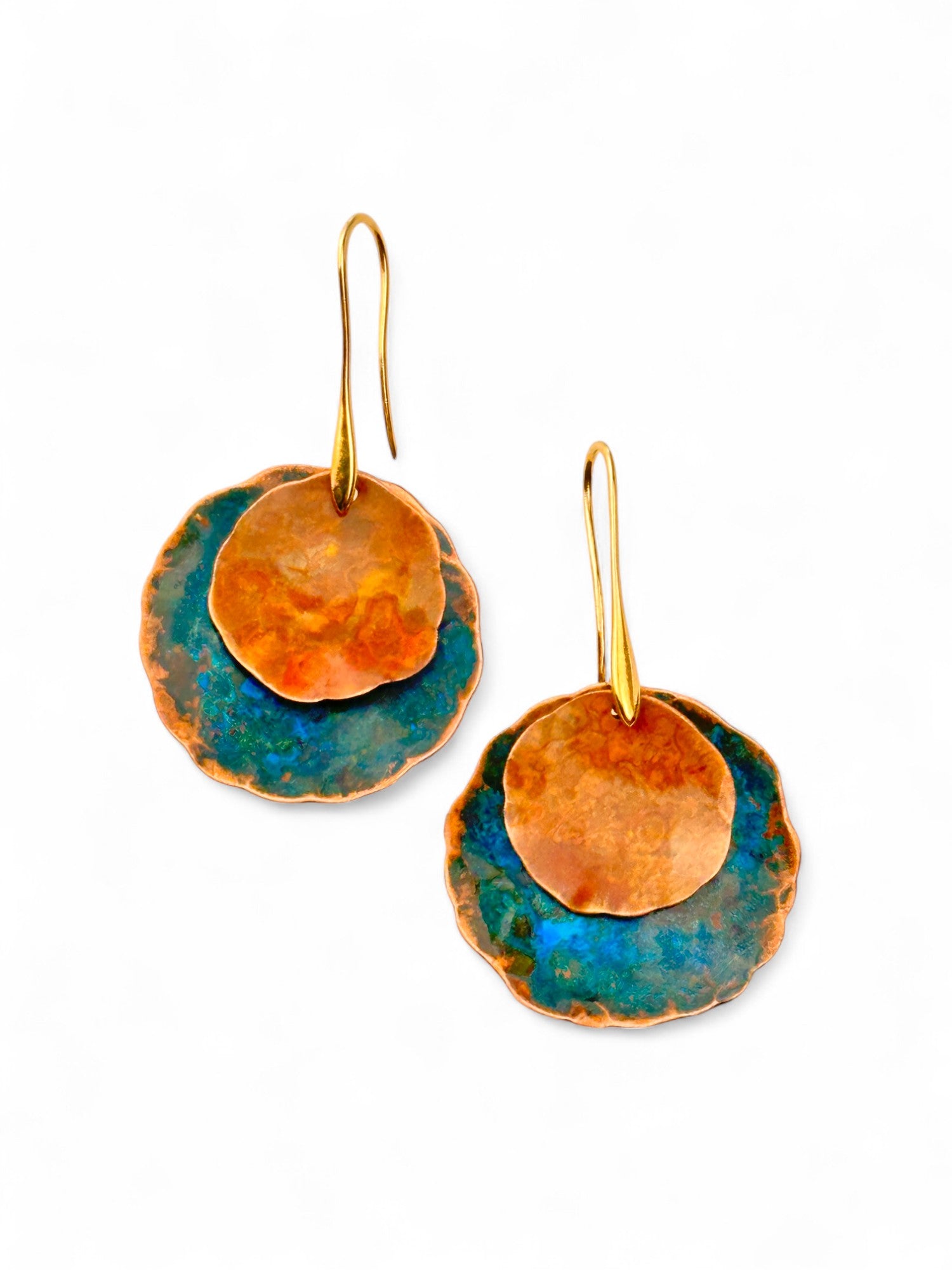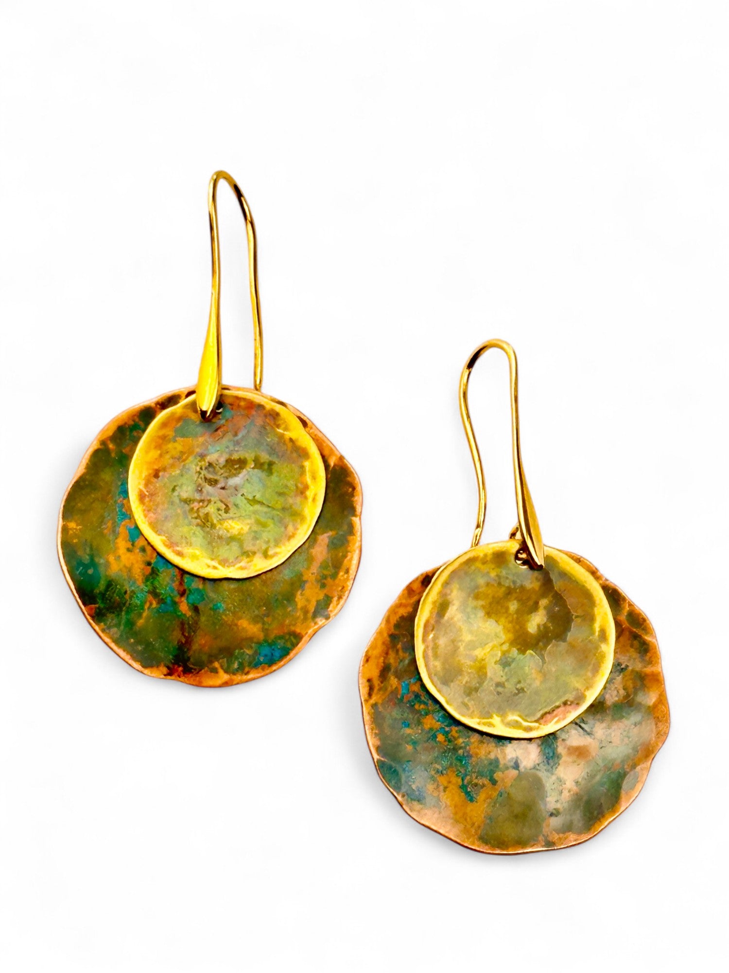 Brincos Moon médios duplos. Cortados, martelados e oxidados manualmente. Gancho aberto com banho de ouro.
