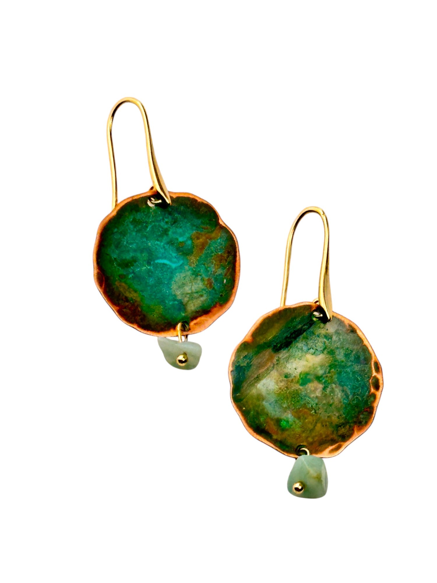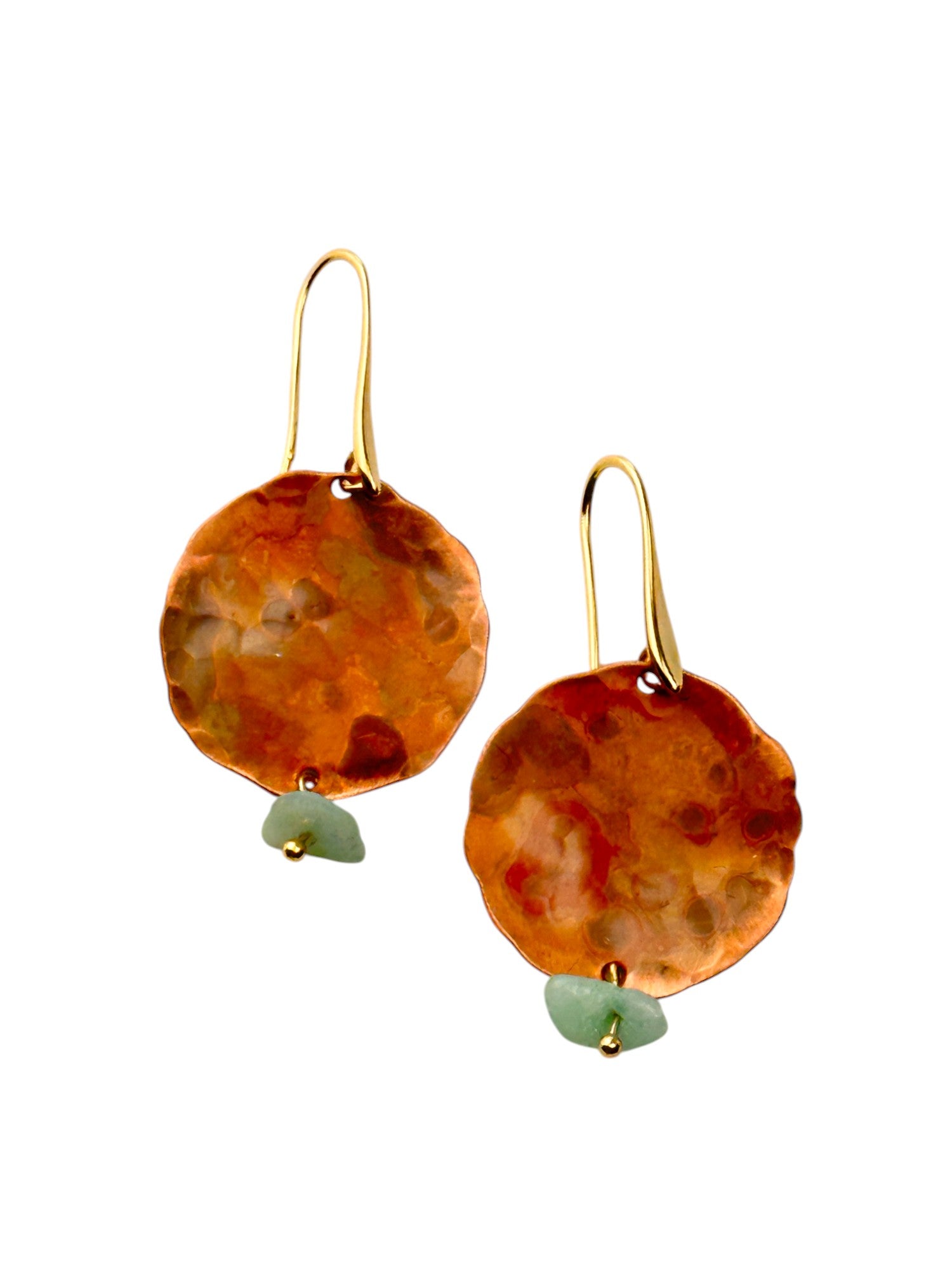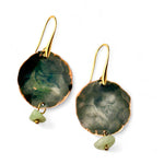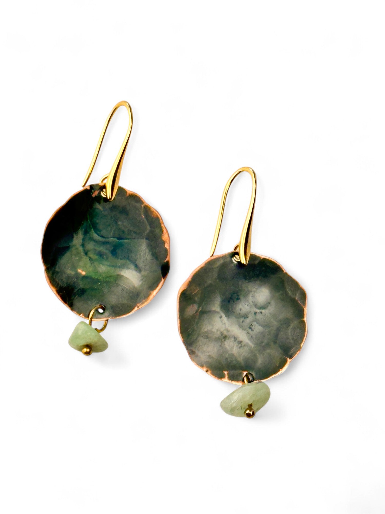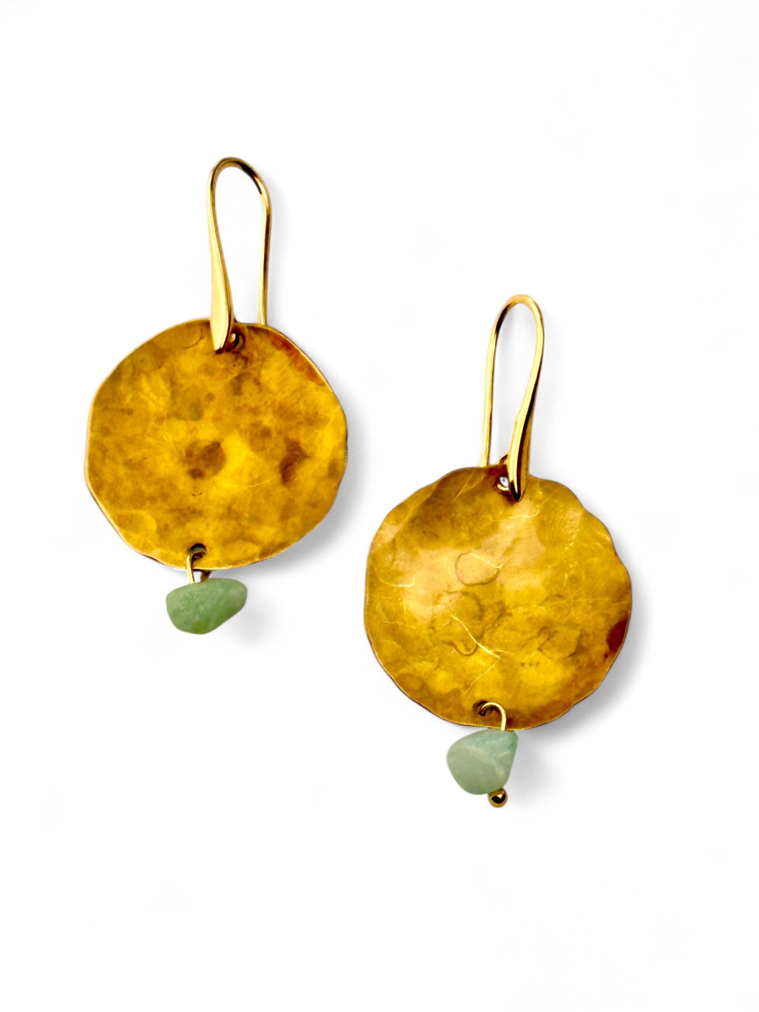 Brincos Moon pequenos com pedra natural. Cortados, martelados e oxidados manualmente. Gancho aberto com banho de ouro.