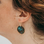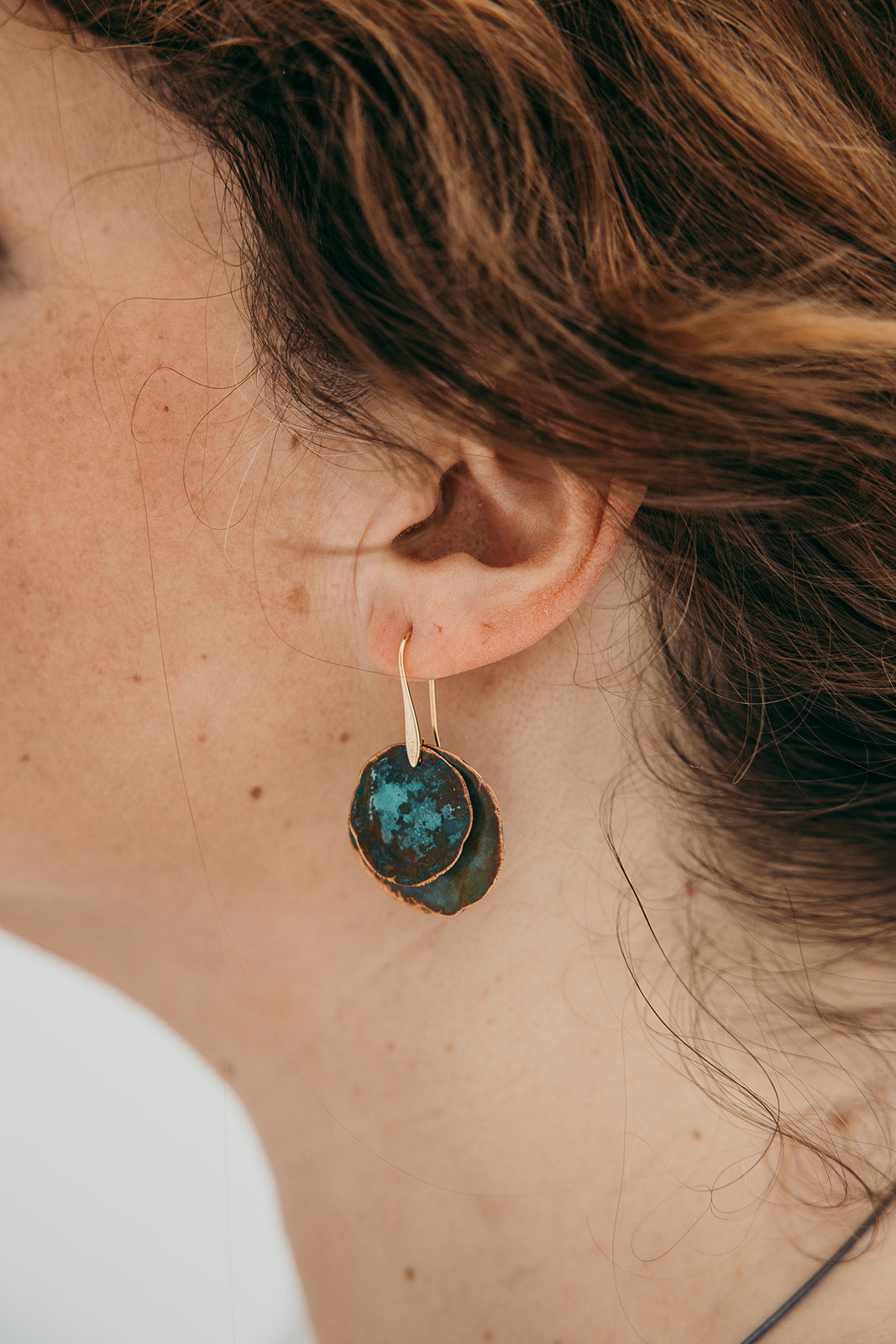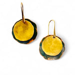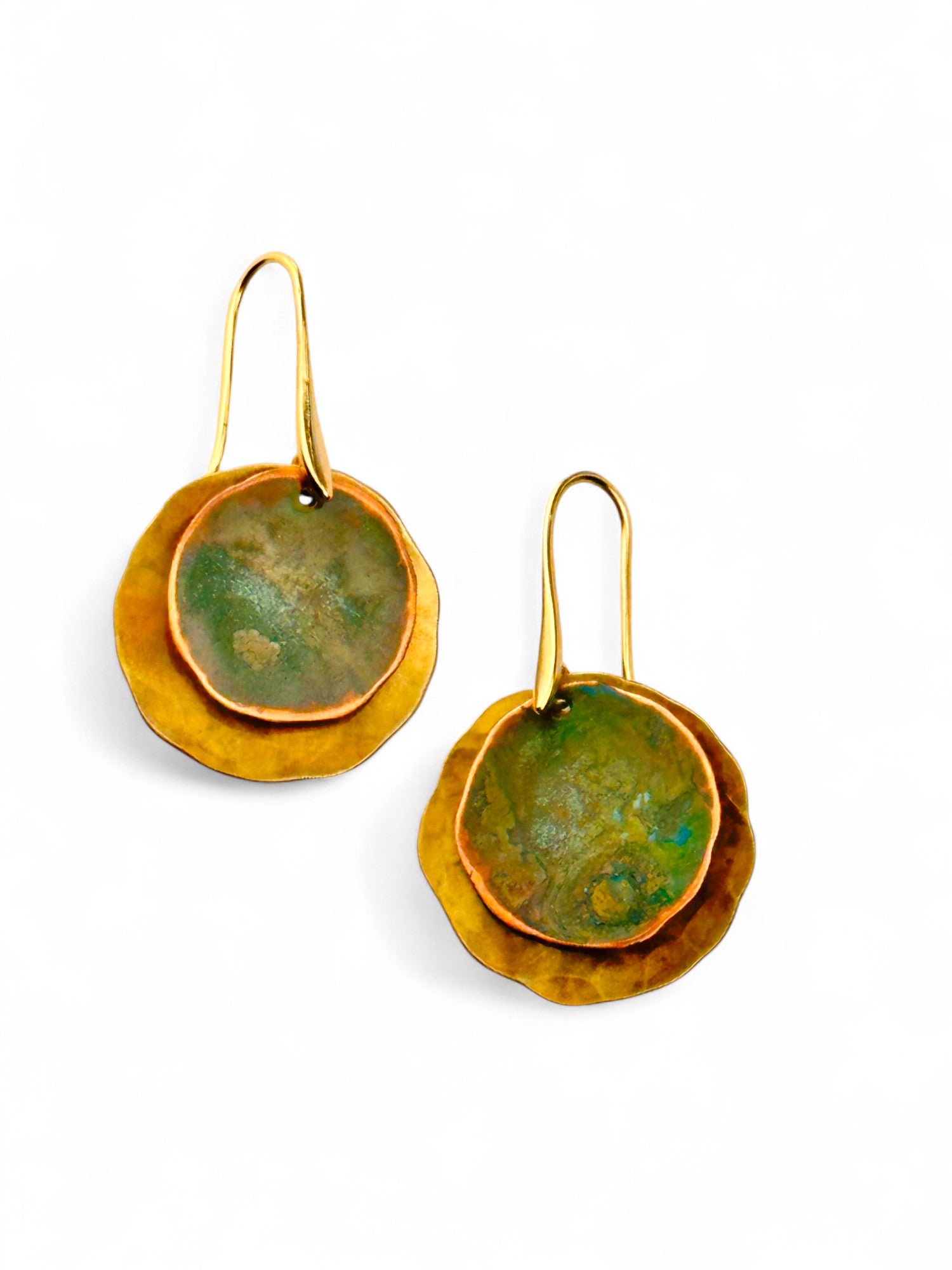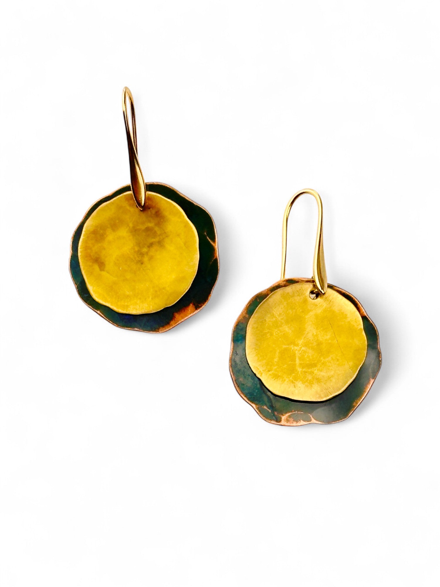 Brincos Moon pequenos duplo. Cortados, martelados e oxidados manualmente. Gancho aberto com banho de ouro.