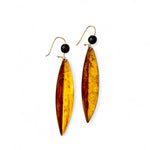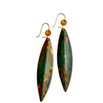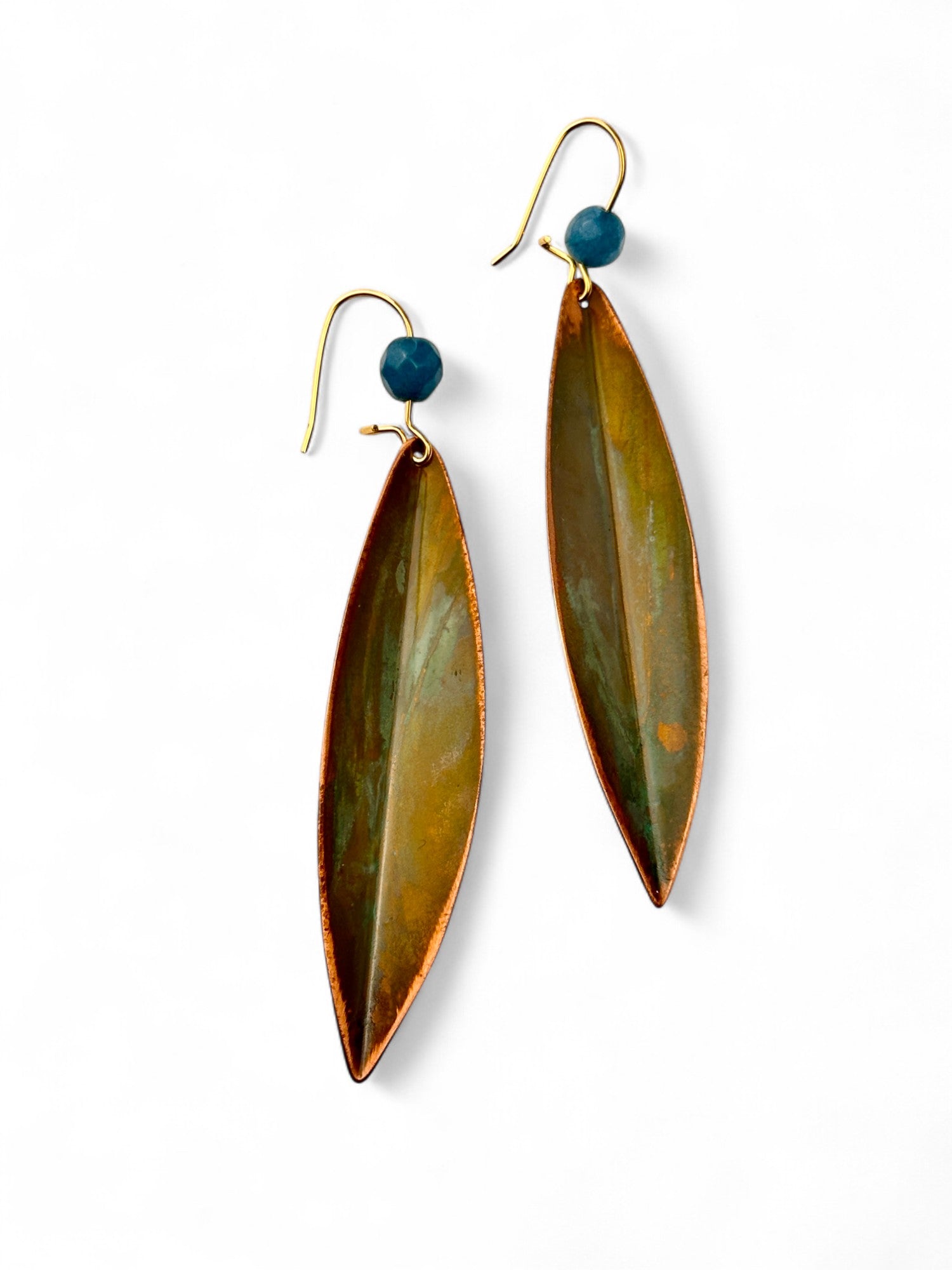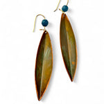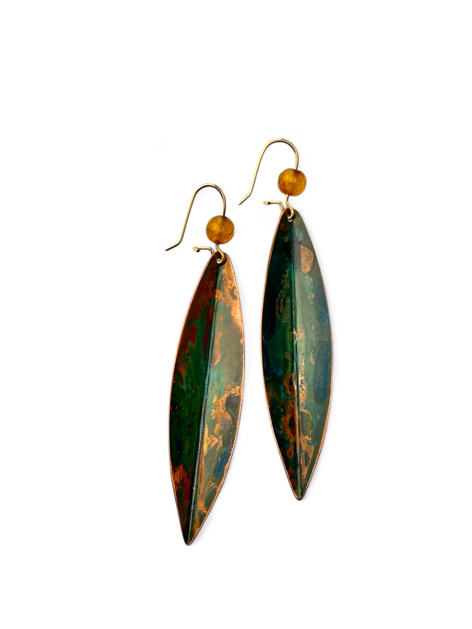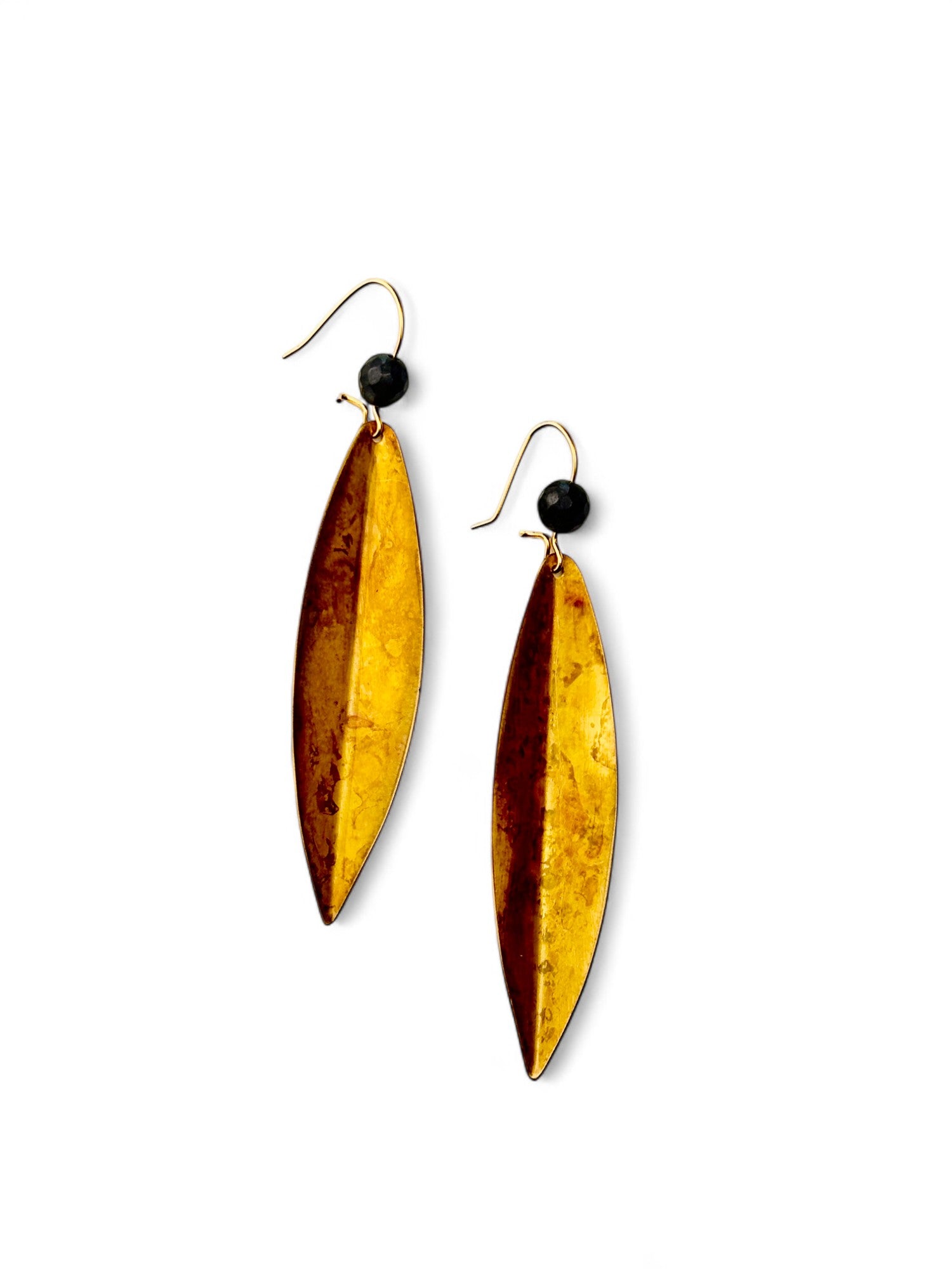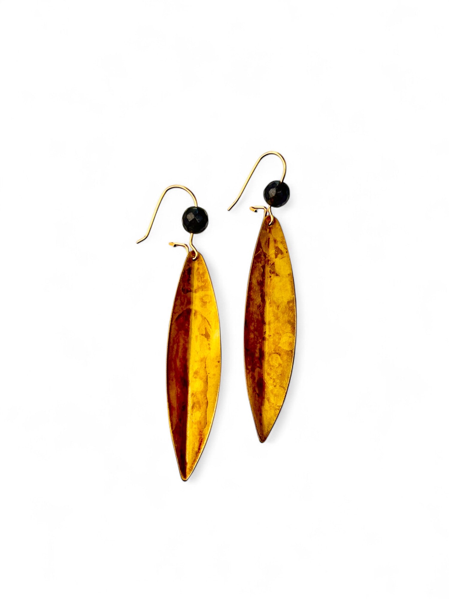 Brincos Olive grandes, cortados, dobrados e oxidados manualmente. Gancho com banho de ouro.