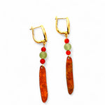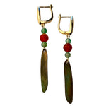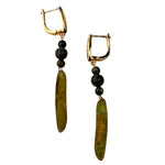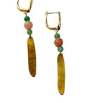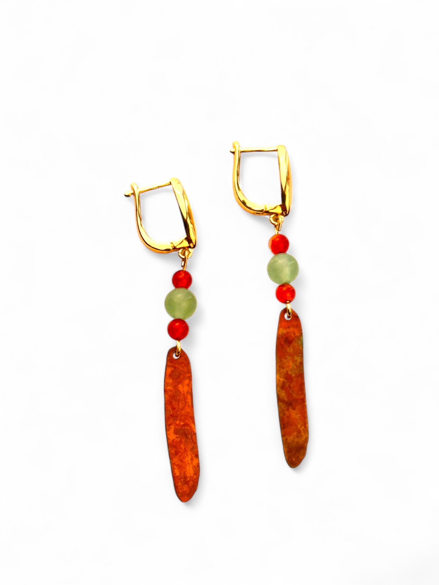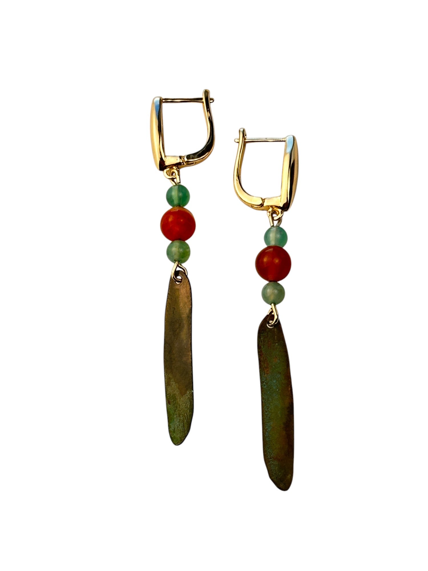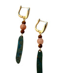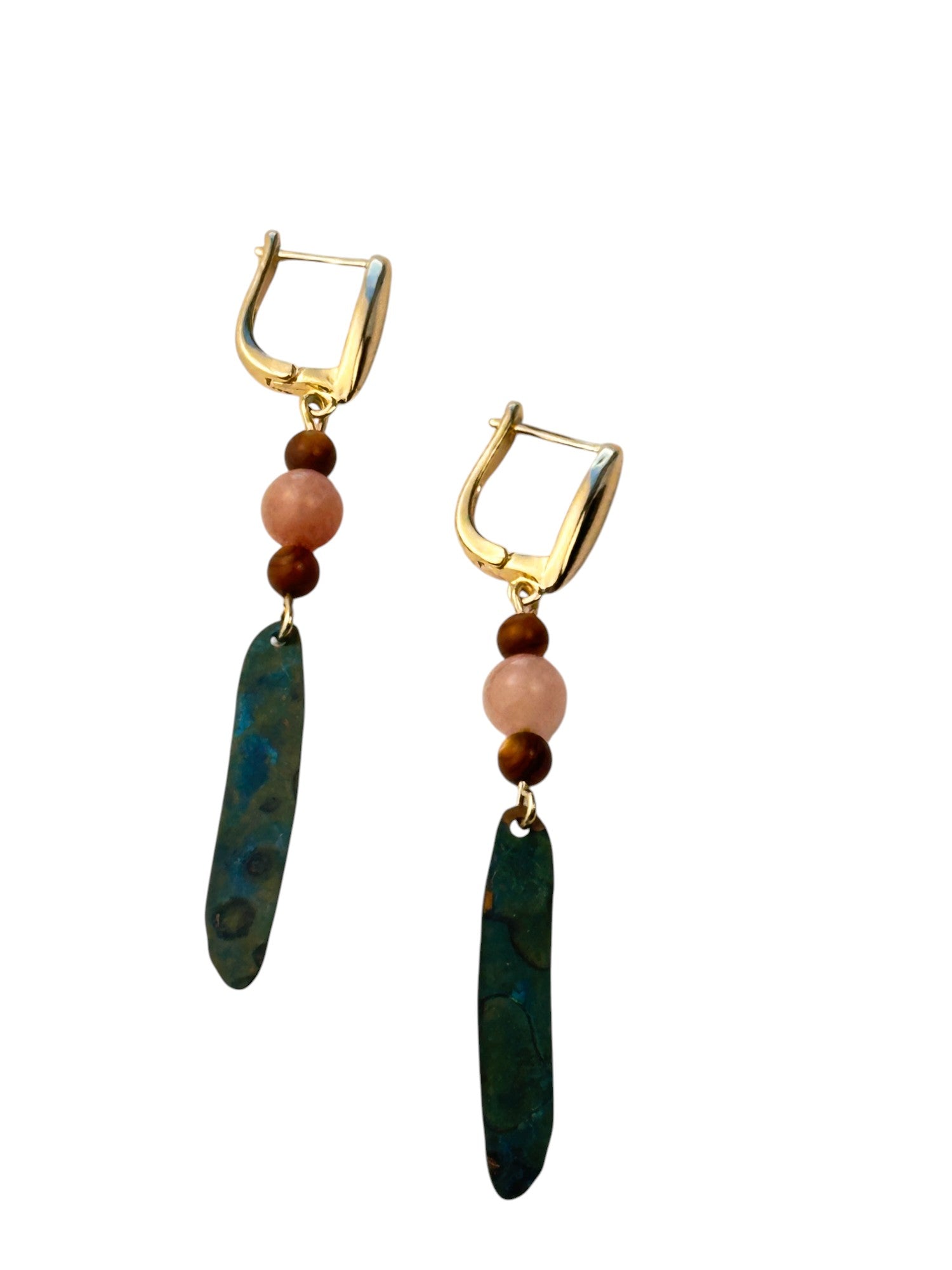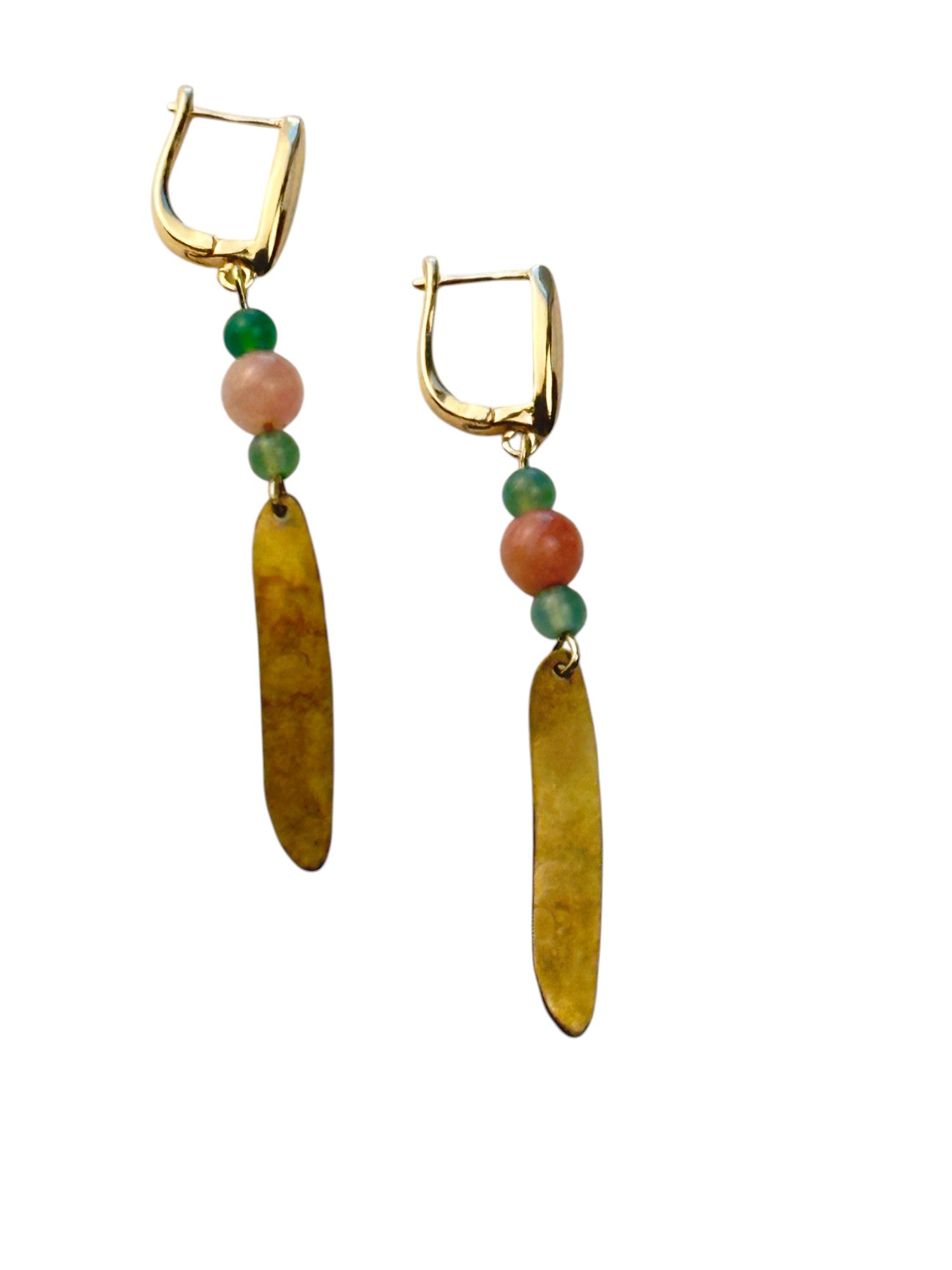 Brincos Symploca com pedras naturais, são cortados e oxidados manualmente. Gancho fechado com banho de ouro.