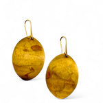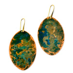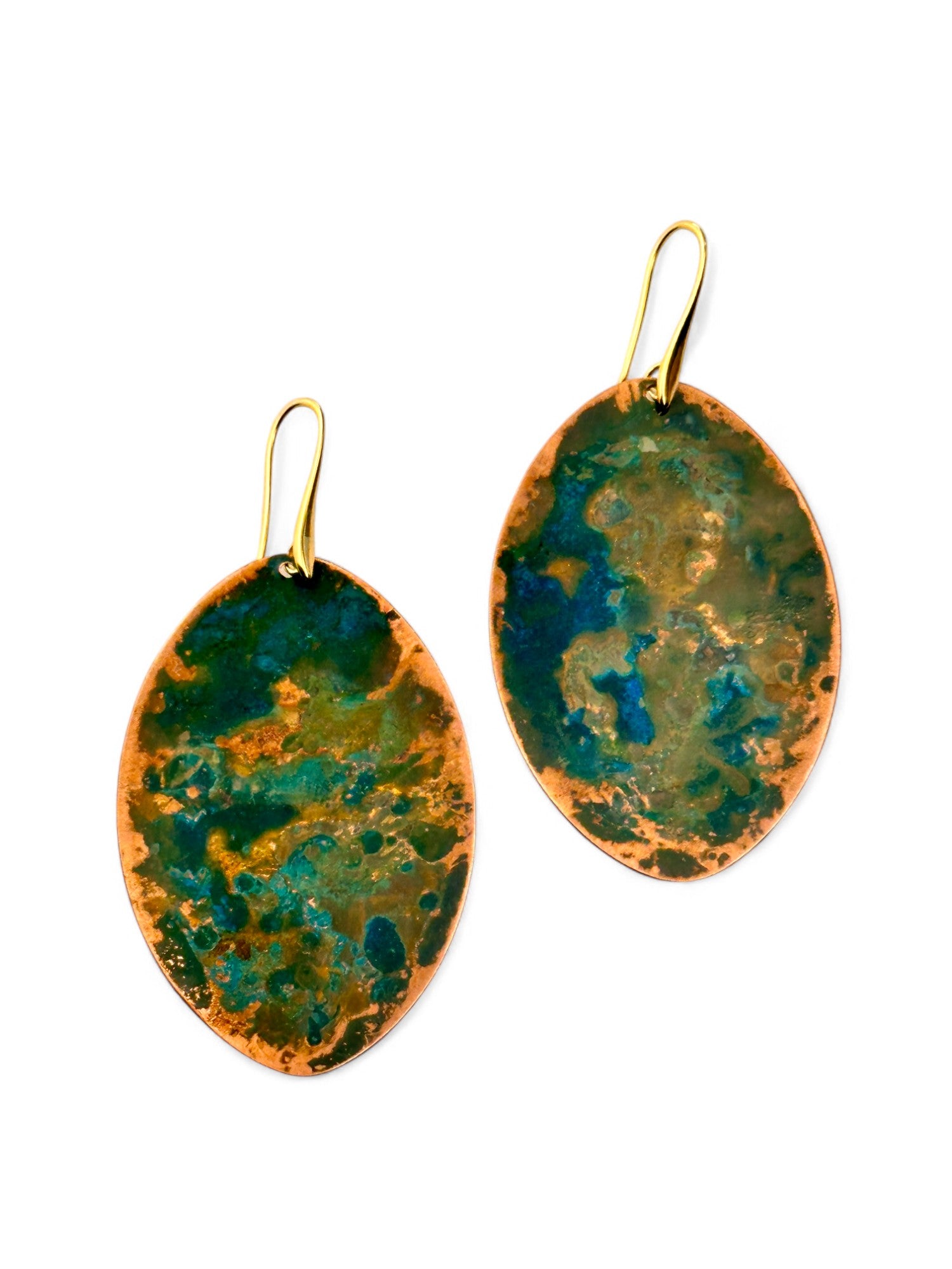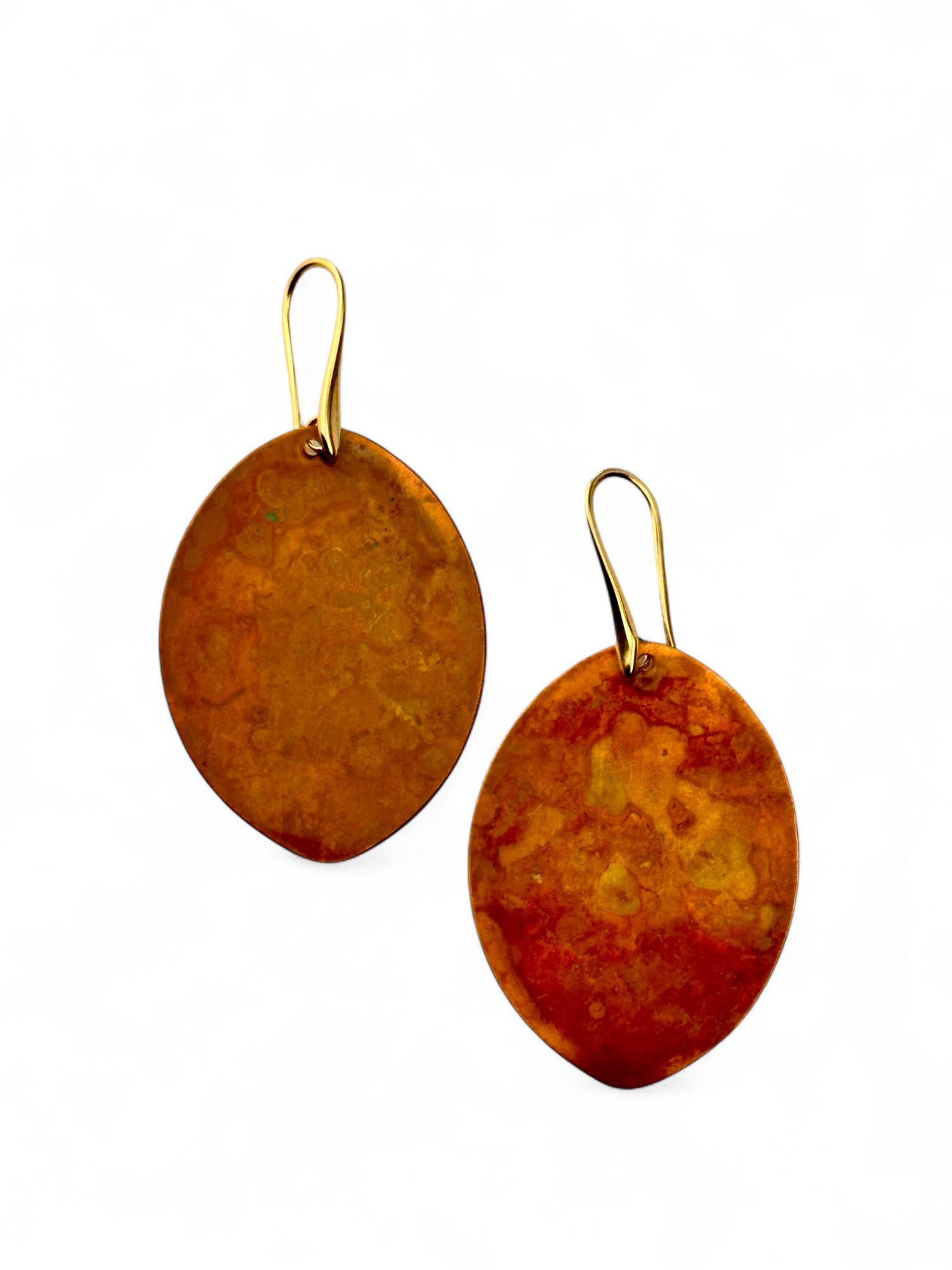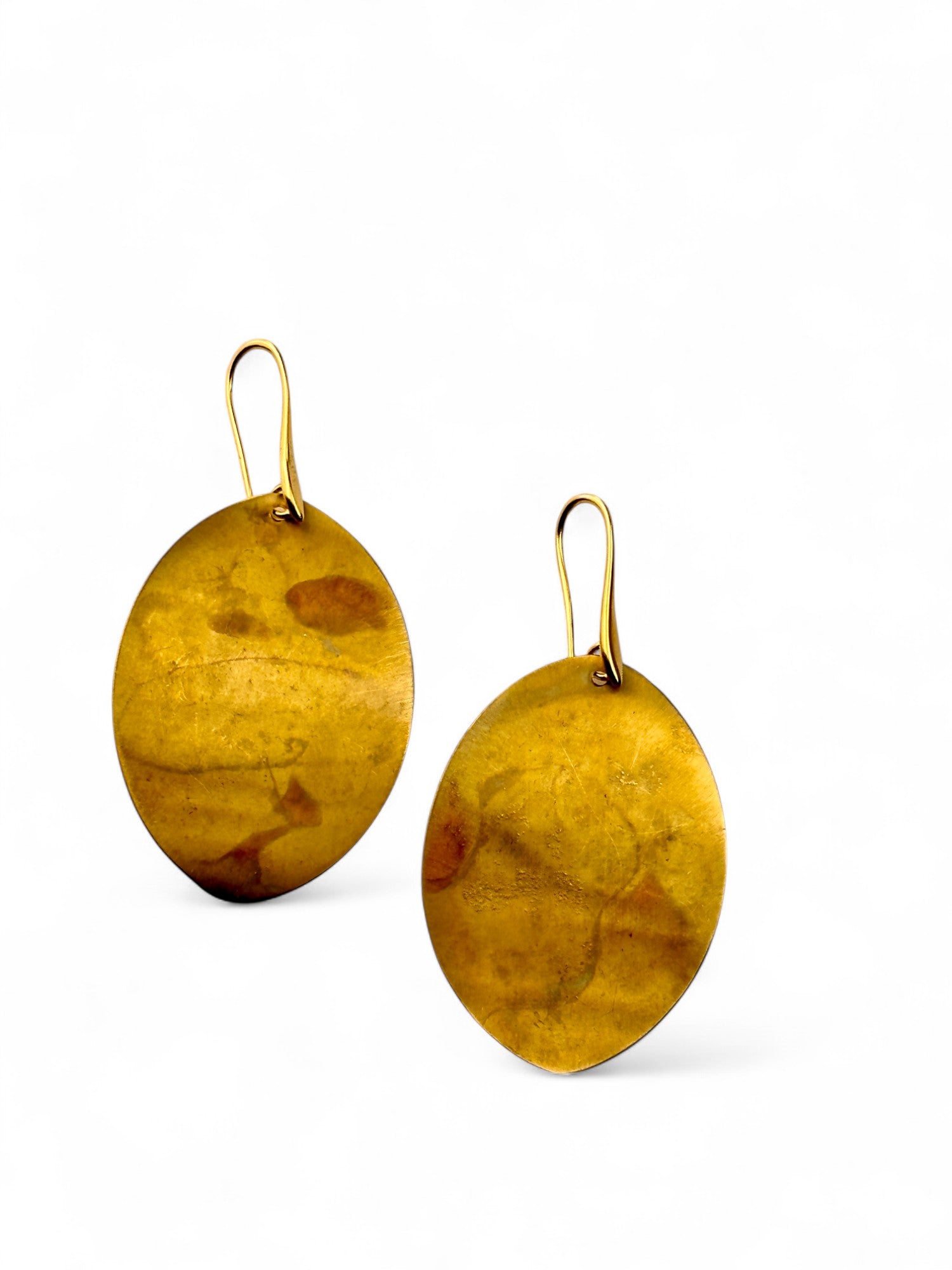 Brincos Seed grandes. Cortados e oxidados manualmente. Gancho aberto com banho de ouro.