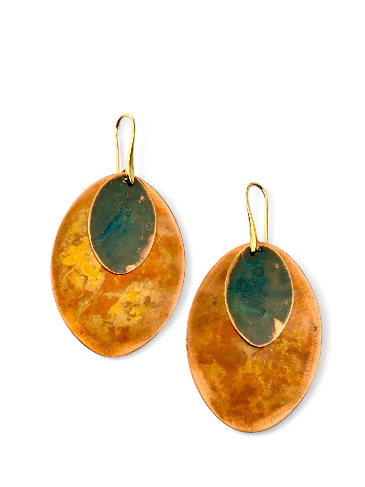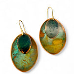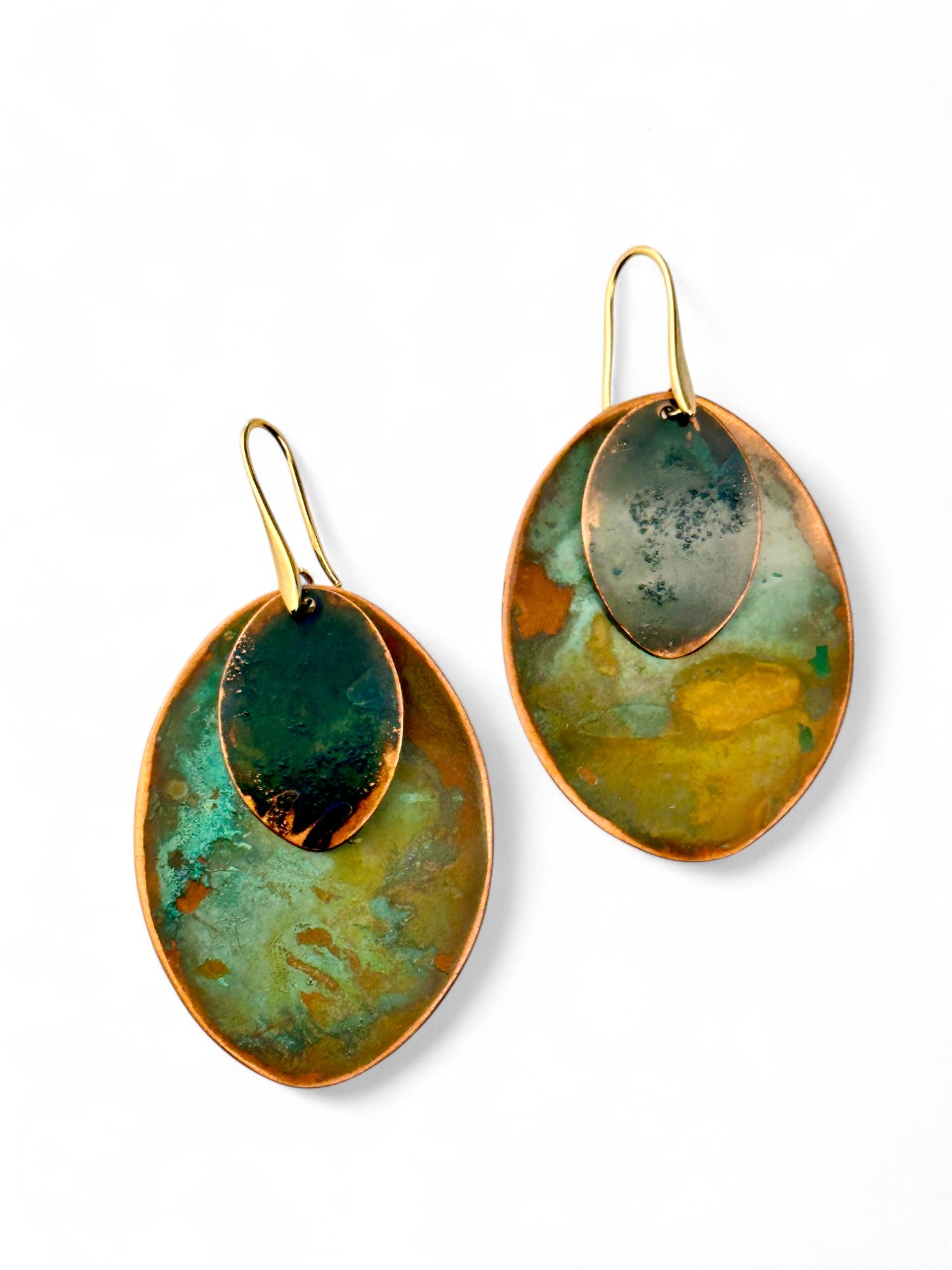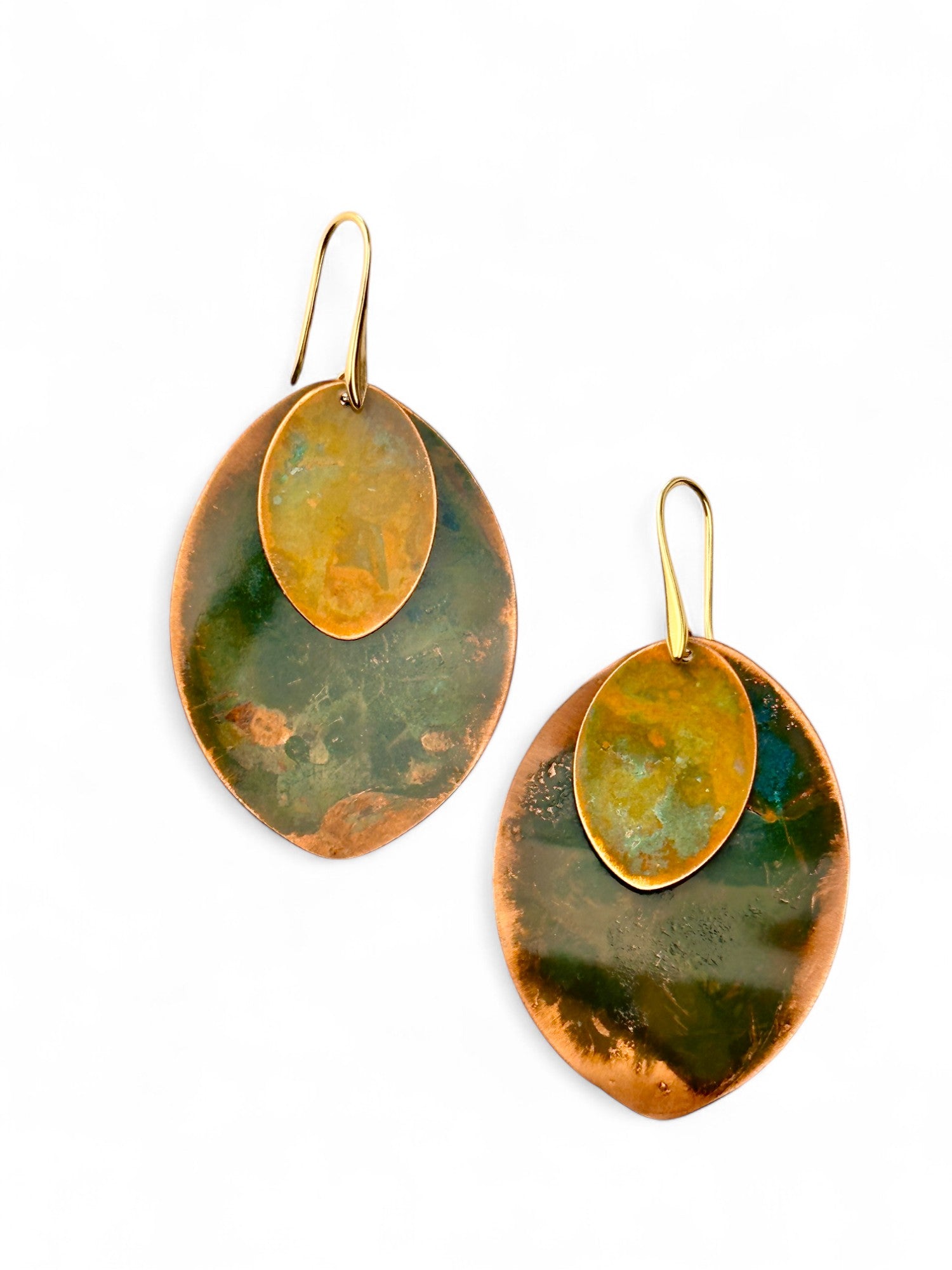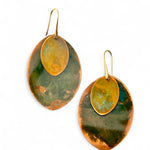 Brincos Seed grandes. Cortados e oxidados manualmente. Gancho aberto com banho de ouro.