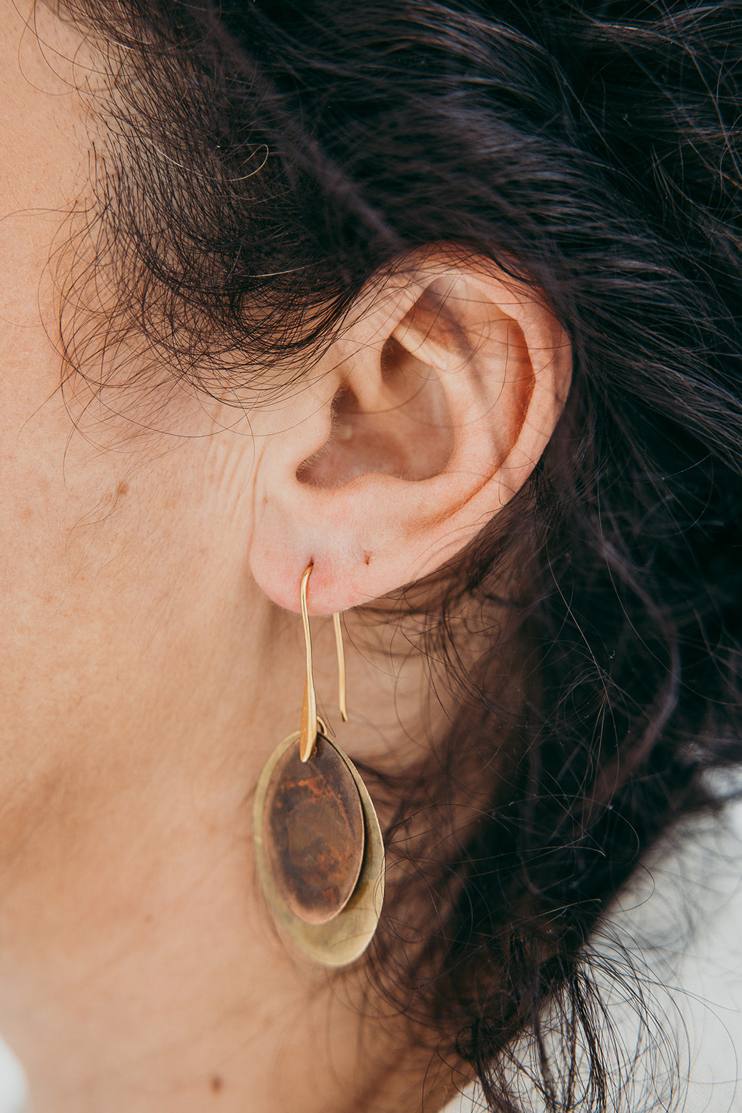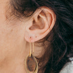 Brincos Seed pequenos duplos. Cortados e oxidados manualmente. Gancho aberto com banho de ouro.