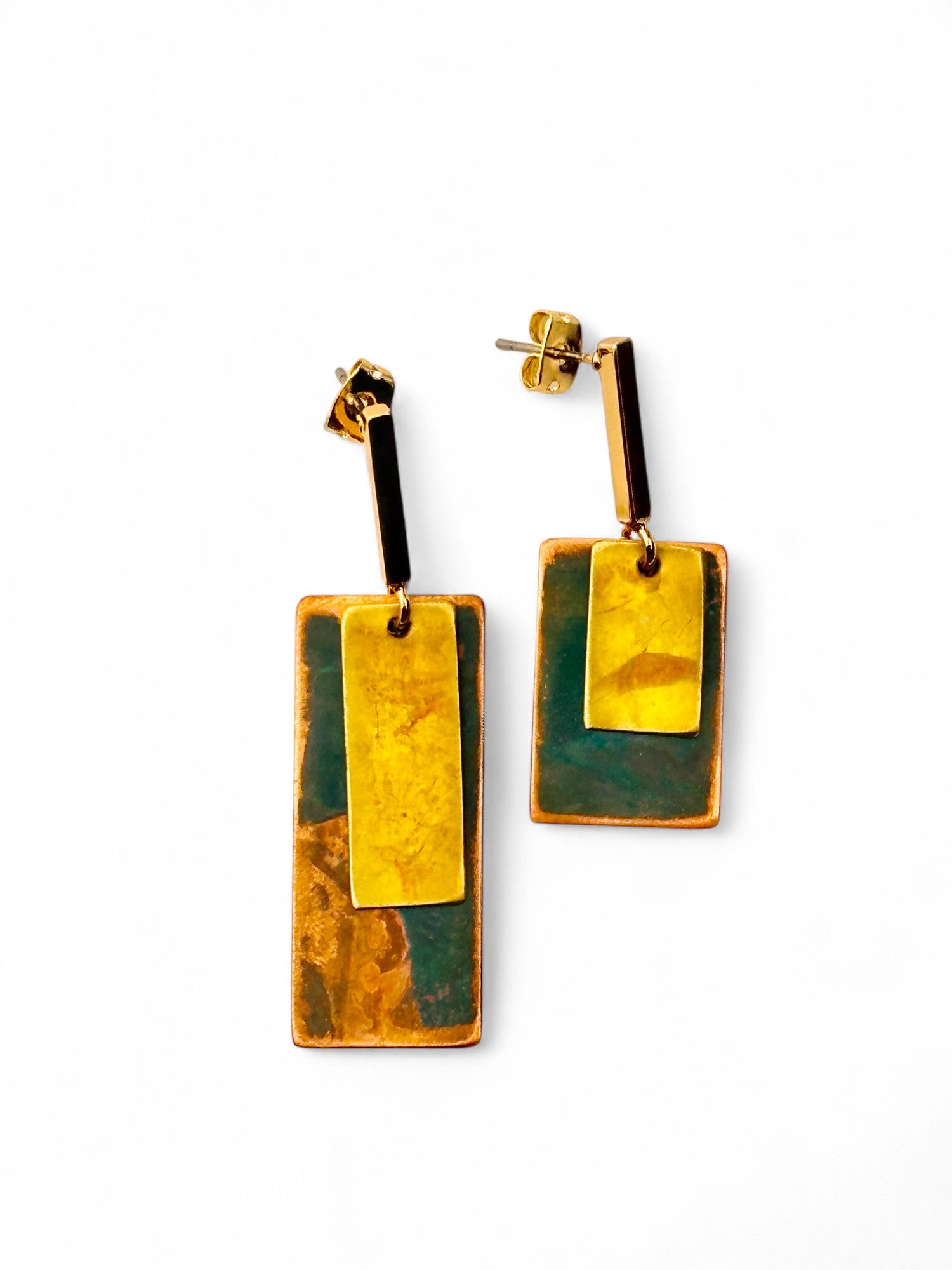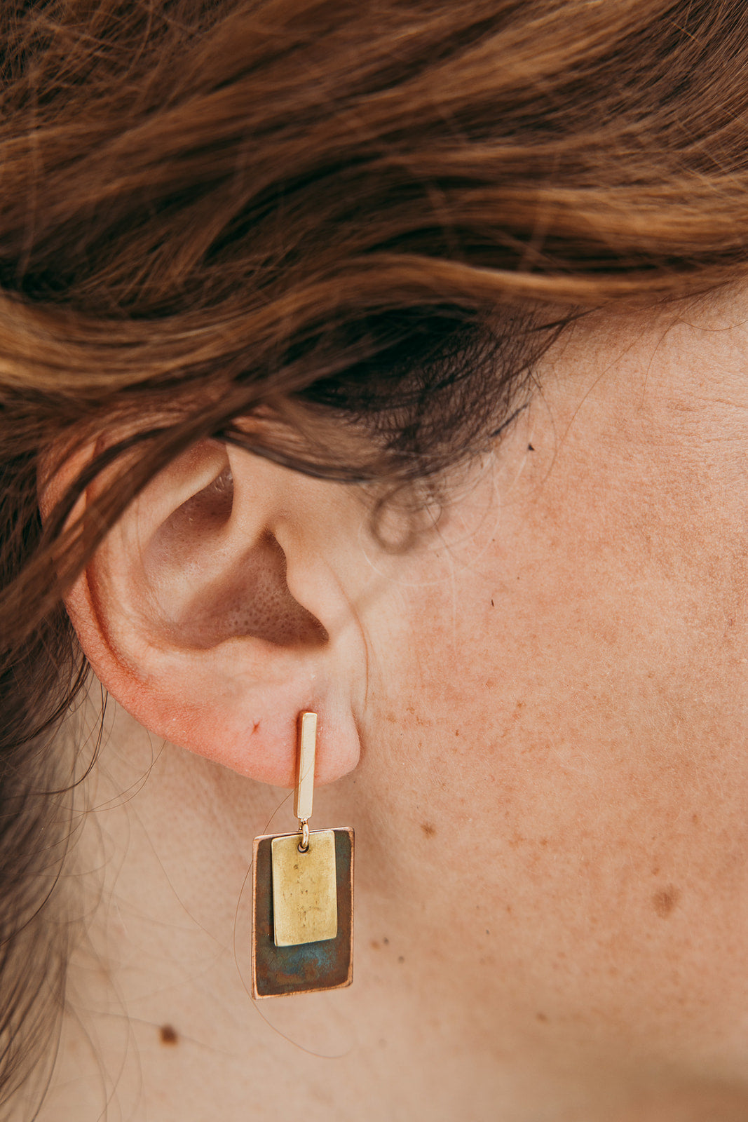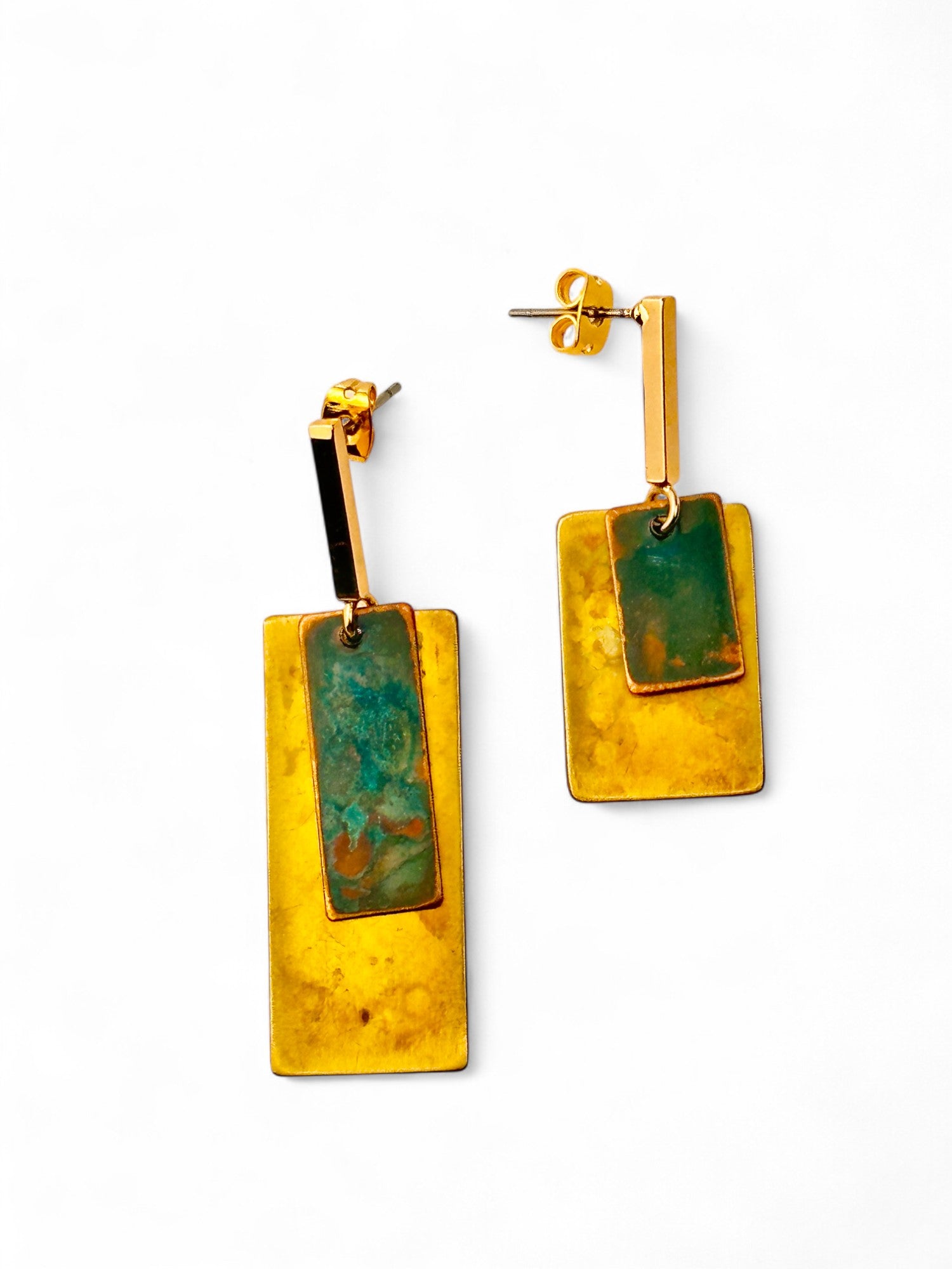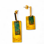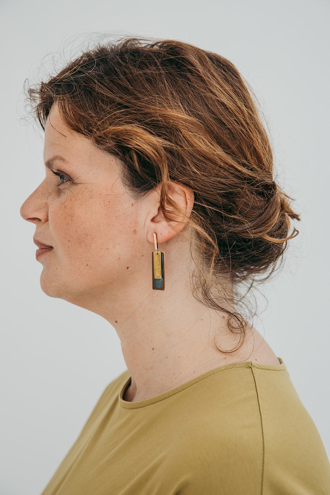 Brincos stud Mondrian, assimétricos, cortados e oxidados manualmente. Stud retangular, com banho de ouro.