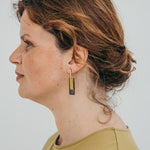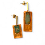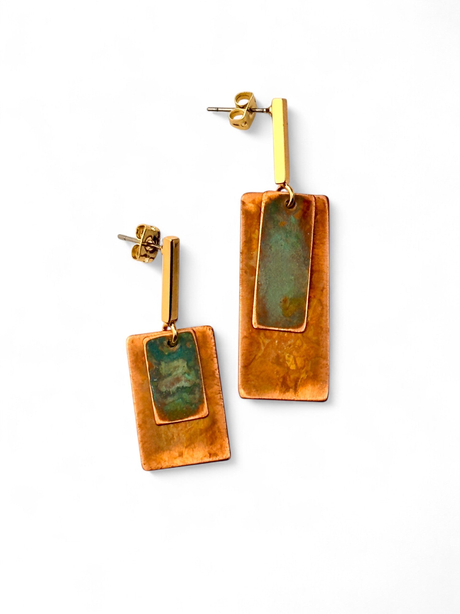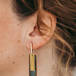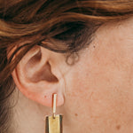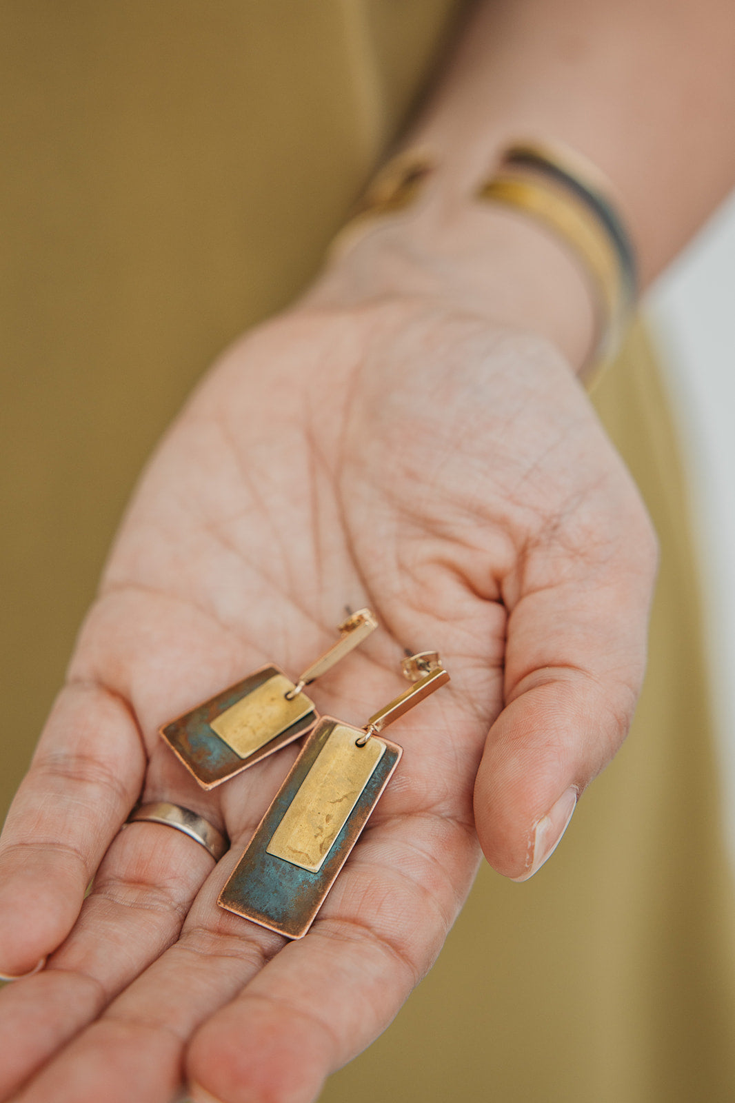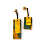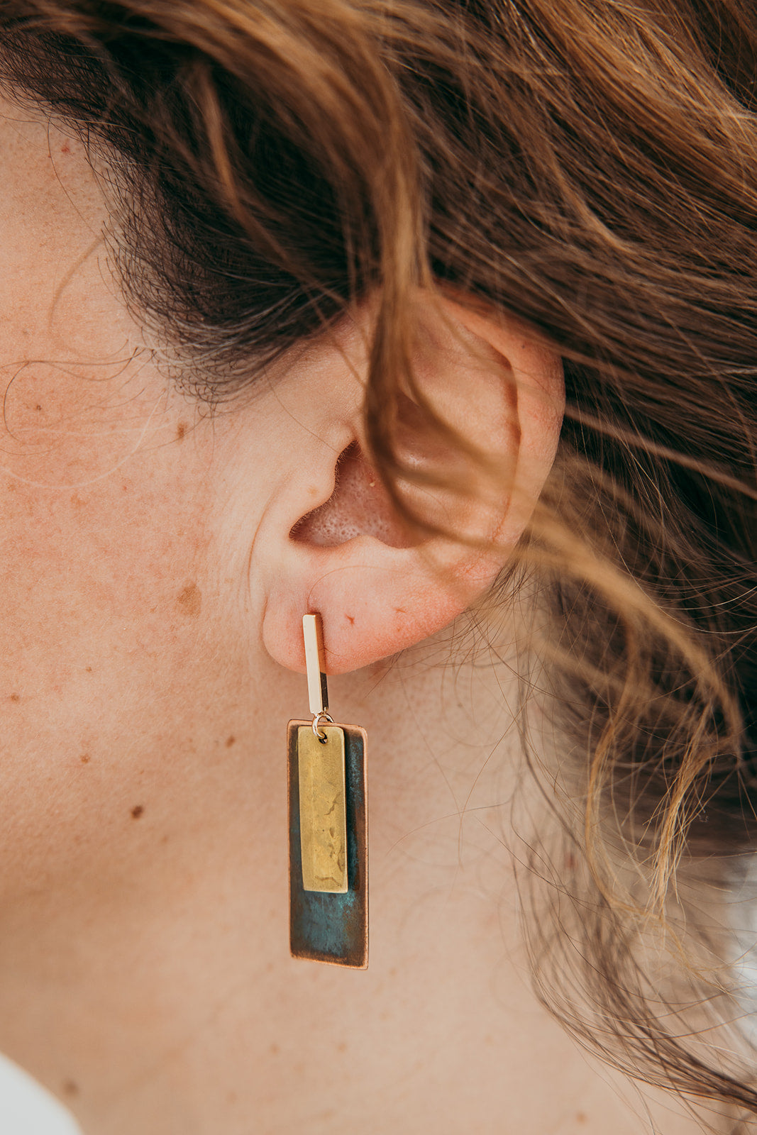 Brincos stud Mondrian, assimétricos, cortados e oxidados manualmente. Stud retangular, com banho de ouro.