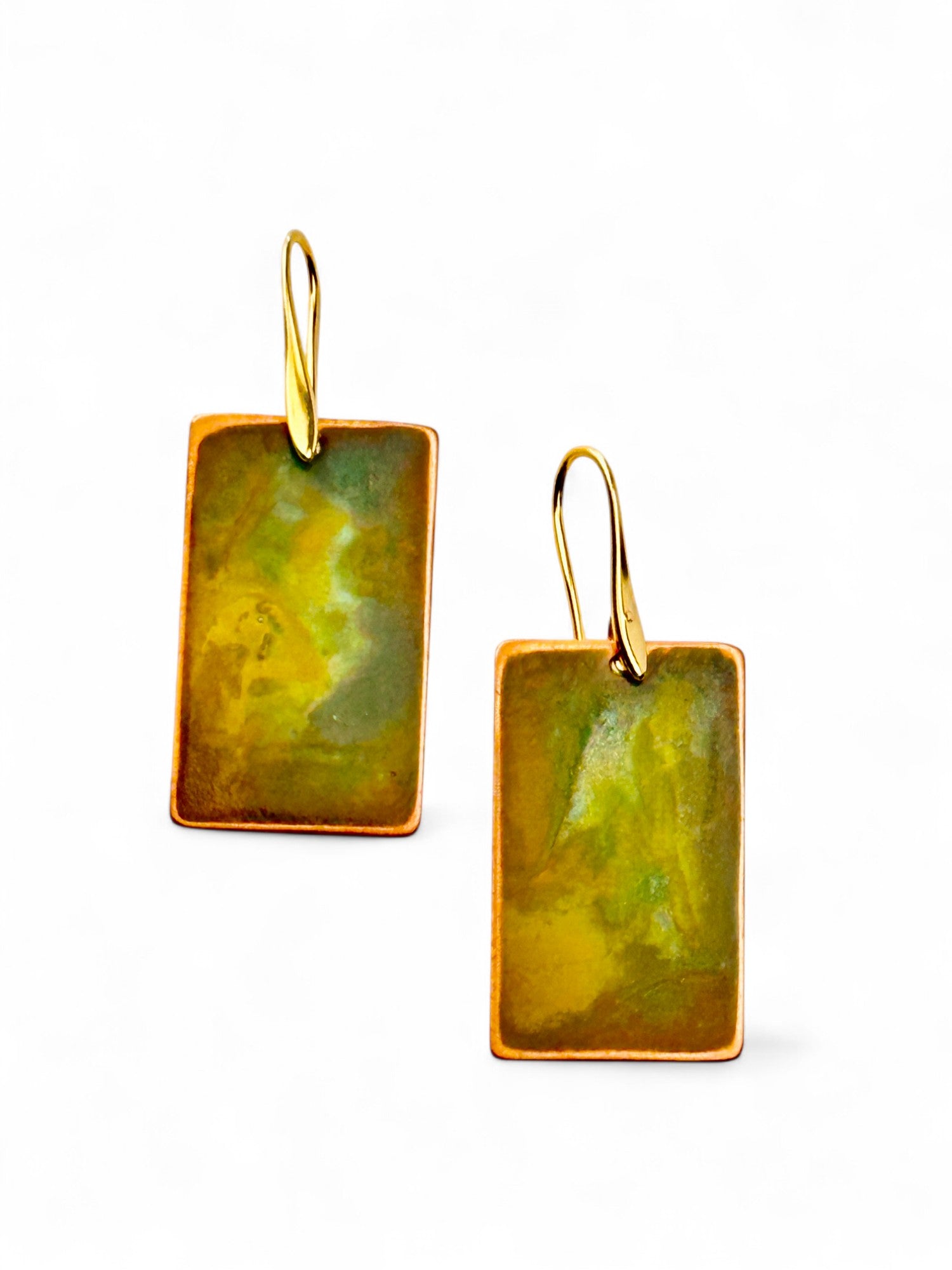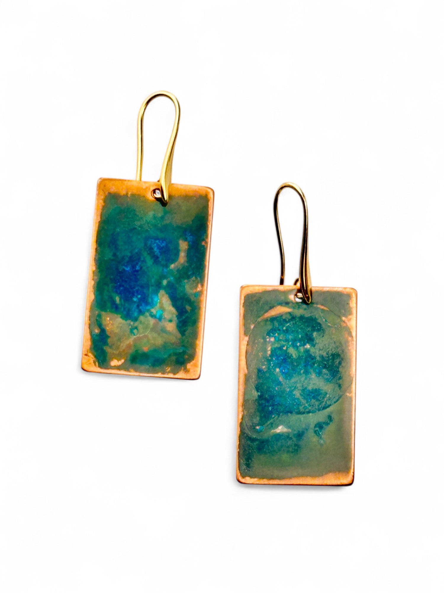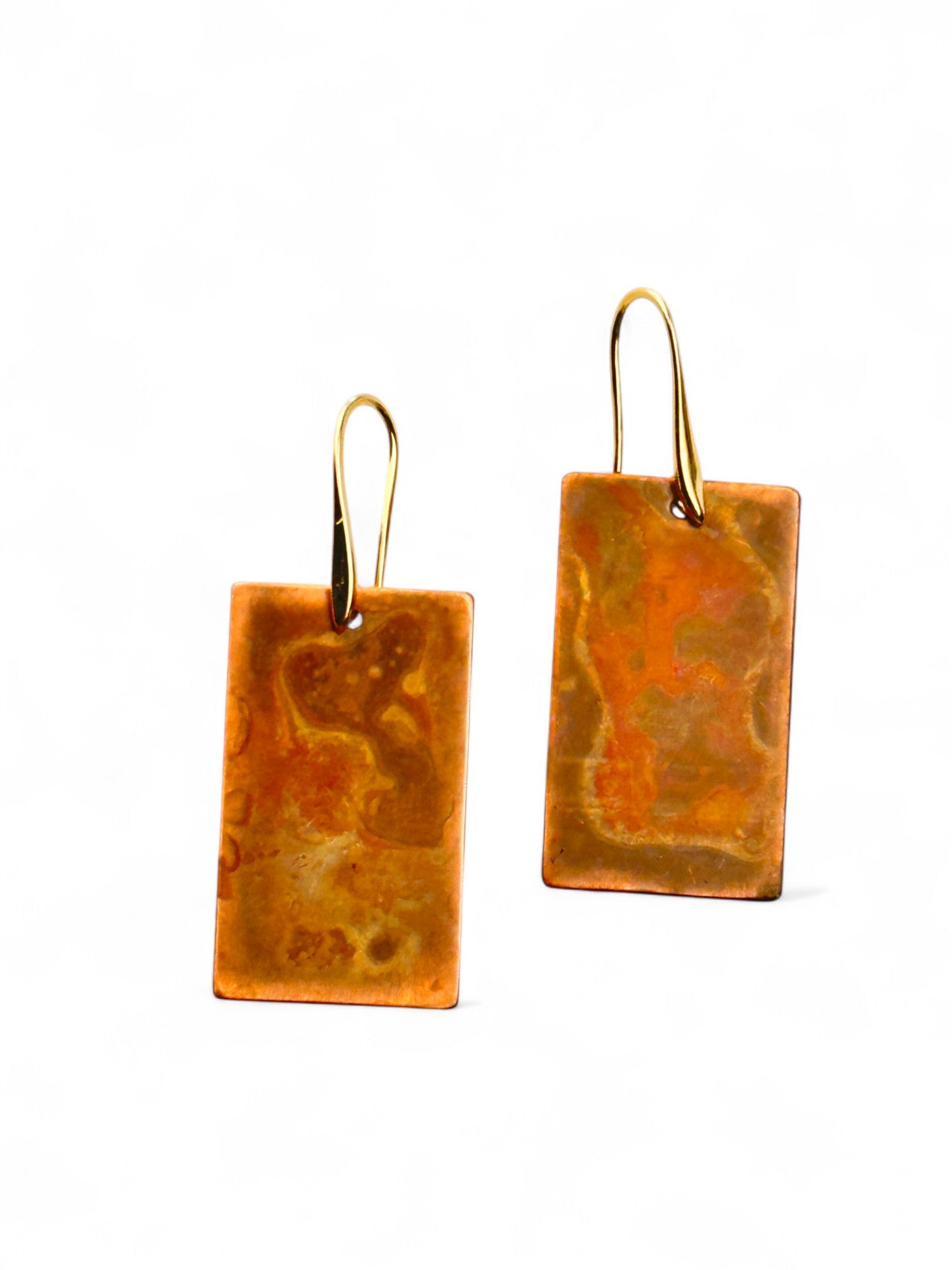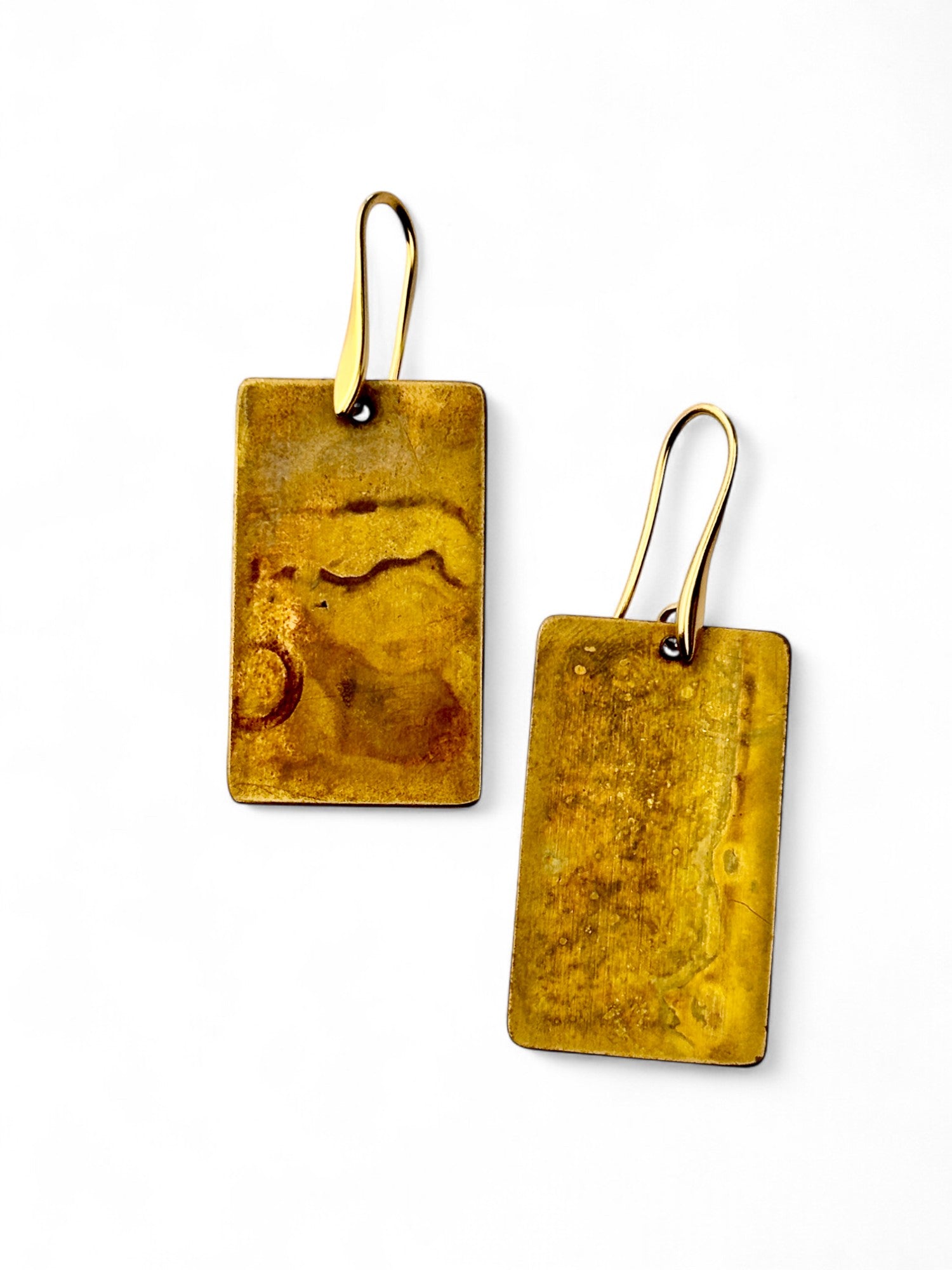 Os brincos Tribu Rectangle, são cortados e oxidados manualmente. Gancho aberto com banho de ouro.