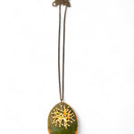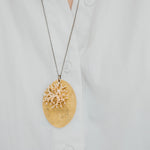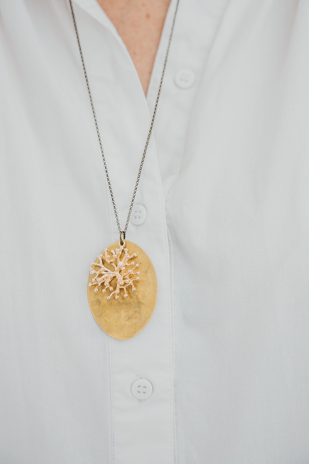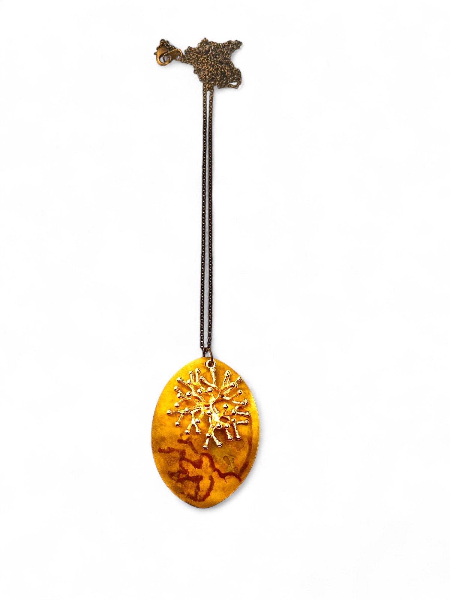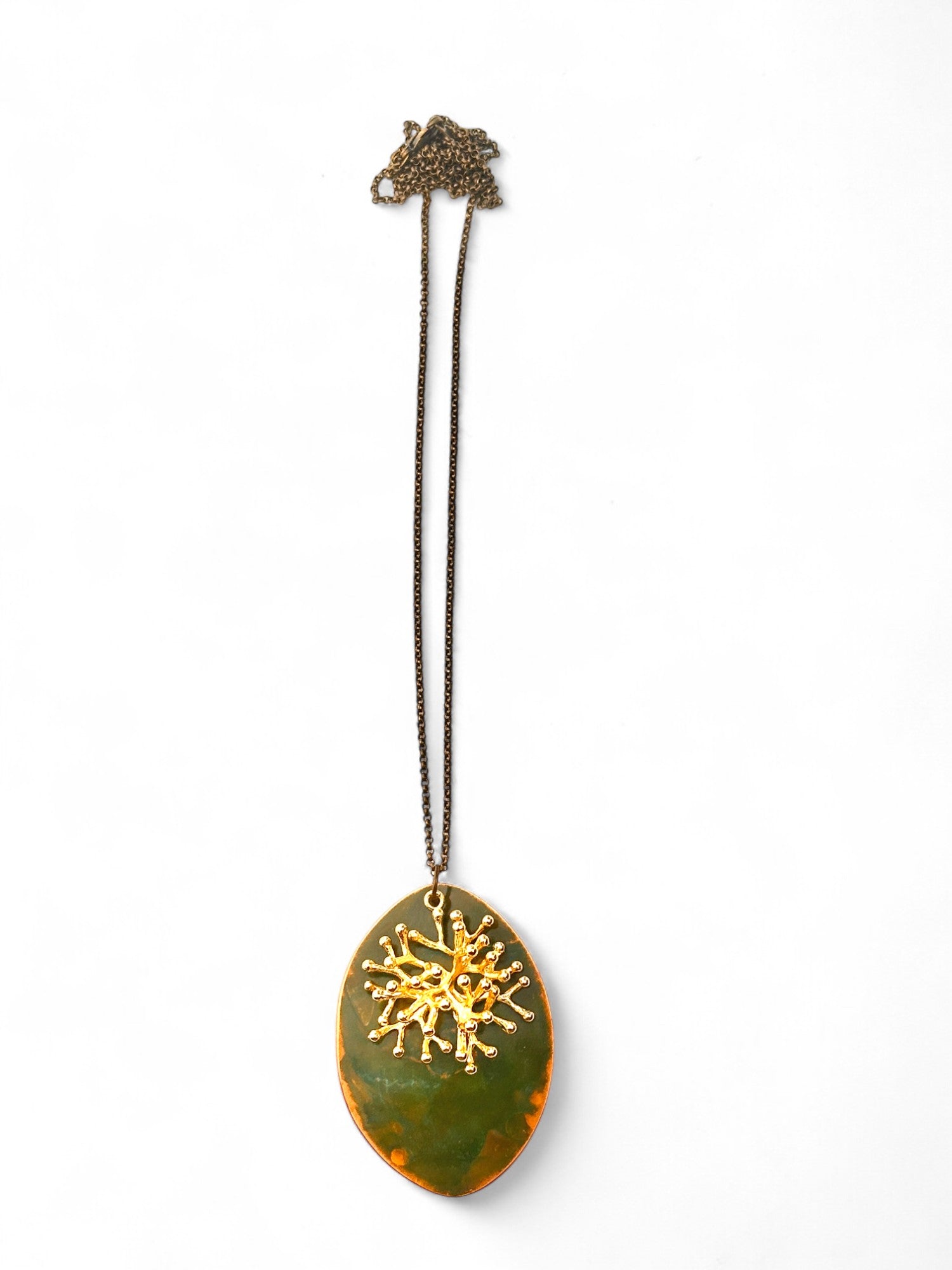 Colar inspirado em corais marinhos. Alongado, oxidado, com pendente orgânico com banho de ouro e corrente de latão com 70cm