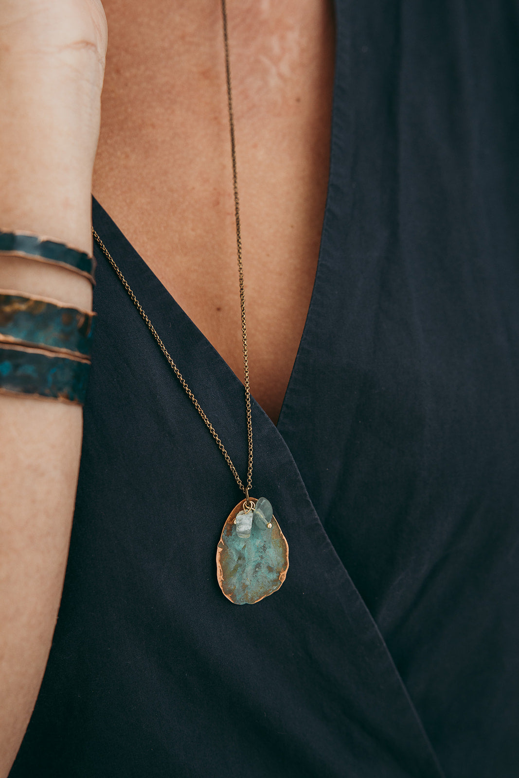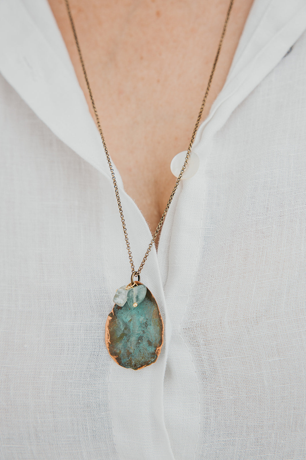 Colar Jacarandá médio, com pedras naturais. Cortado manualmente, martelado e oxidado e com corrente de 70cm.