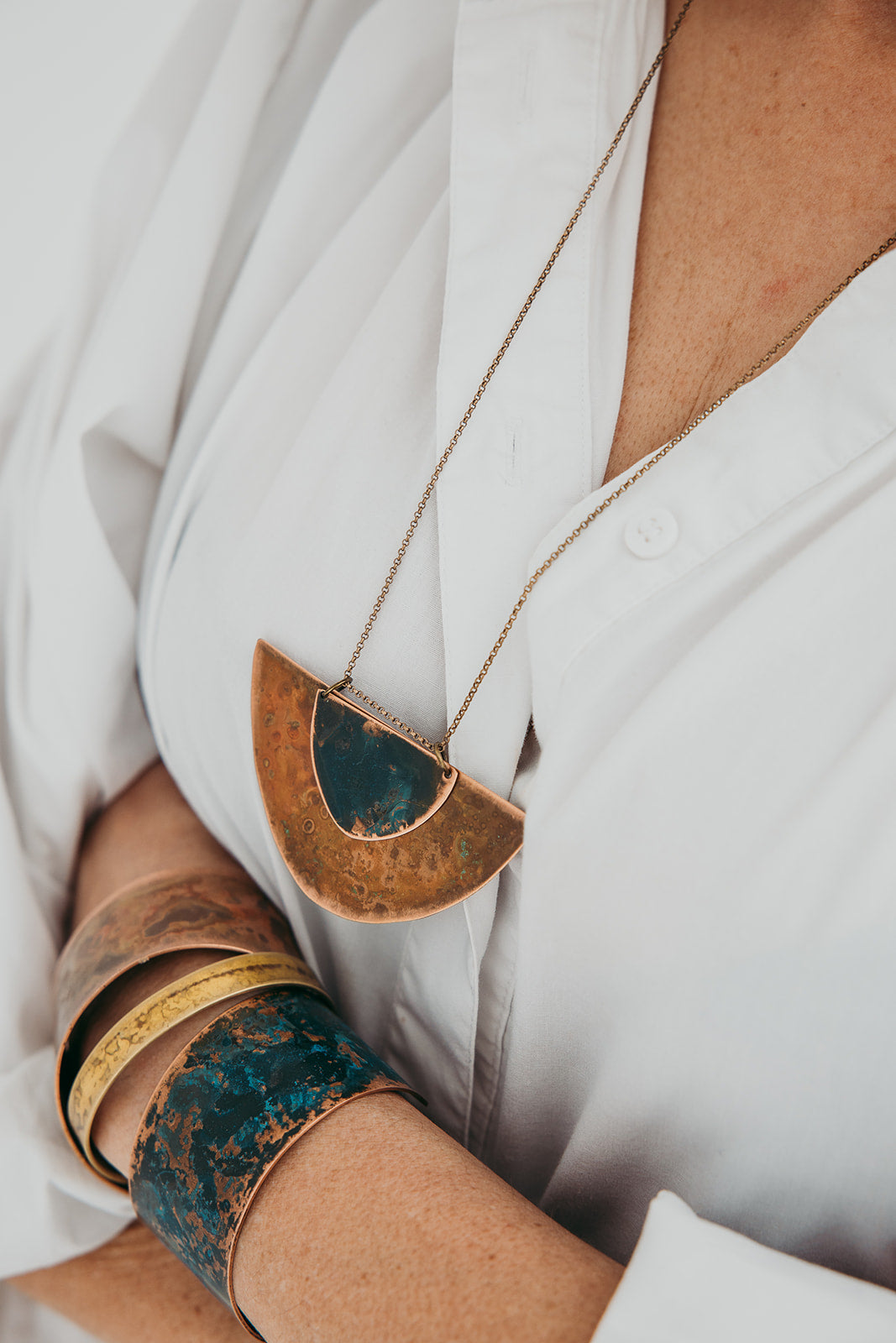 A imagem principal do produto mostra a peça disponível para compra, mas procuramos sempre incluir uma fotografia de contexto, com a peça usada por uma modelo ou em cenário. Essa foto pode não corresponder exatamente à peça que que receberá, podendo ser de outro metal ou de uma tonalidade diferente de oxidação; serve apenas como exemplo de como a peça fica no uso.