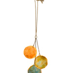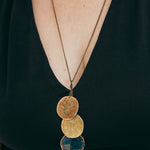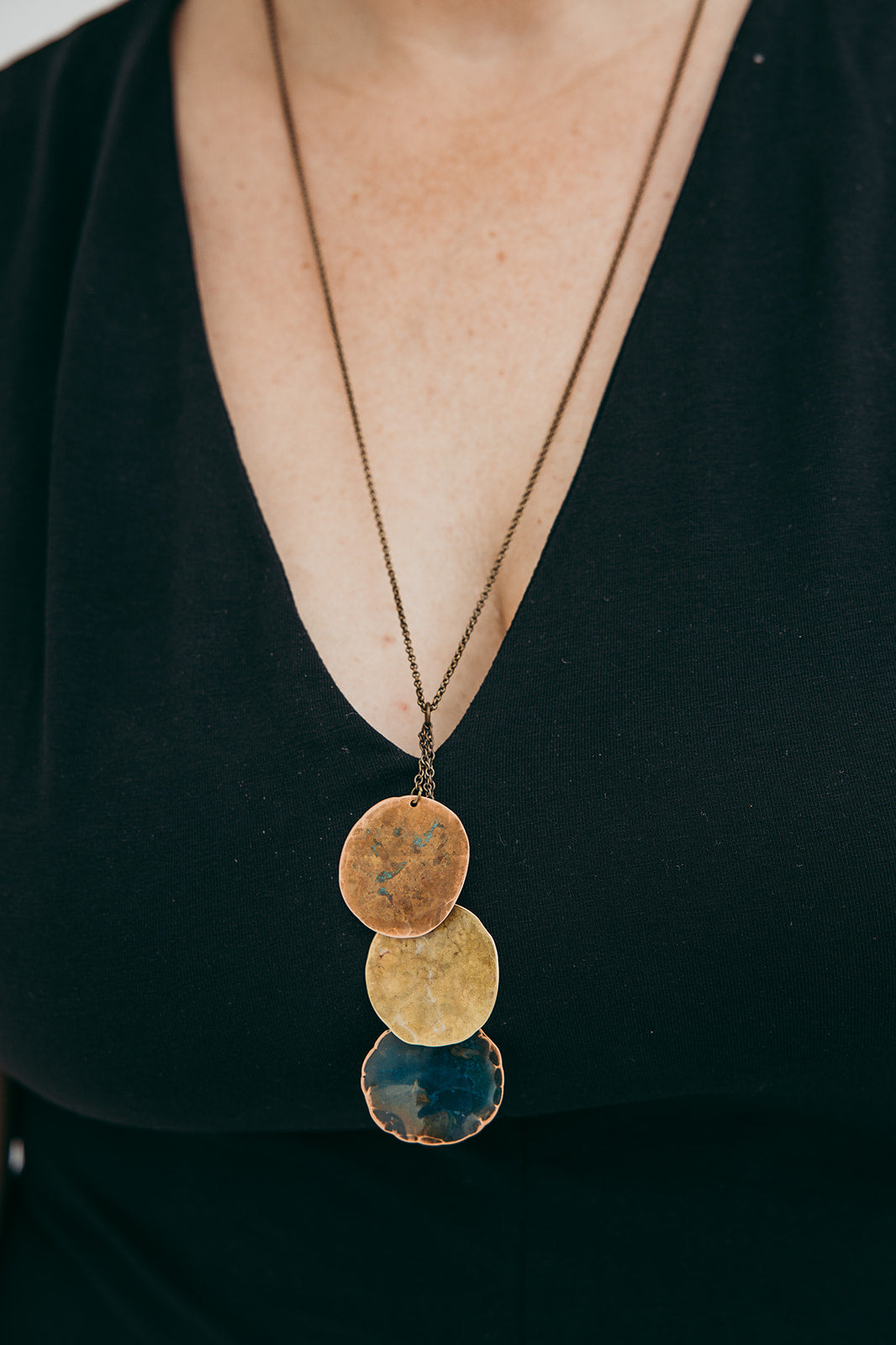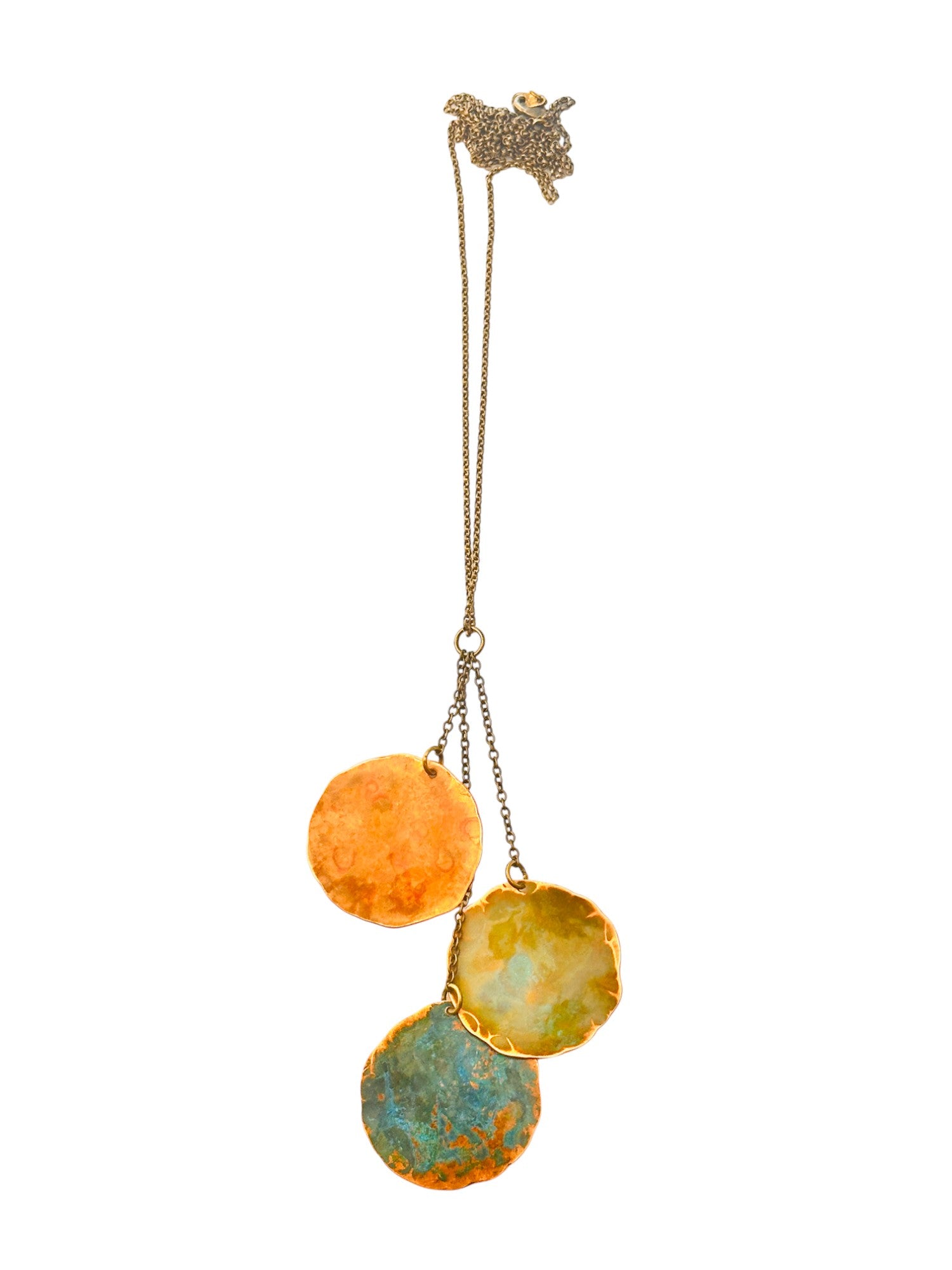 Colar com 3 discos martelados e oxidados, de cores variadas, com corrente de 70cm e extensões de tamanhos variados