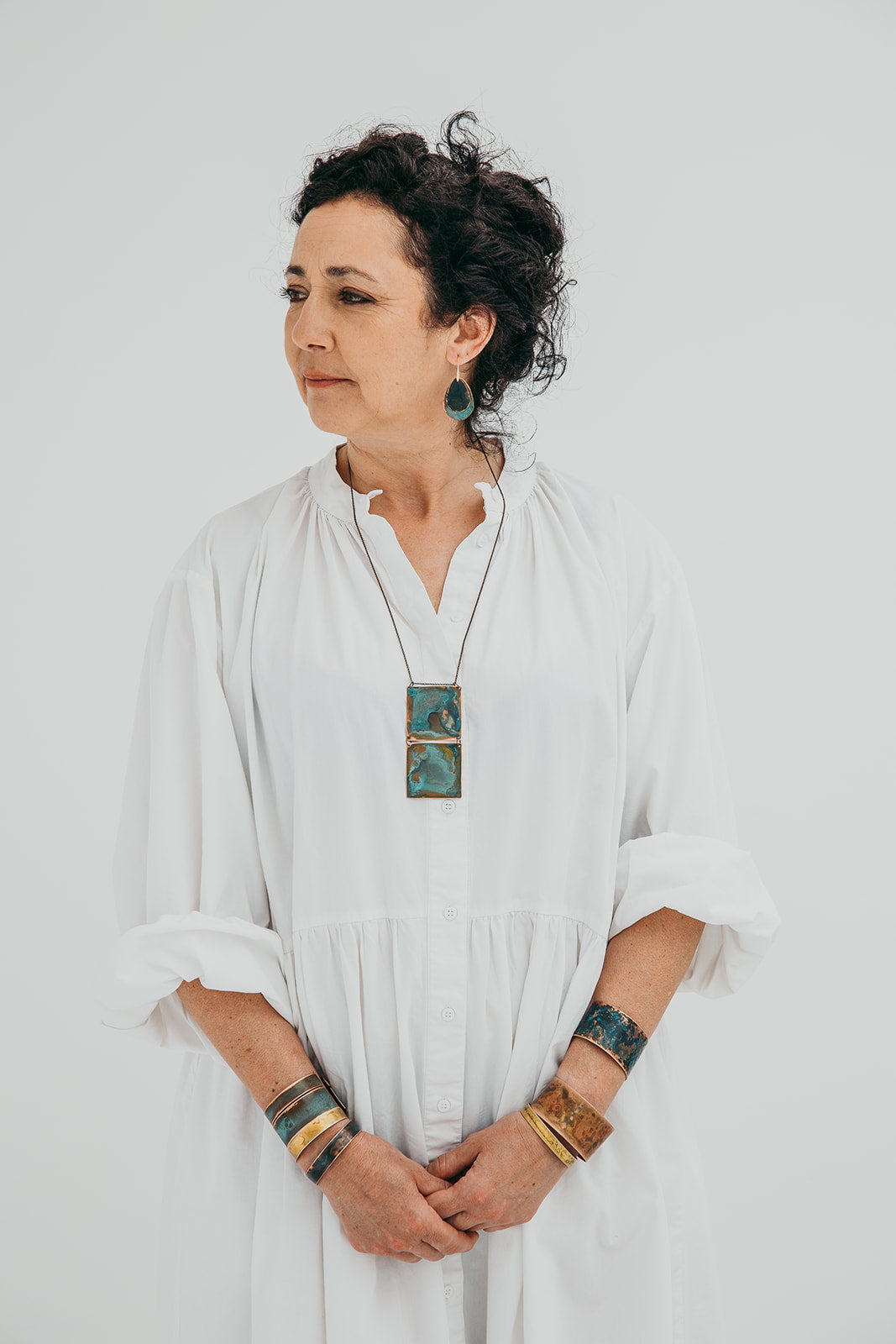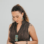 A imagem principal do produto mostra a peça disponível para compra, mas procuramos sempre incluir uma fotografia de contexto, com a peça usada por uma modelo ou em cenário. Essa foto pode não corresponder exatamente à peça que que receberá, podendo ser de outro metal ou de uma tonalidade diferente de oxidação; serve apenas como exemplo de como a peça fica no uso.