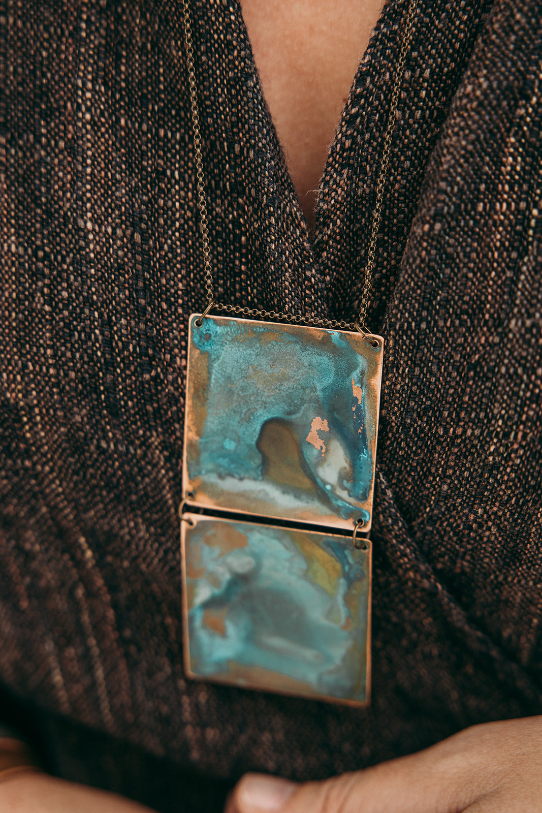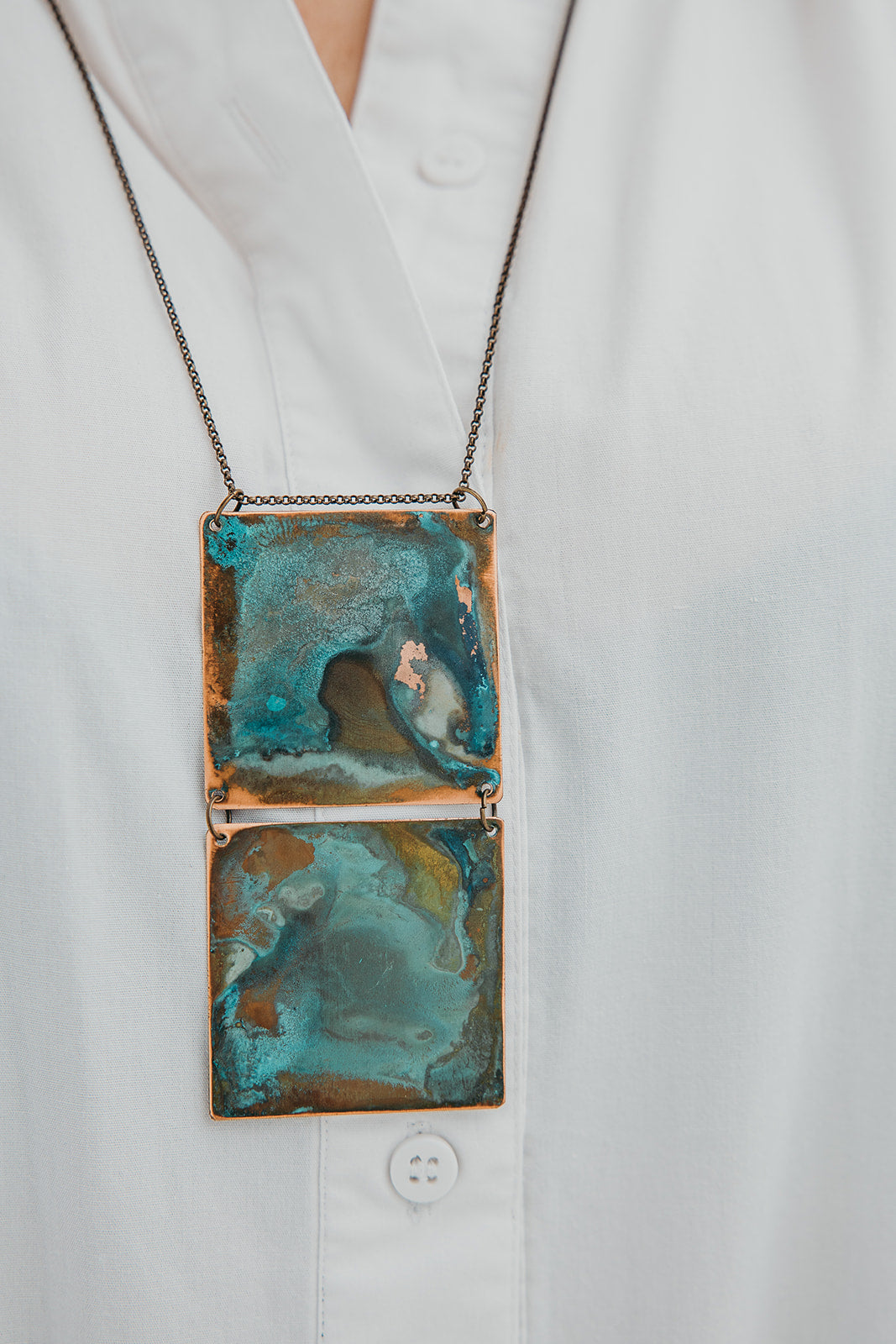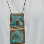 Colar Tribu Square. Oxidado originando tonalidades e manchas variadas. Corrente de latão com 70 cm de comprimento