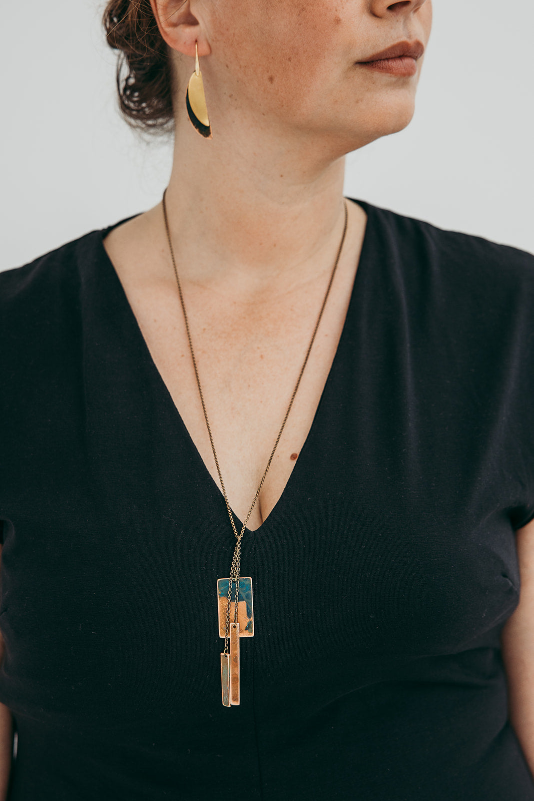A imagem principal do produto mostra a peça disponível para compra, mas procuramos sempre incluir uma fotografia de contexto, com a peça usada por uma modelo ou em cenário. Essa foto pode não corresponder exatamente à peça que que receberá, podendo ser de outro metal ou de uma tonalidade diferente de oxidação; serve apenas como exemplo de como a peça fica no uso.