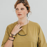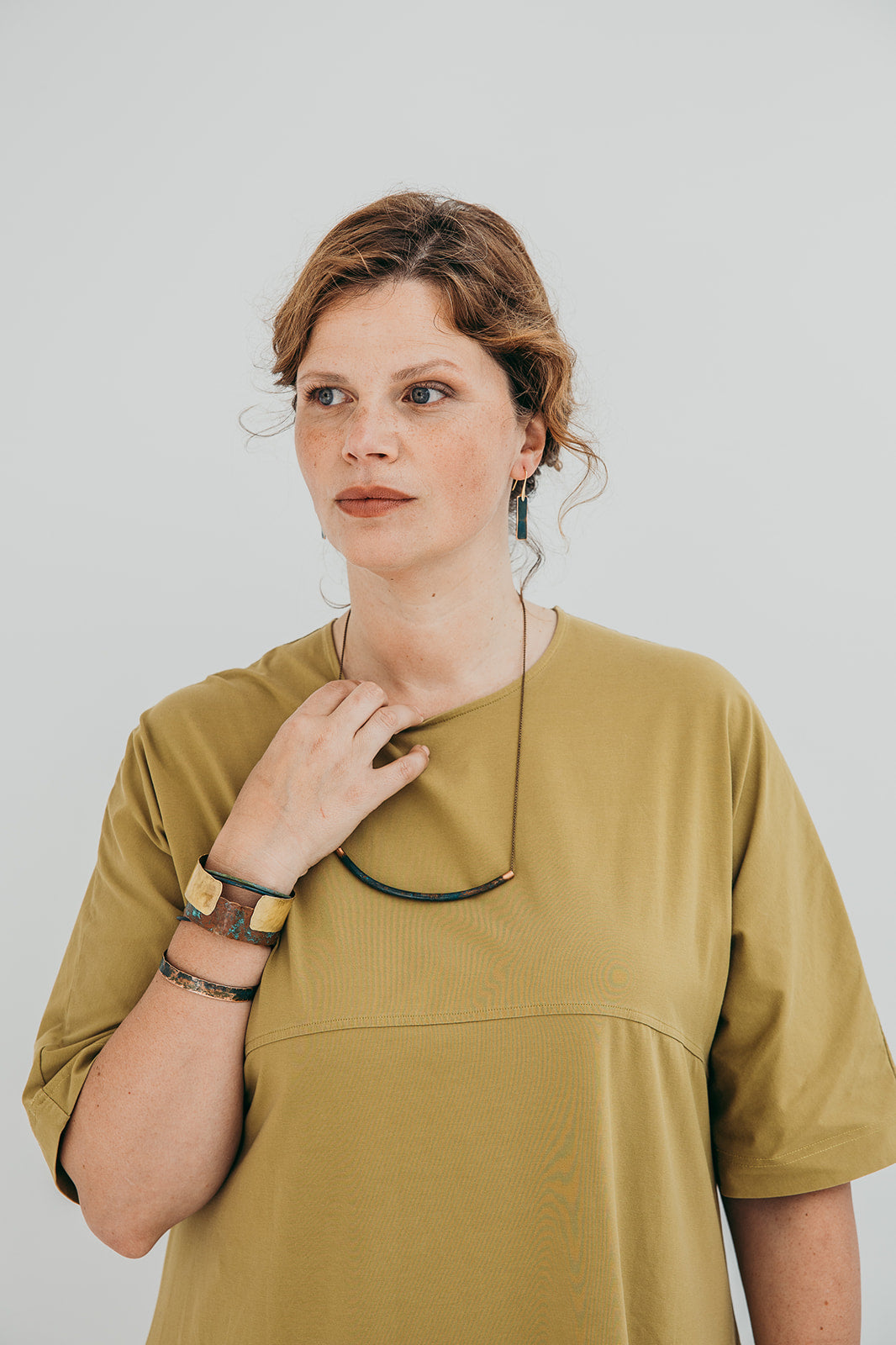 A imagem principal do produto mostra a peça disponível para compra, mas procuramos sempre incluir uma fotografia de contexto, com a peça usada por uma modelo ou em cenário. Essa foto pode não corresponder exatamente à peça que que receberá, podendo ser de outro metal ou de uma tonalidade diferente de oxidação; serve apenas como exemplo de como a peça fica no uso.