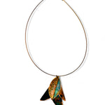 Gargantilha Lotus. Cada peça é única com combinações de cores variadas. Cortado manualmente, martelado e oxidado, cabo de aço e fecho magnético